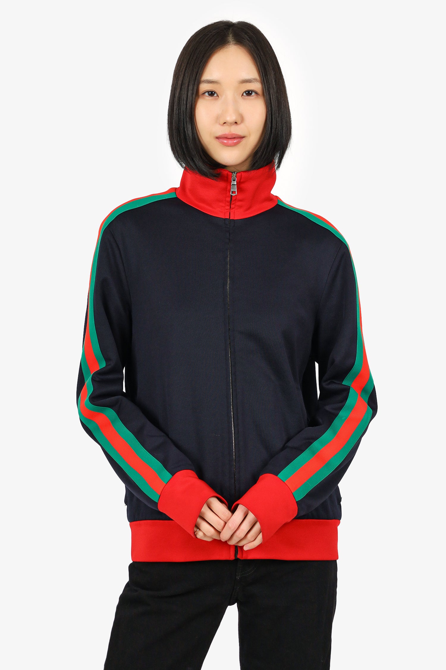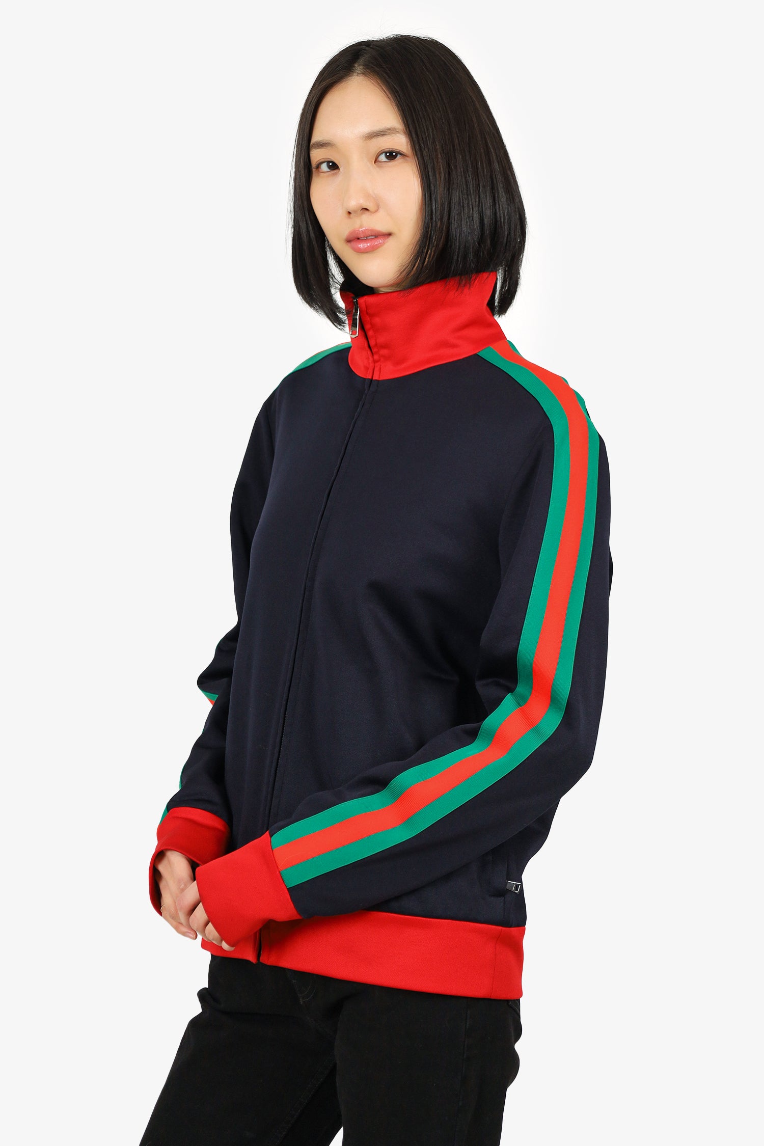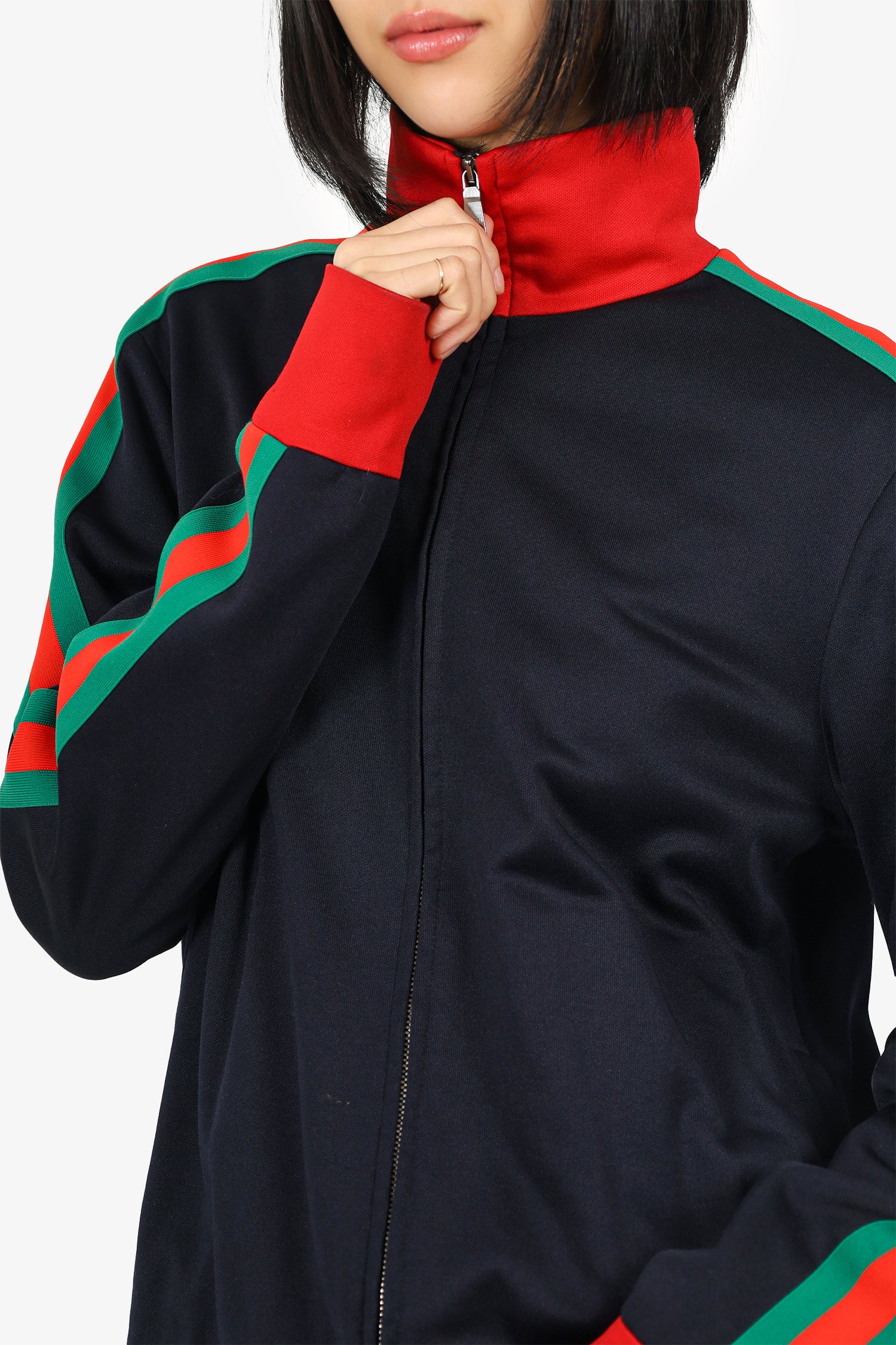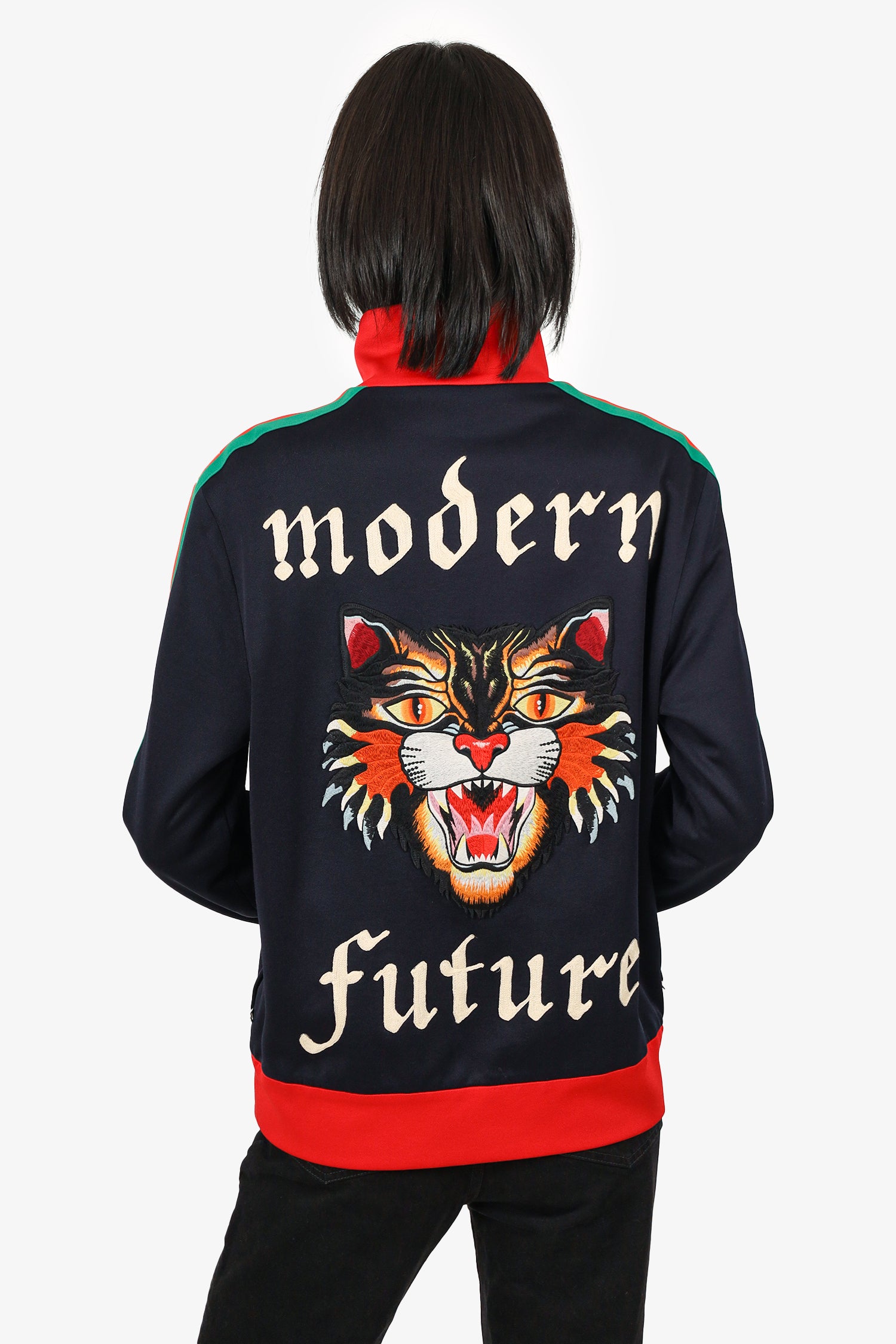 Refresh availabilityGucci Black Modern Future Angry Cat Jacket. Front zip closure. 2 front exterior side zip pocket. Embroidered graphic on back. Silver-tone hardware. Tonal stitching.