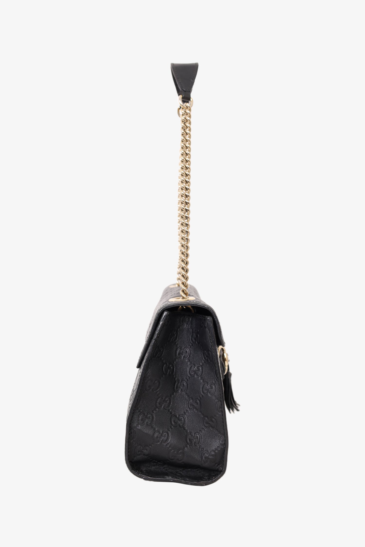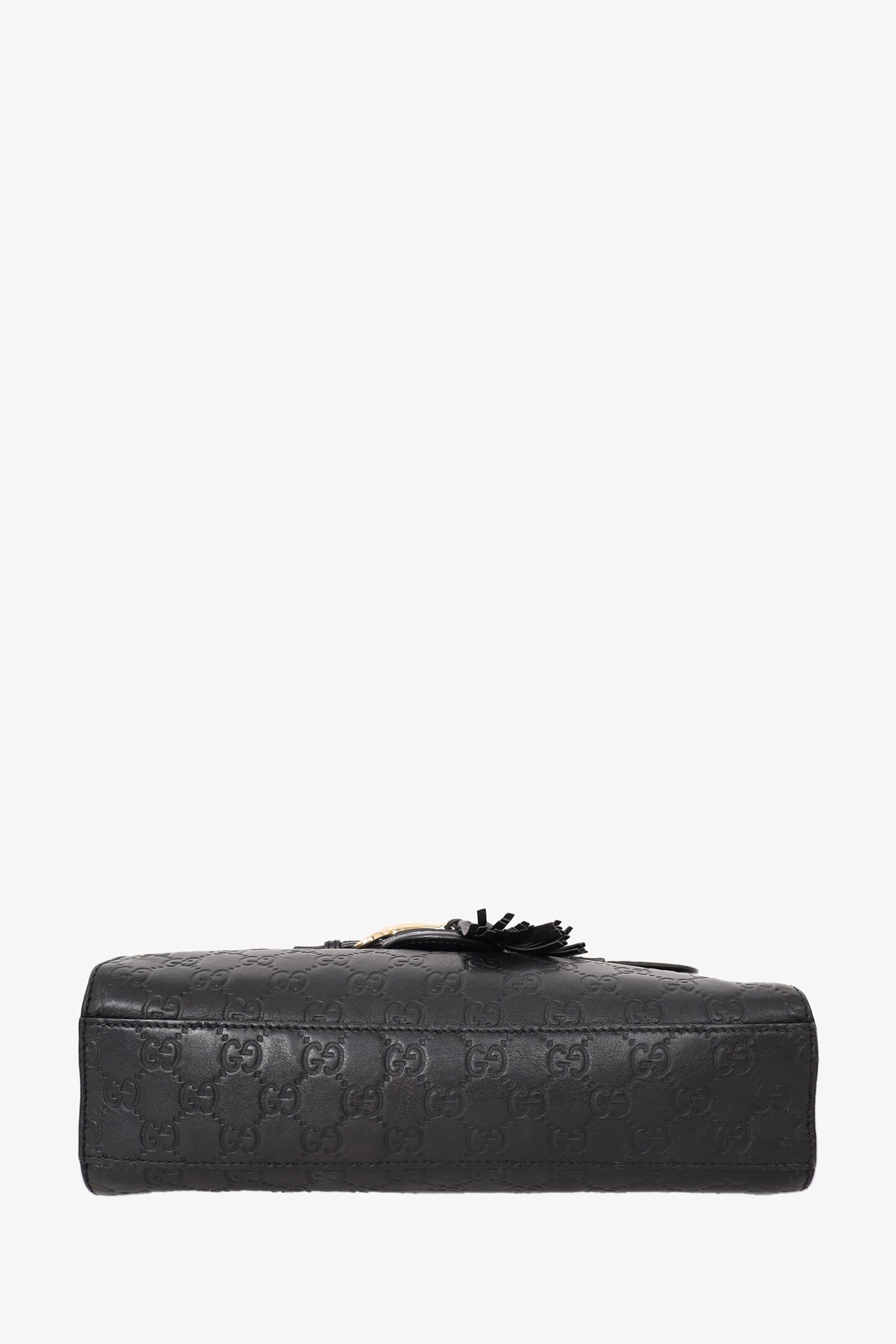 Refresh availabilityGucci Black Monogram Guccissima Horsebit Crossbody. Metalic Strap with leather. Front flap closure. Leather tassle & hardware detailing. 3 internal open pockets. Silver-toned hardware. Tonal stitching.