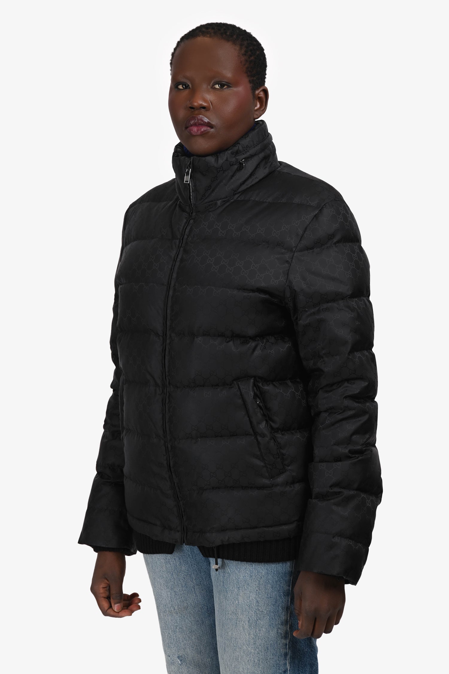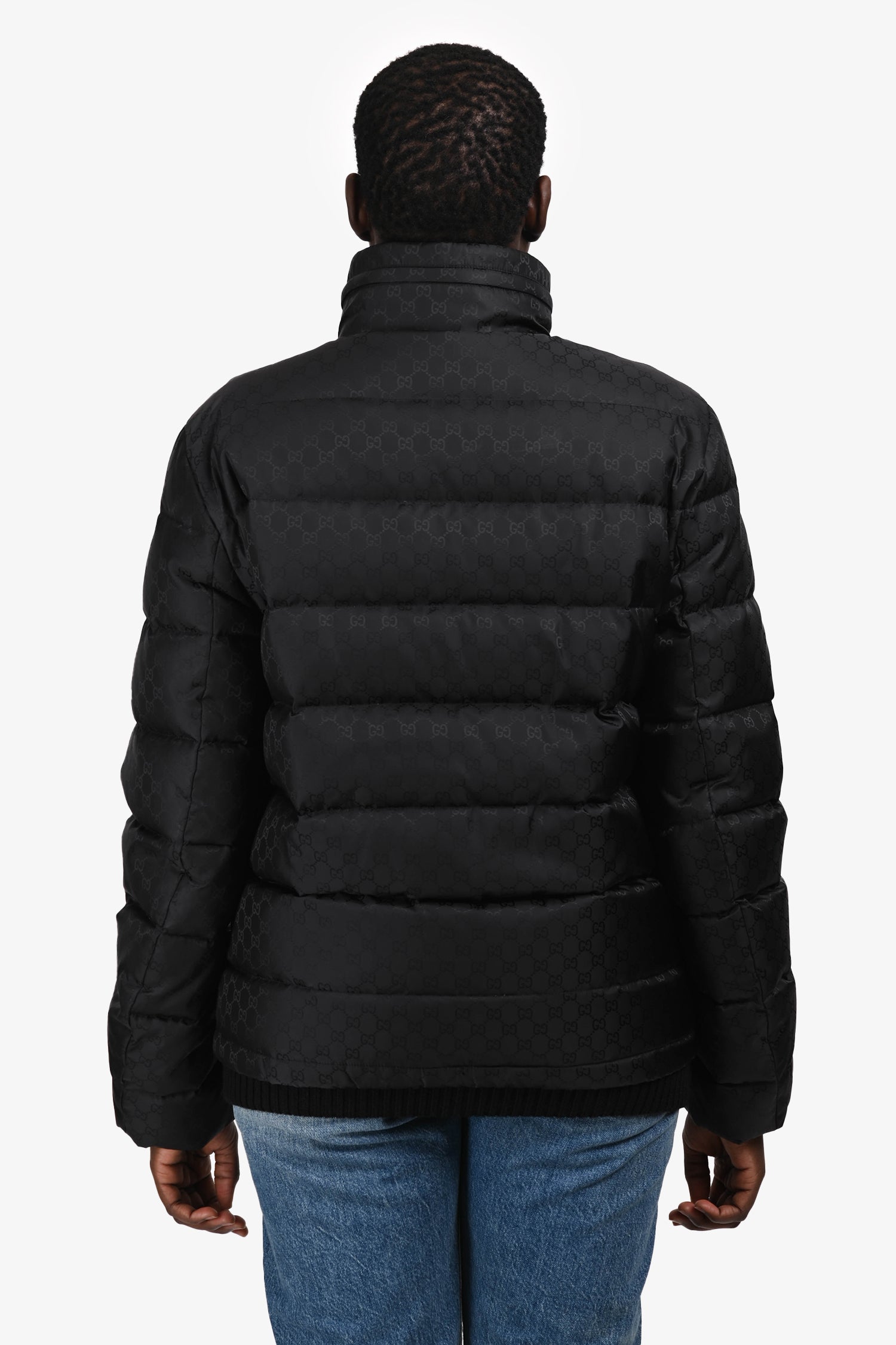 Refresh availabilityGucci Black Nylon Supreme GG Web Detail Puffer Jacket. Pull-on. Front zip closure. Concealed hood compartment with zip closure. 2 front zip pockets. Sleeved, ribbed cuffs. Lined interior. Silver-tone hardware. Tonal stitching.