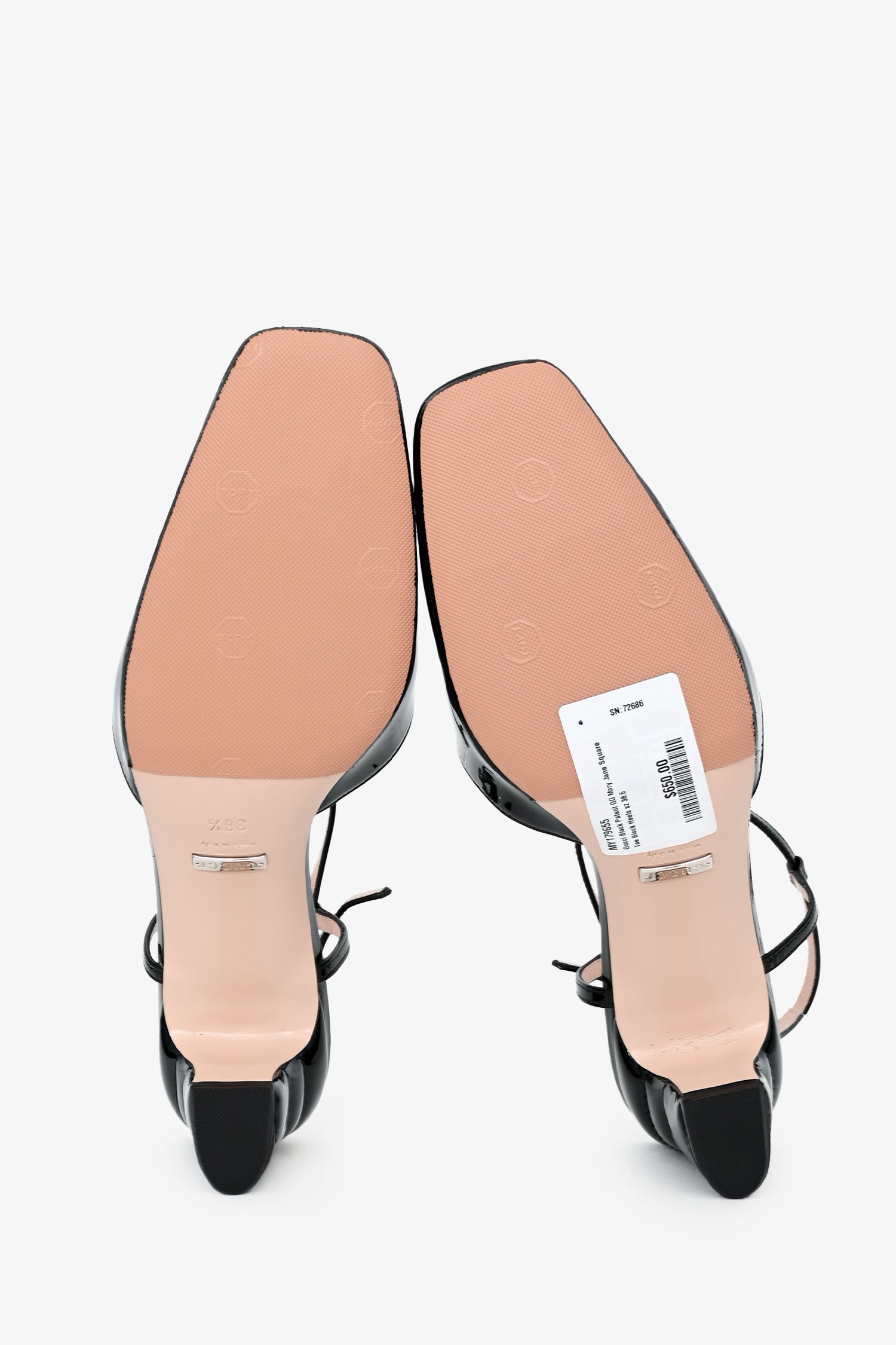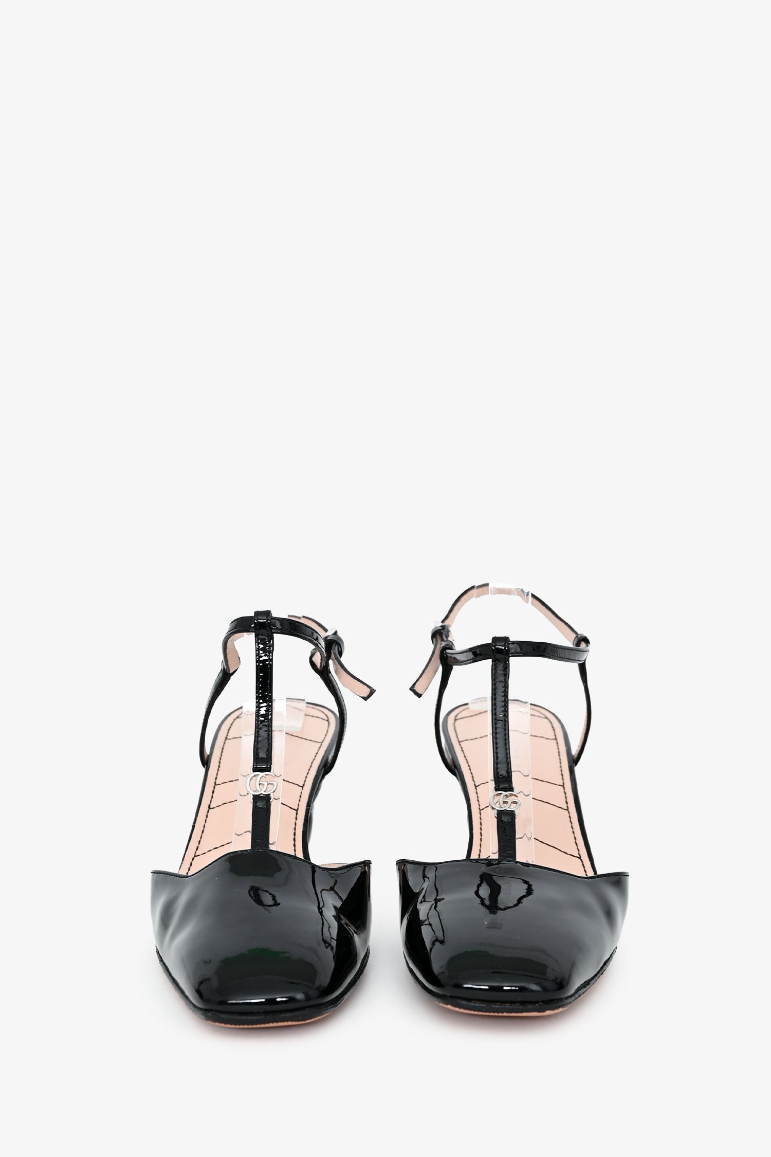 Refresh availabilityGucci Black Patent GG Mary Jane Square Toe Block Heels. Slip-on with buckle strap. Square toe. Block heel. Leather lining and insole. Tonal stitching.