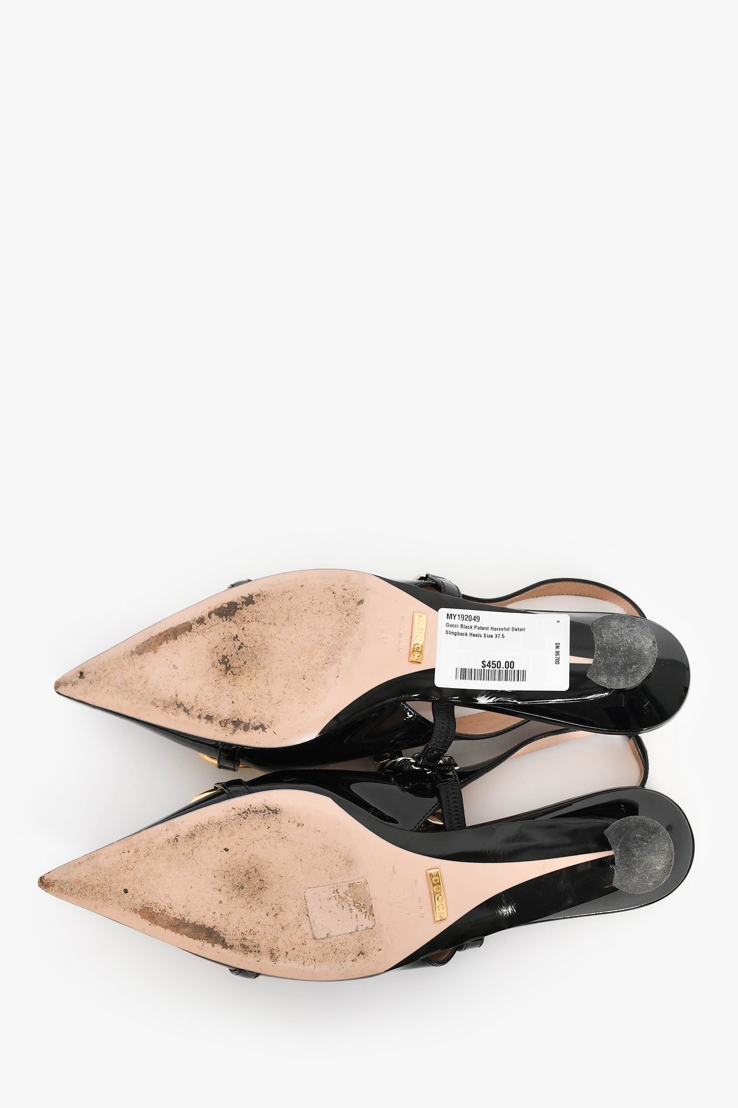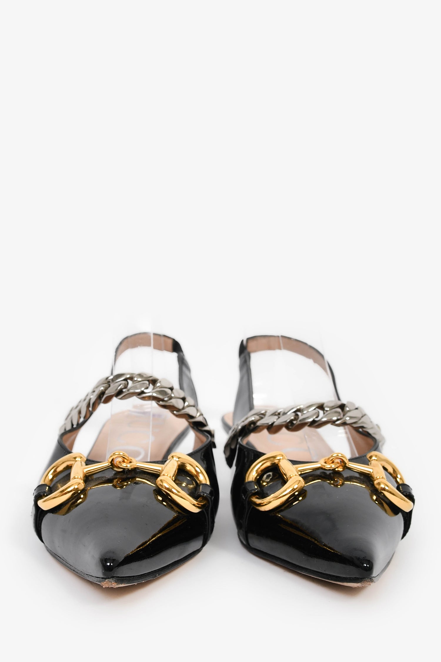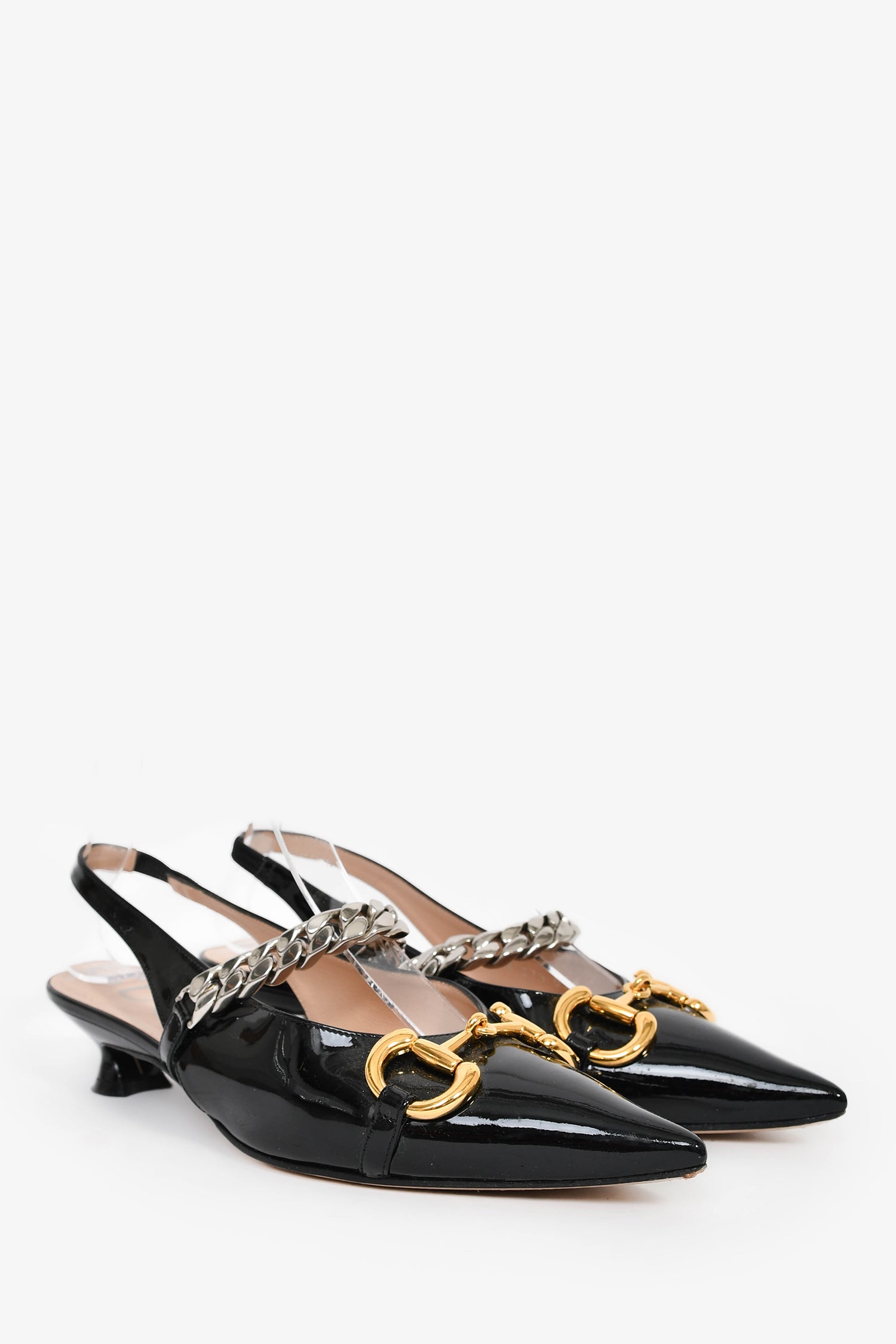 Refresh availabilityGucci Black Patent Horsebit Detail Slingback Heels. Pointed toe. Glossy finish. Gold and silver-tone hardware. Tonal stitching.