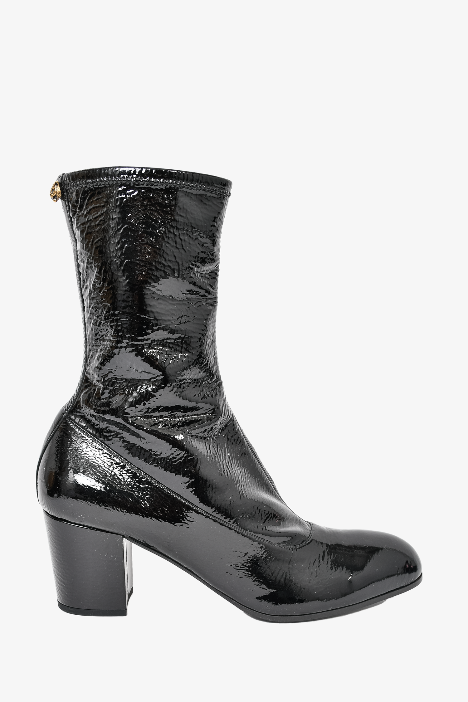 Refresh availabilityGucci Black Patent Leather Calf Boots. Side zip closure. Round toe. Gold-toned hardware. Tonal stitching.