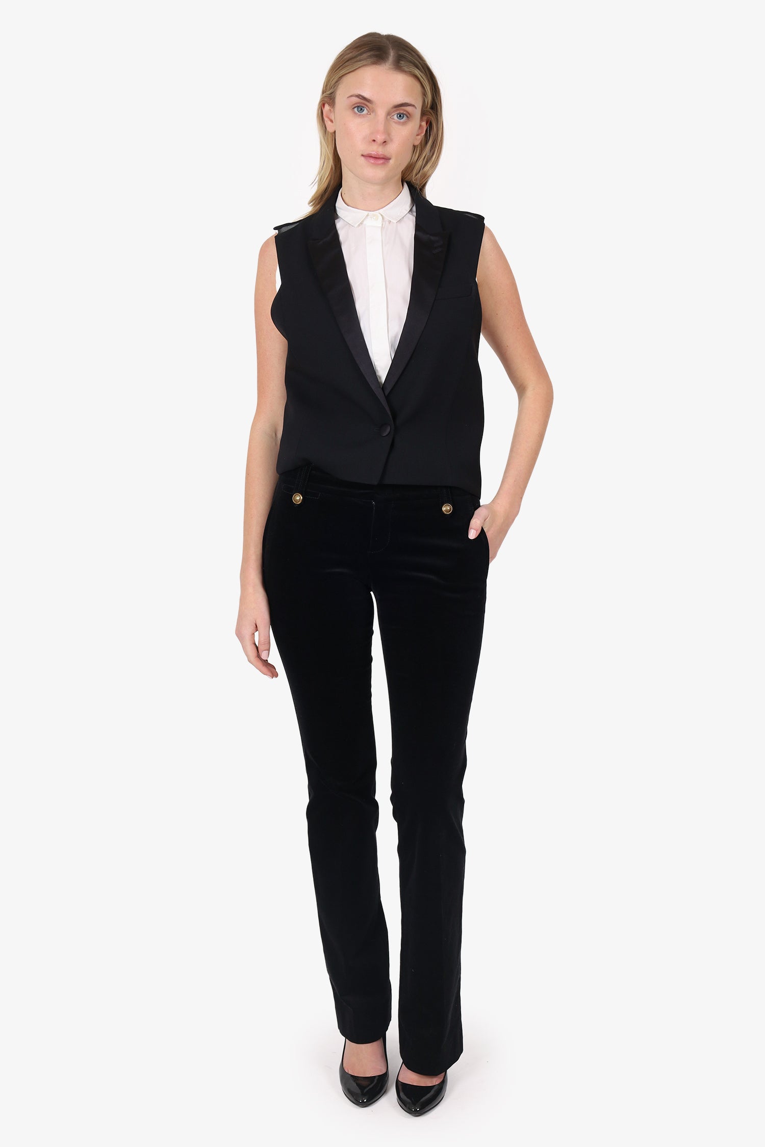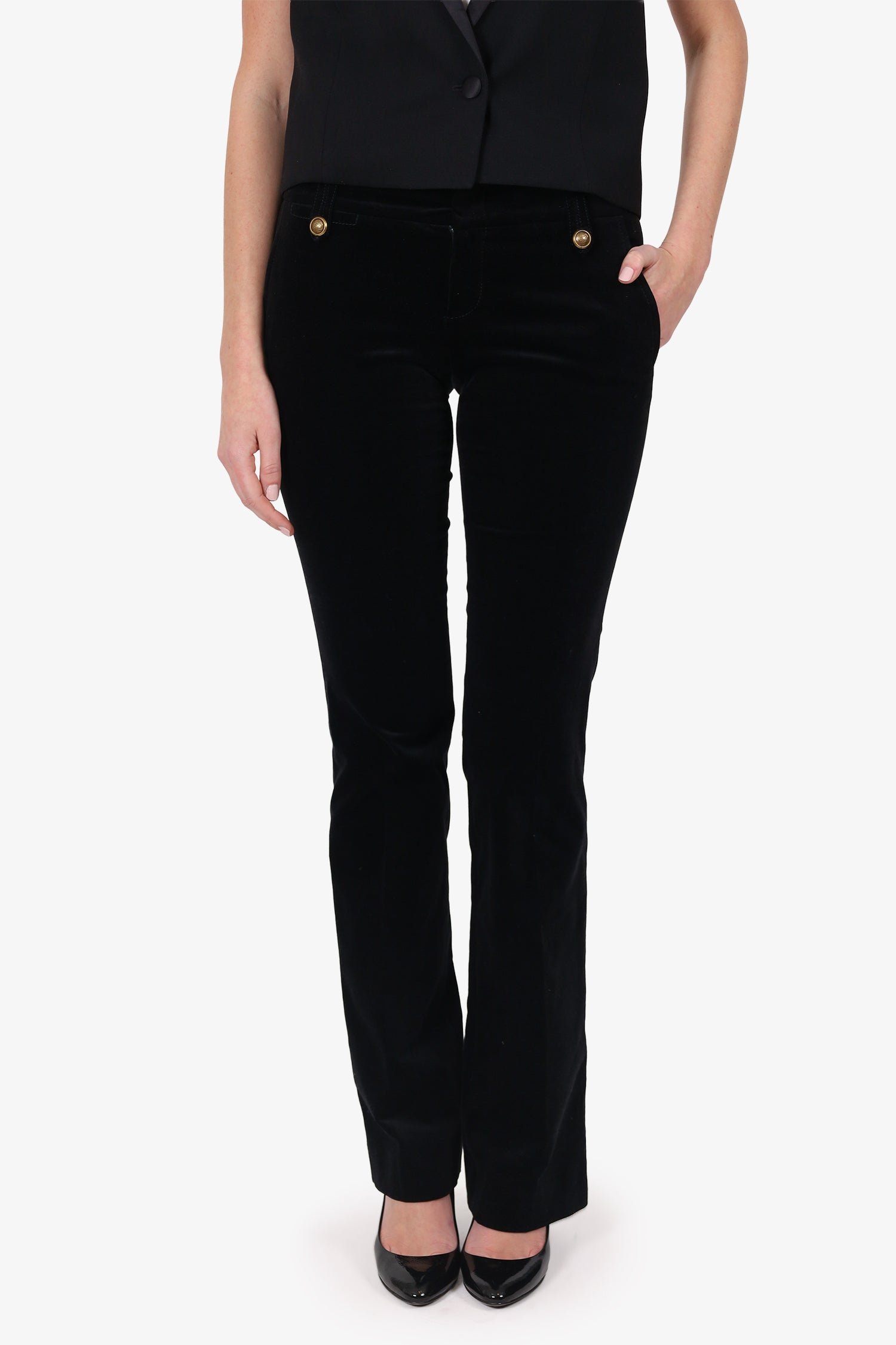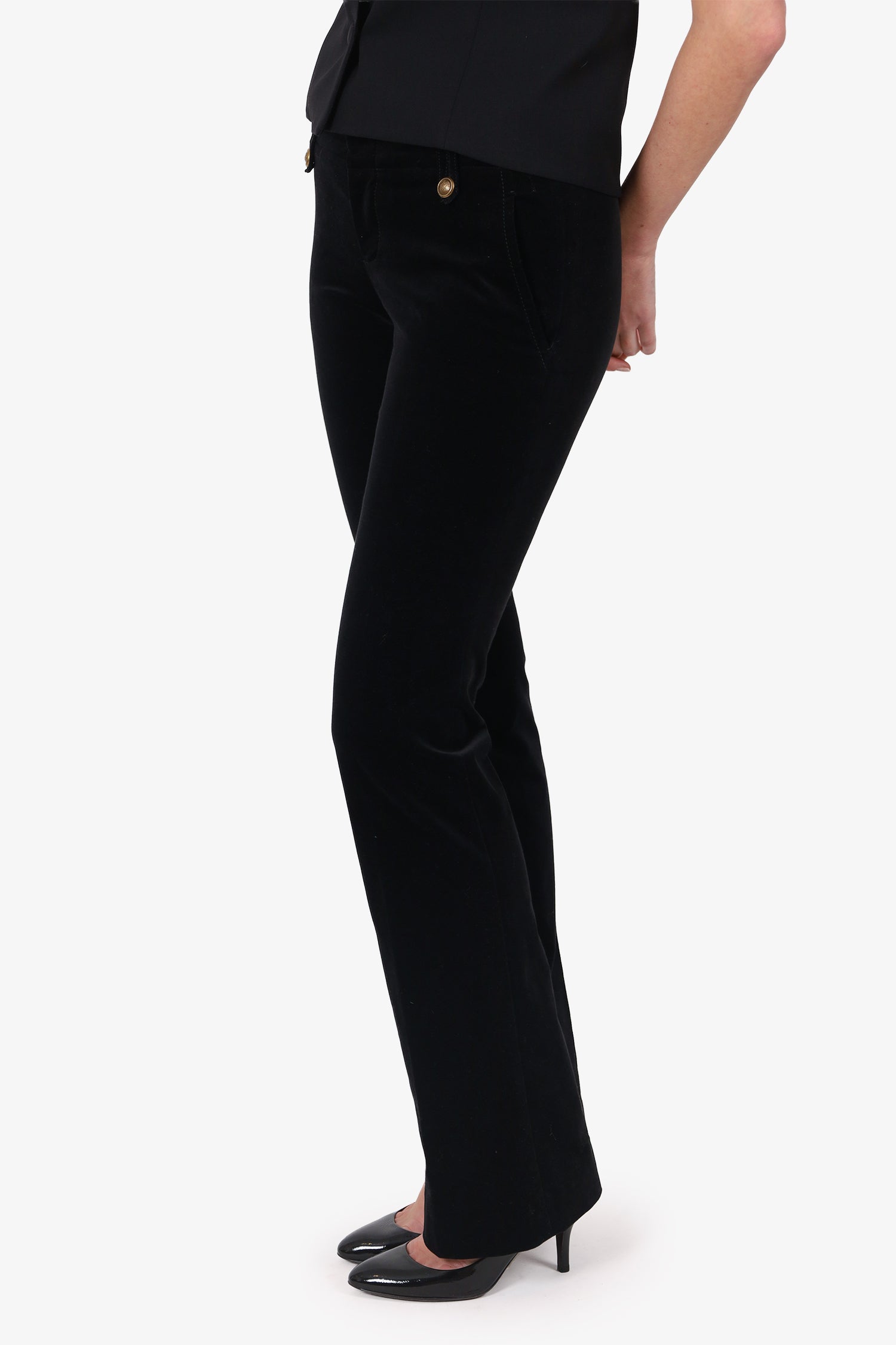 Refresh availabilityGucci Black Velvet Straight Leg Trousers. Slip-on. Front zip with button and hook-up closure. Waistband belt-loops with button-up closure. 2 exterior side slip pockets. Gold-tone hardware. Tonal stitching.