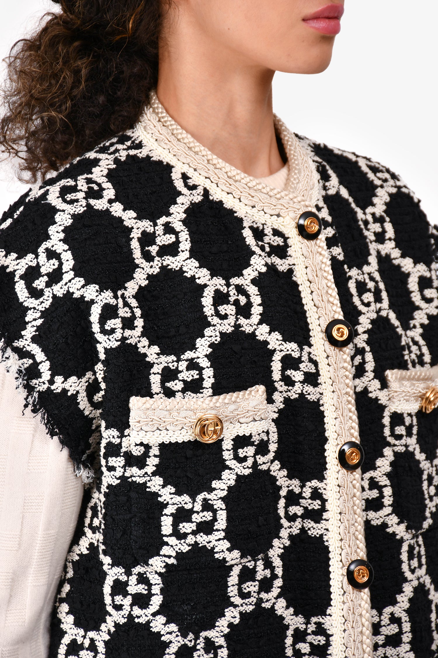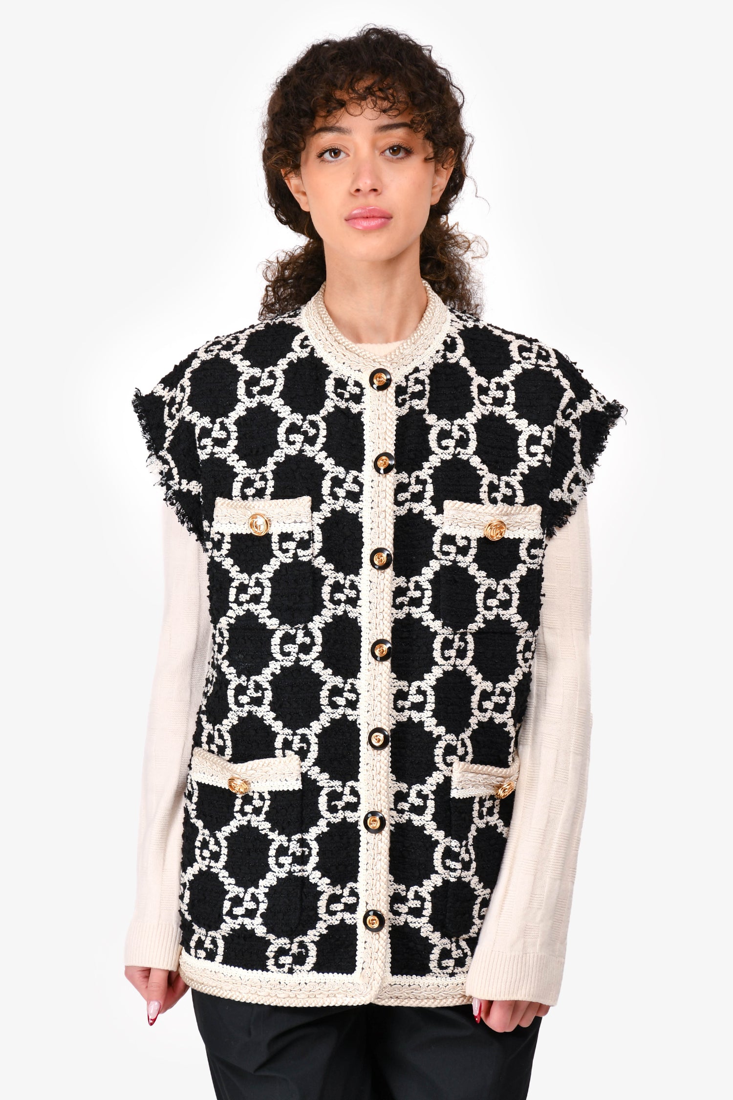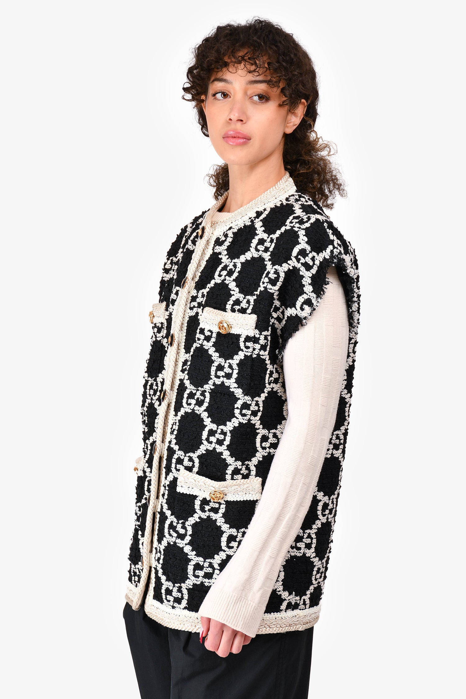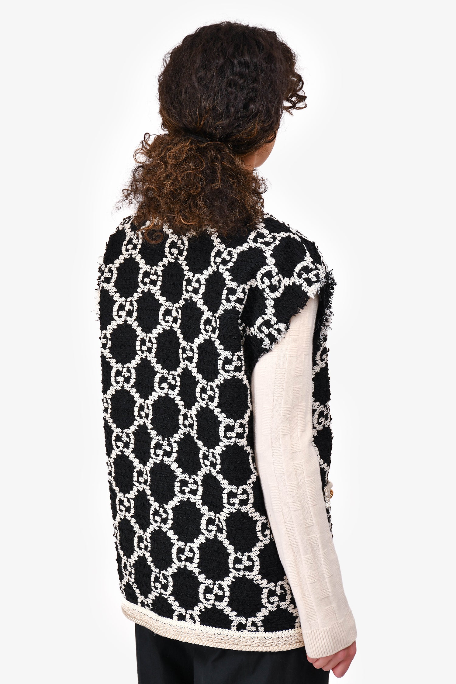 Refresh availabilityGucci Black/White GG Monogram Tweed Buttoned Vest Size 36. Braided and fringe trimming. Gold and black-tone hardware. Front snap closures. Four front slip pockets. Tonal stitching. Lined interior.