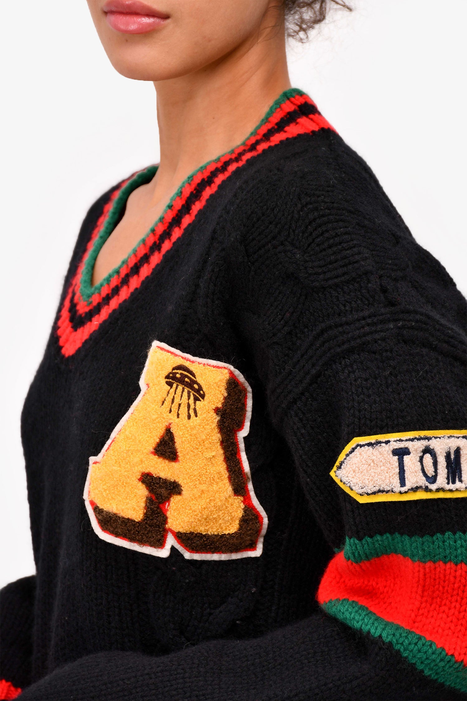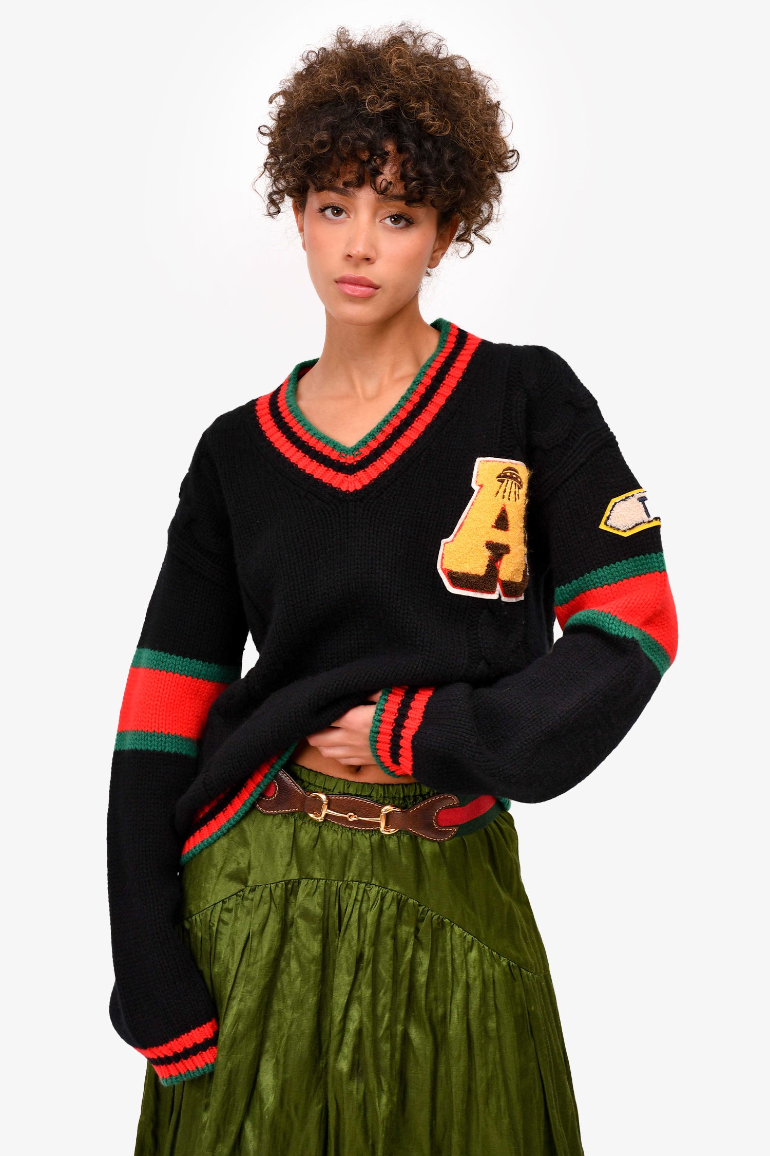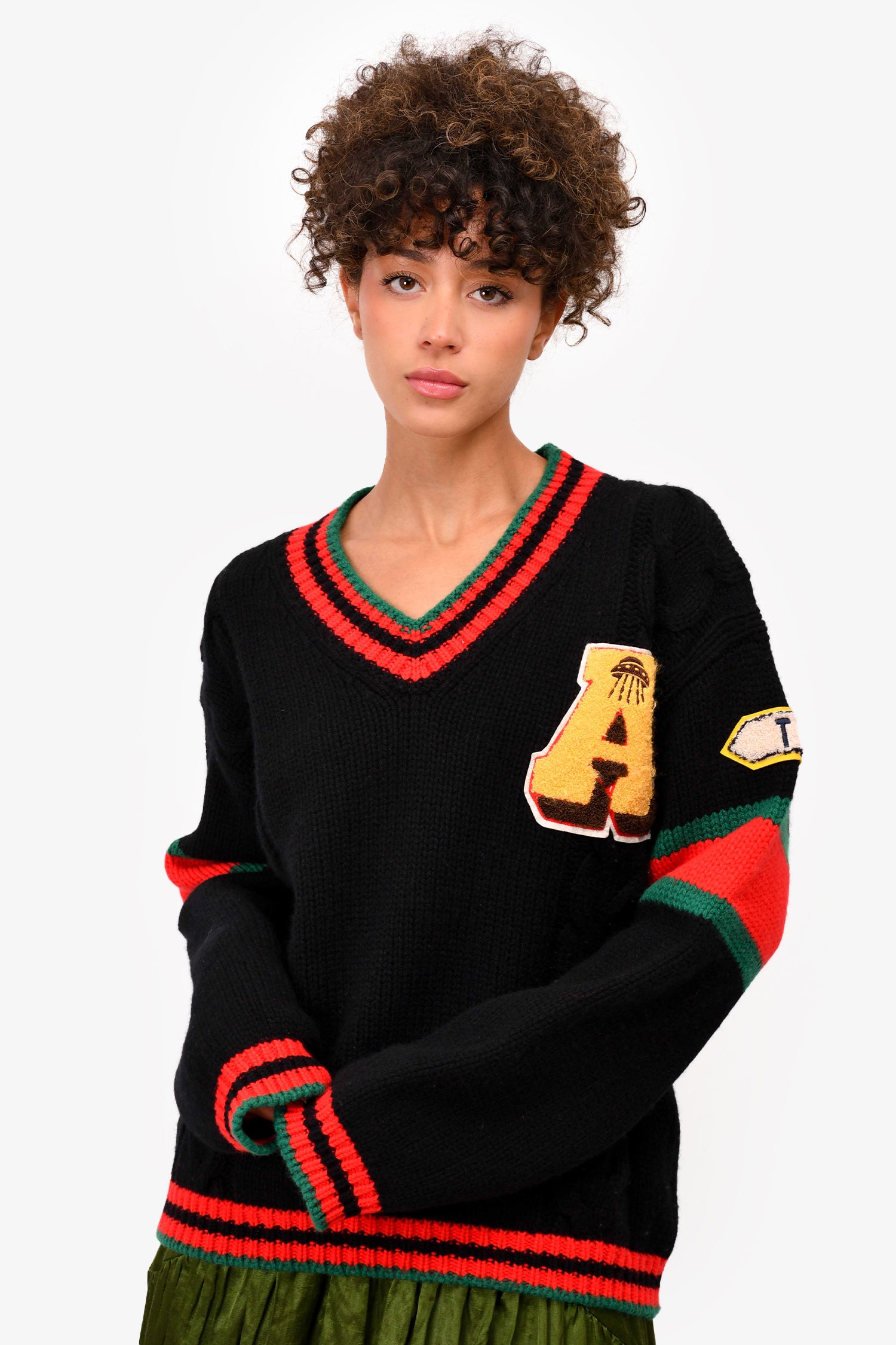 Gucci Black Wool Cable Knit Patchwork V-Neck Sweater. Pull-on. Patch detail at the front.