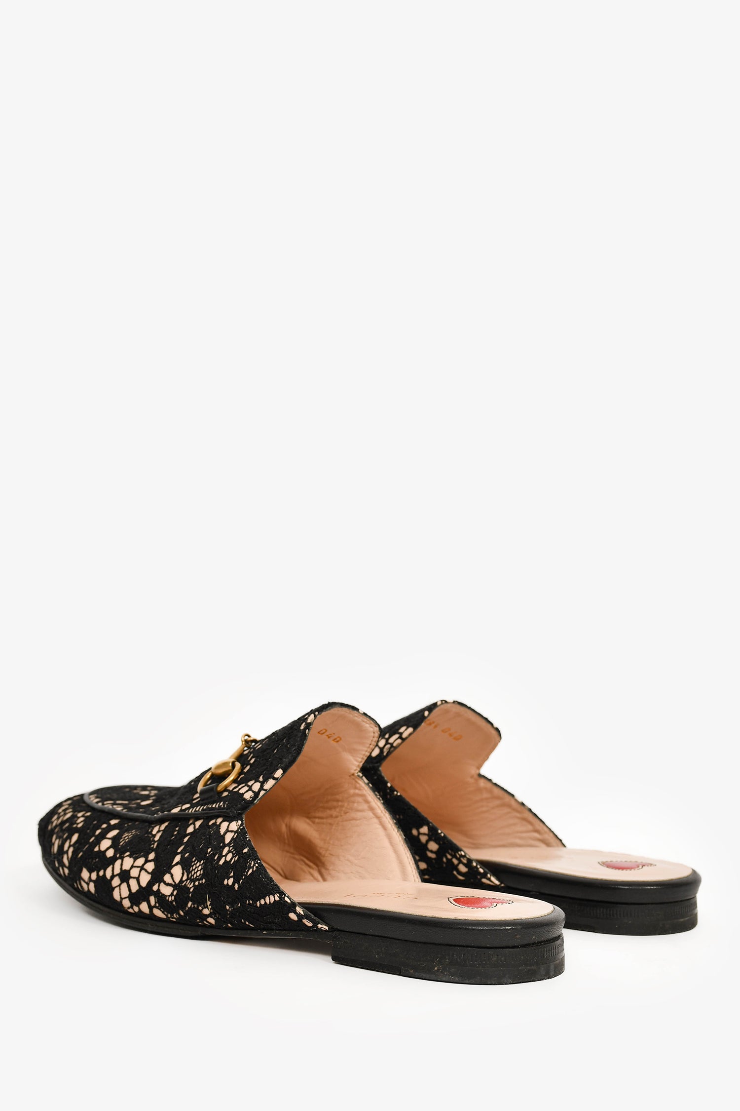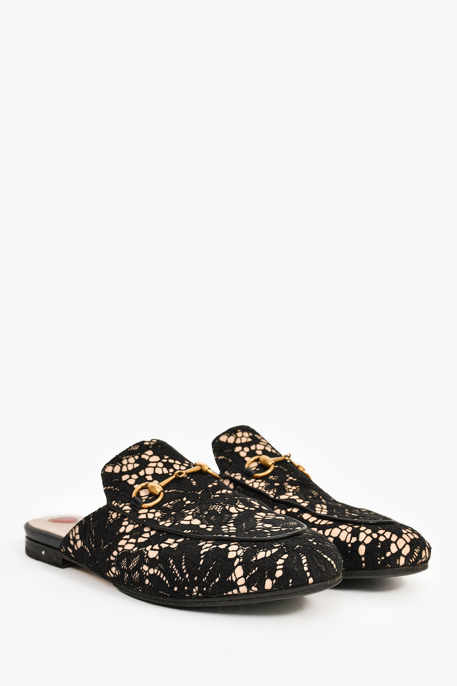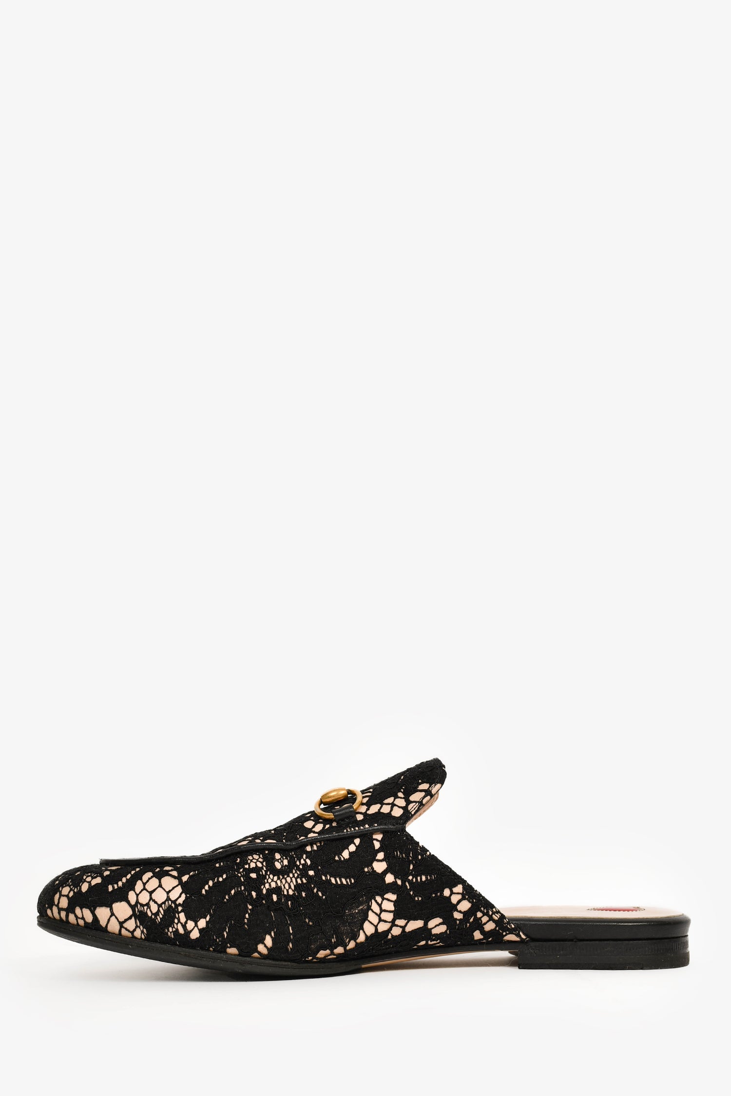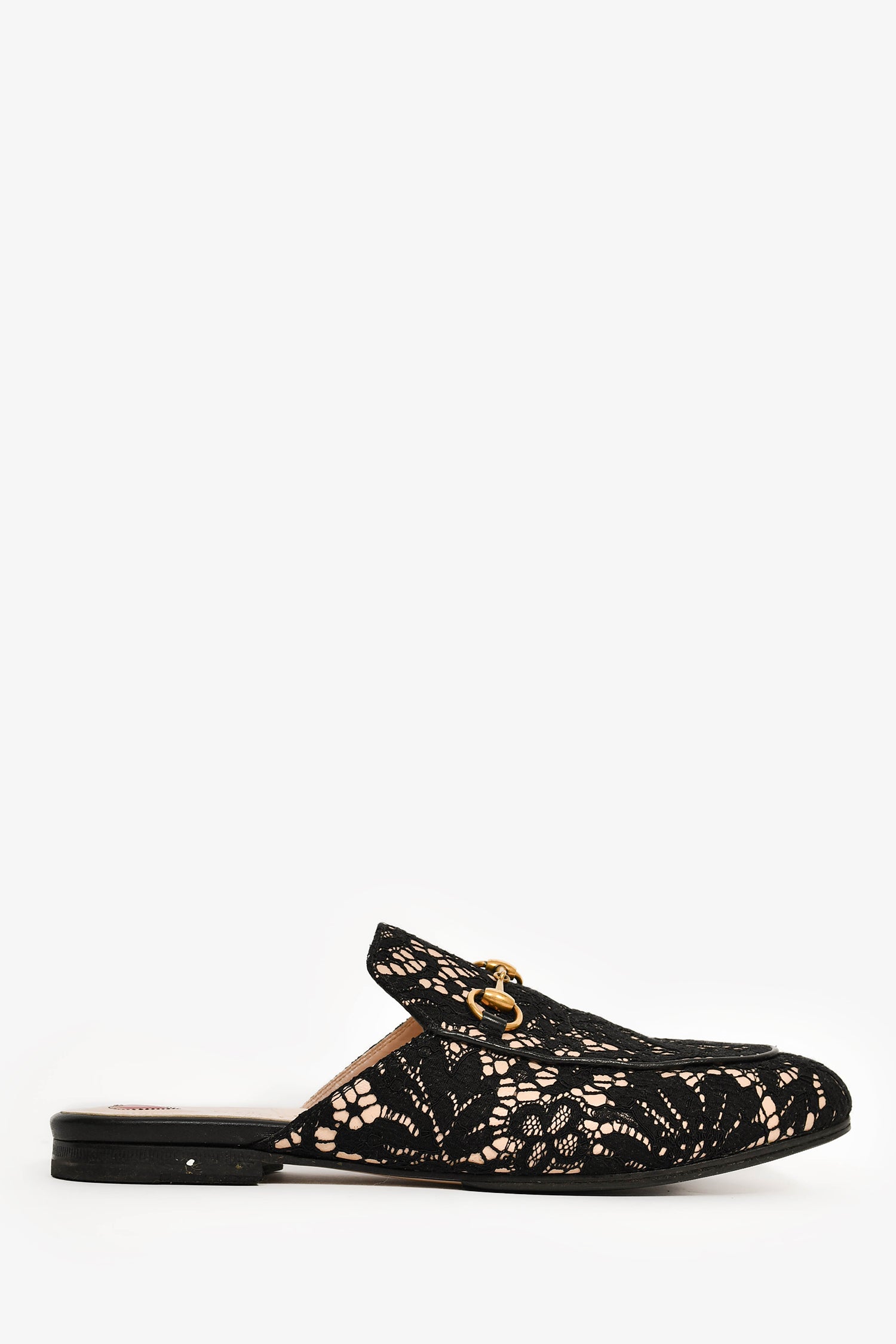 Refresh availabilityGucci Black/Cream Lace Fabric Princetown Mules. Slip-on. Leather-lined interior. Coated trim.