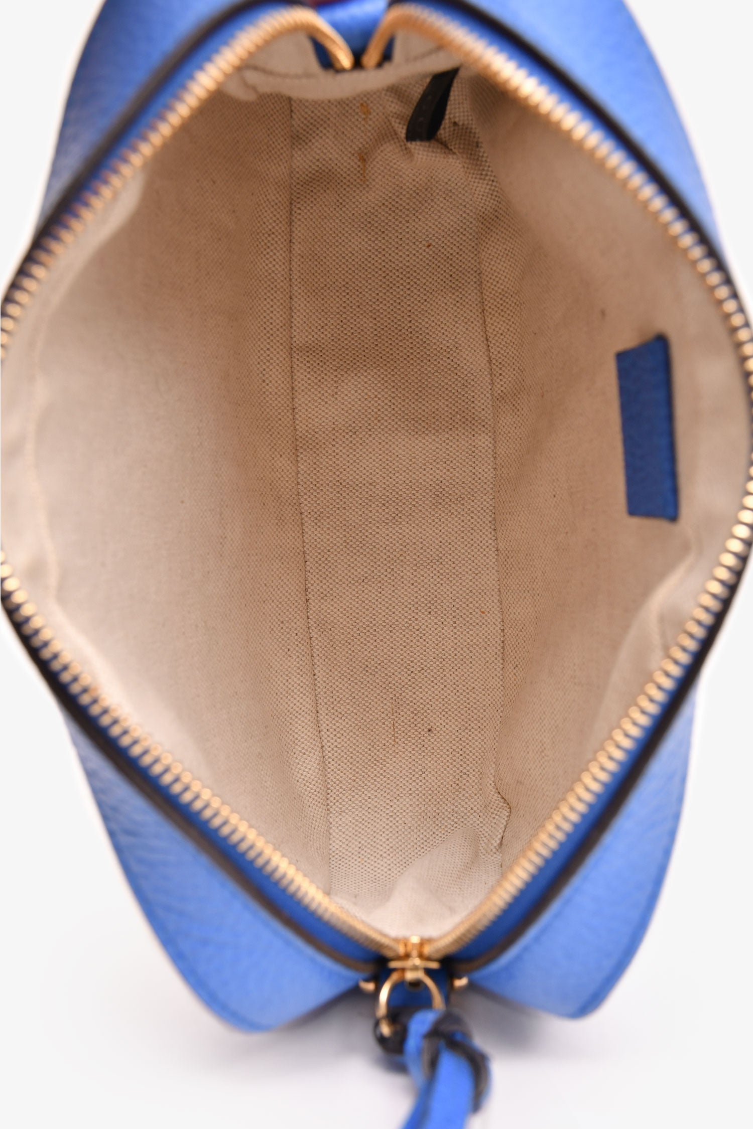 Refresh availabilityGucci Blue Grained Leather Tiger Painted Web Strap Sylvie Crossbody. Top zip closure. Cream linen interior lining. Open interior. Gold-tone hardware. Removable strap (non-adjustable)