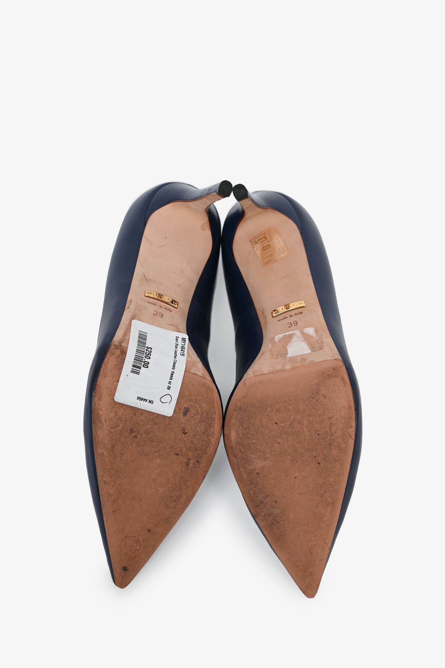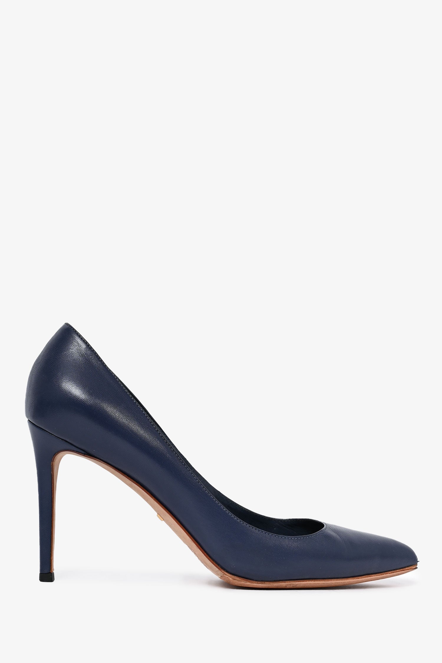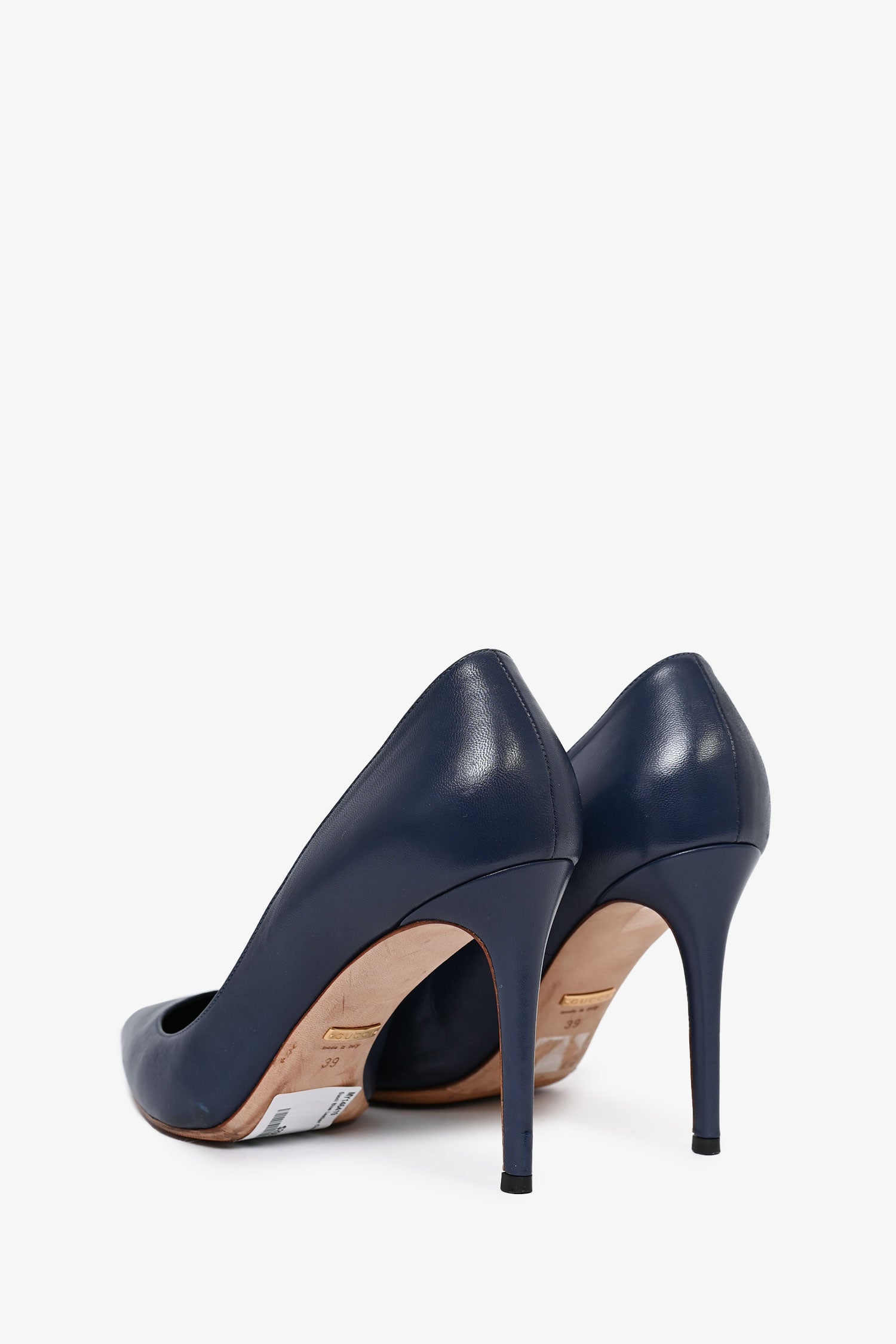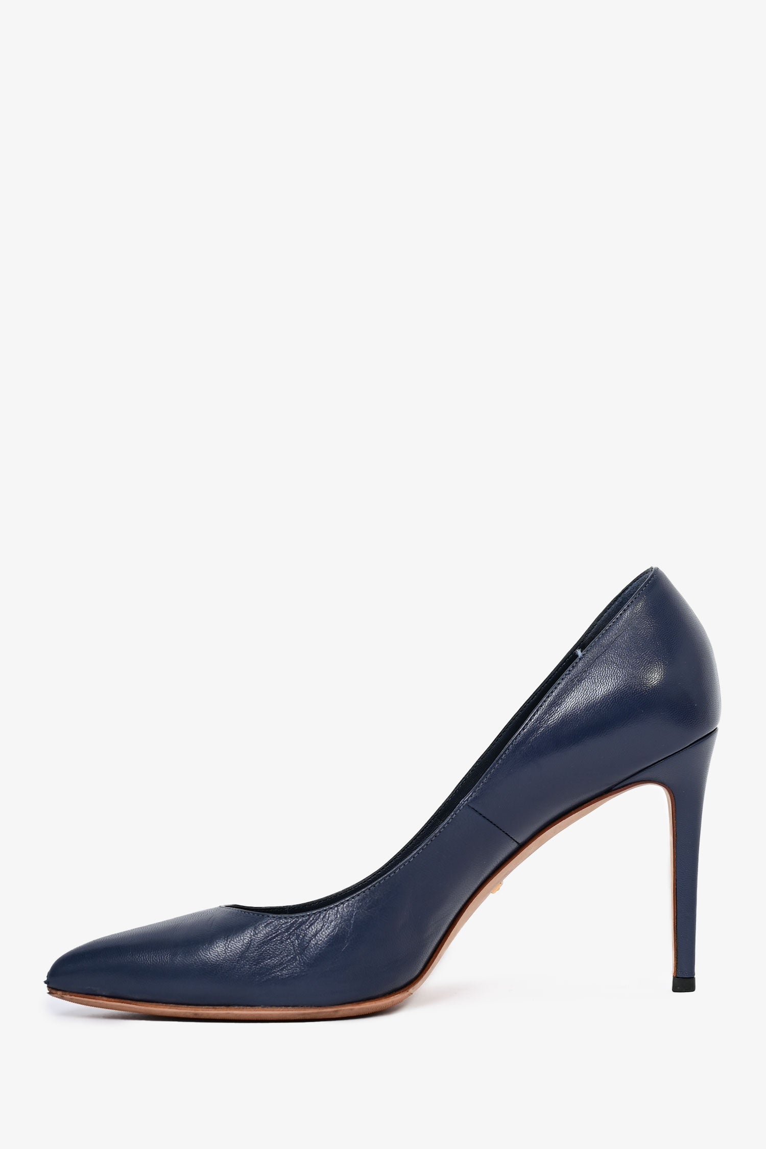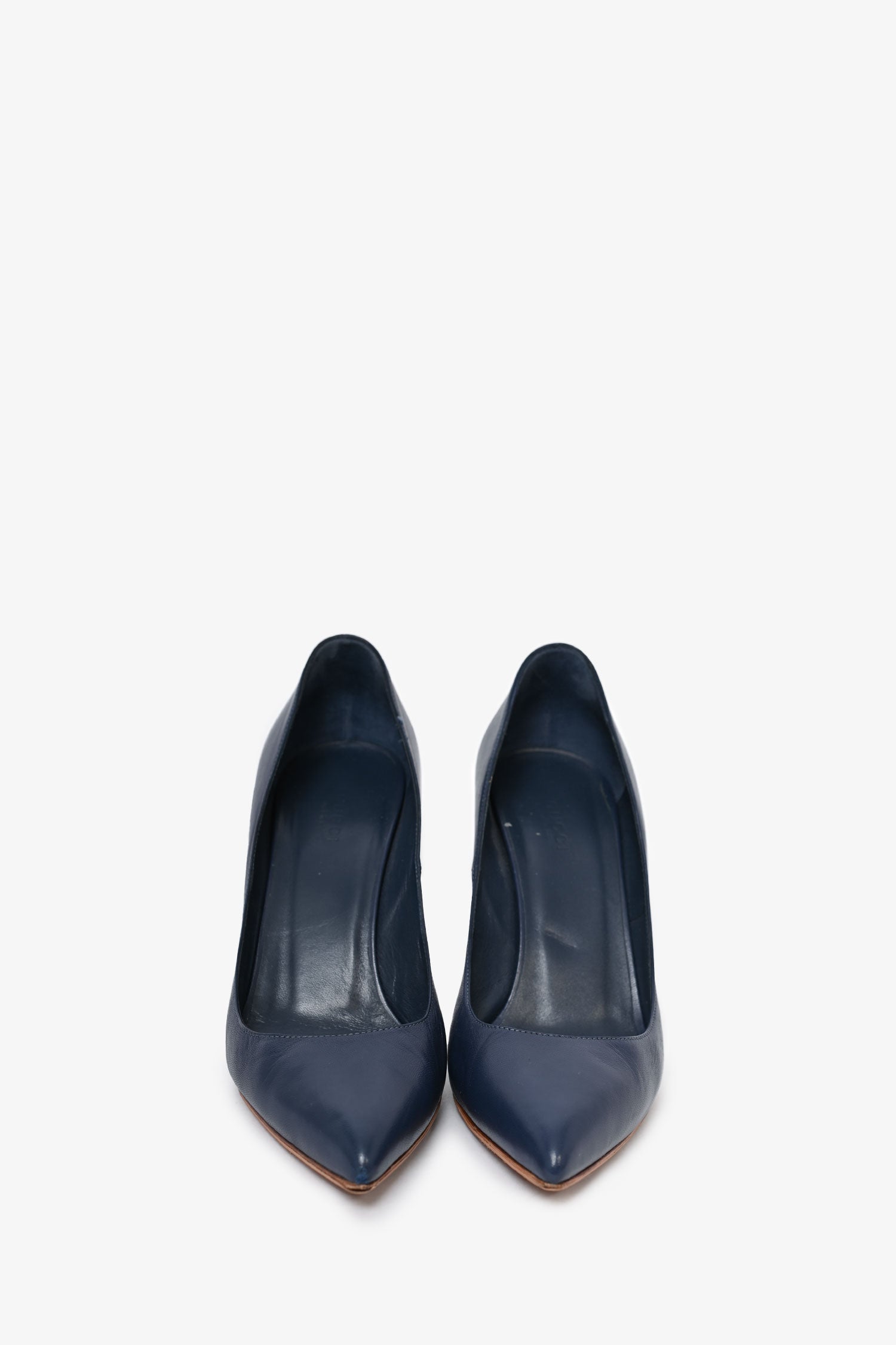 Refresh availabilityGucci Blue Leather Classic Heels. Pointed toe front. Slip-on. Pointed toe. Tonal stitching.
