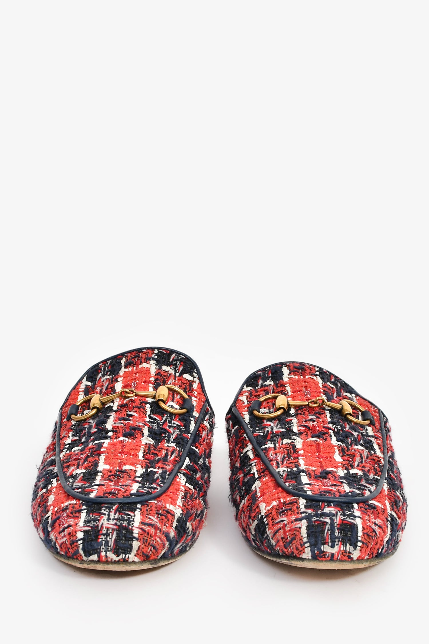 Refresh availabilityGucci Blue/Red Tweed Horsebit Loafers. Slip-on. Almond-toe. Gold-tone hardware. Tonal stitching.