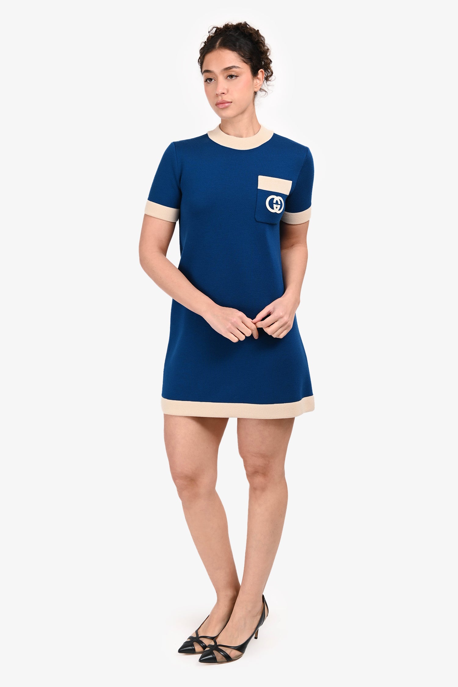 Refresh availabilityGucci Blue/Cream GG Logo Dress. Slip-on. Round neckline. 1 exterior slip pocket. Unlined. Tonal stitching.