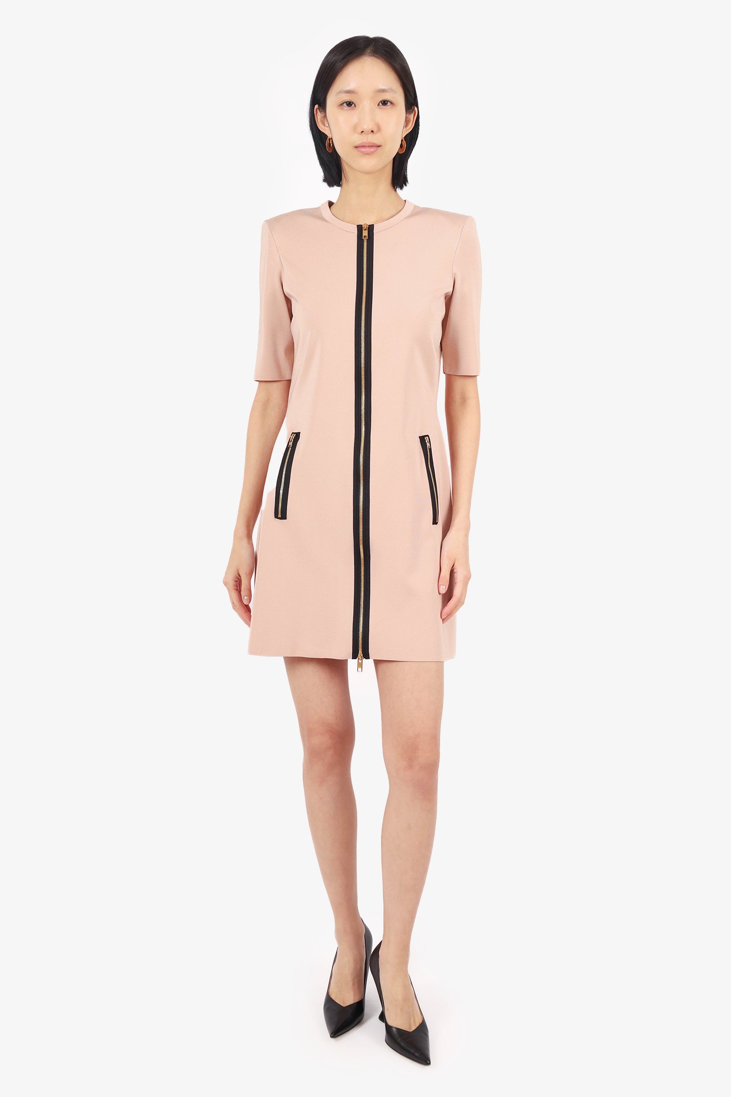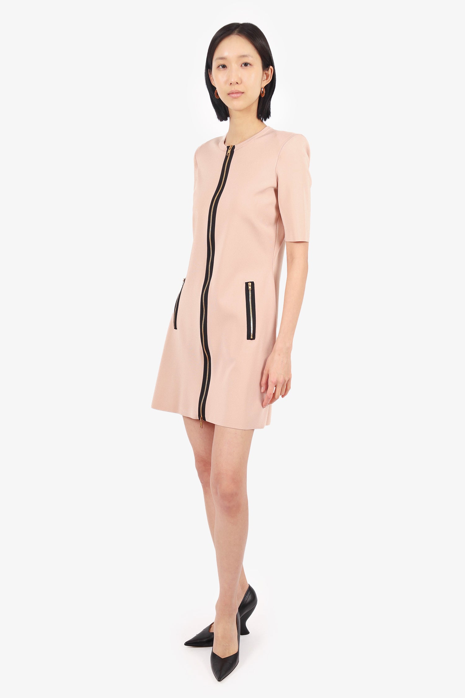 Refresh availabilityGucci Blush Pink/Black Knit Front Zip Short Sleeve Mini Dress. Front zip closure. 2 front pockets with zip closure. Round neckline. Gold-tone hardware. Tonal stitching.