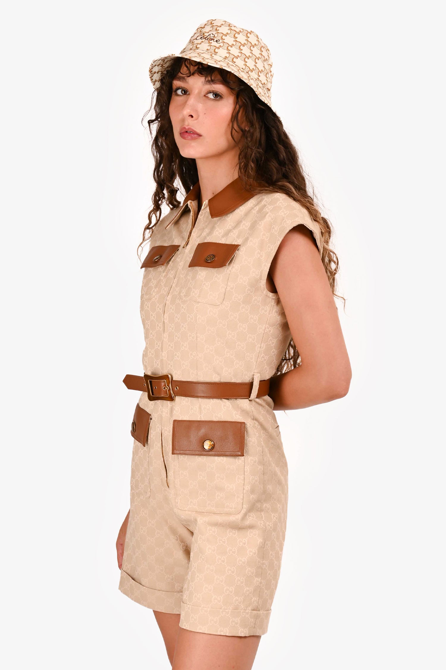 Refresh availabilityGucci Brown Cotton/Leather GG Supreme Romper. Pointed collar. Sleeveless. Front zip closure. Flap pockets at chest and hips with leather detail. AttacheBack embroidered logo. Back slip pockets. Tonal stitching.