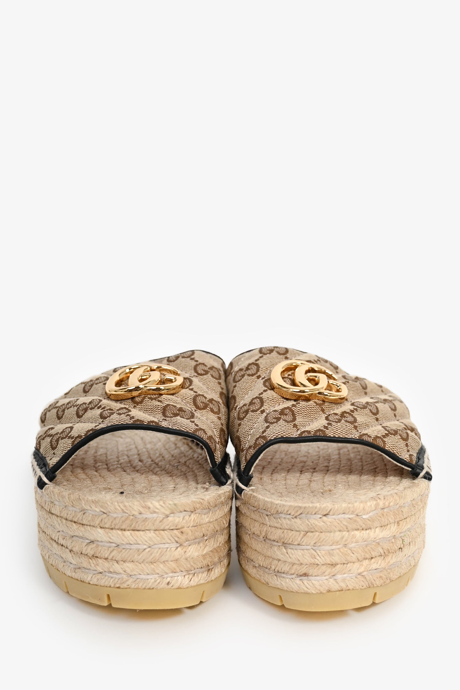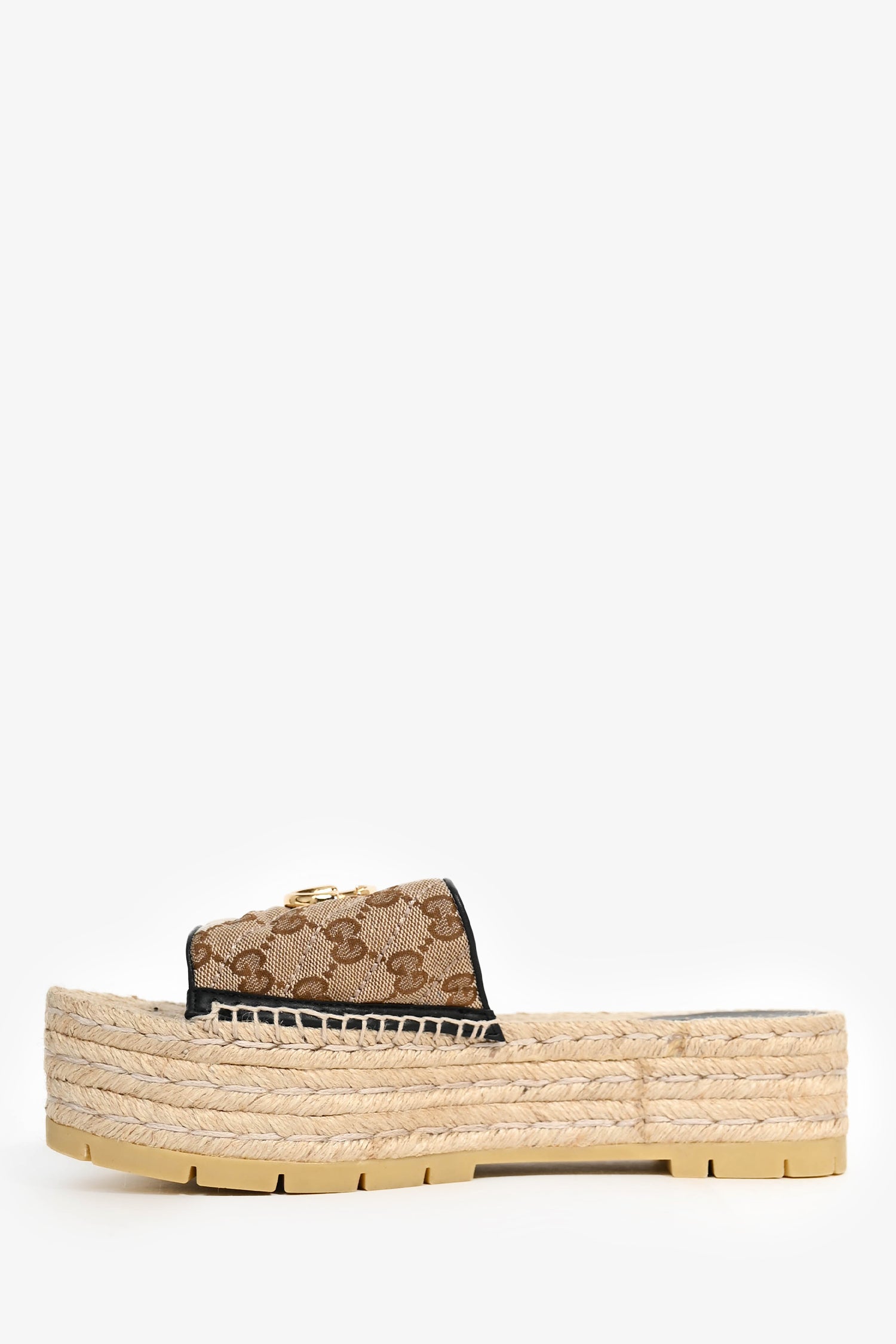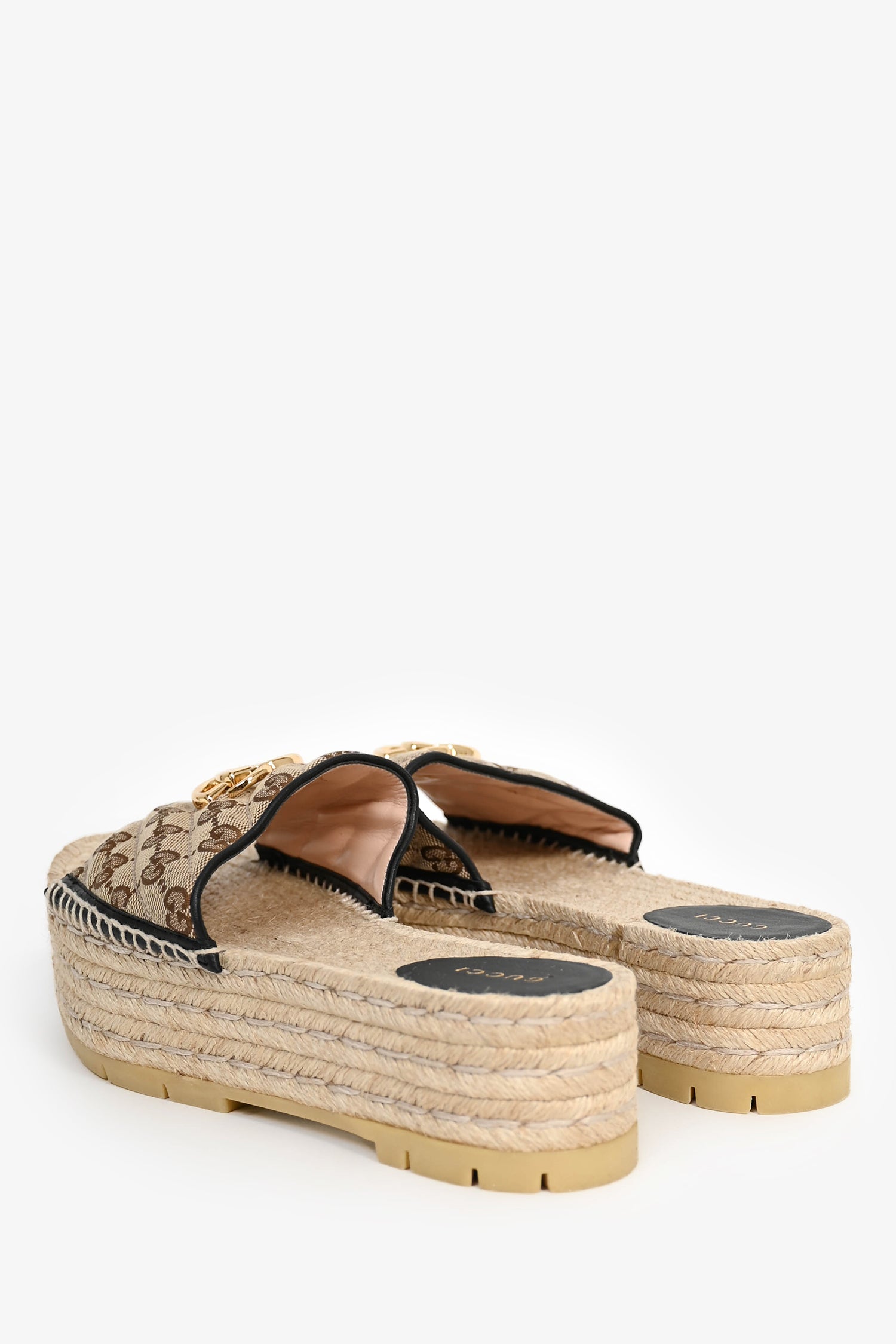 Refresh availabilityGucci Brown GG Canvas Platform Espadrille Sandals. Gold-tone hardware. Leather heel pad. Brown-tone monogram canvas. Stacked platform. Tonal stitching.