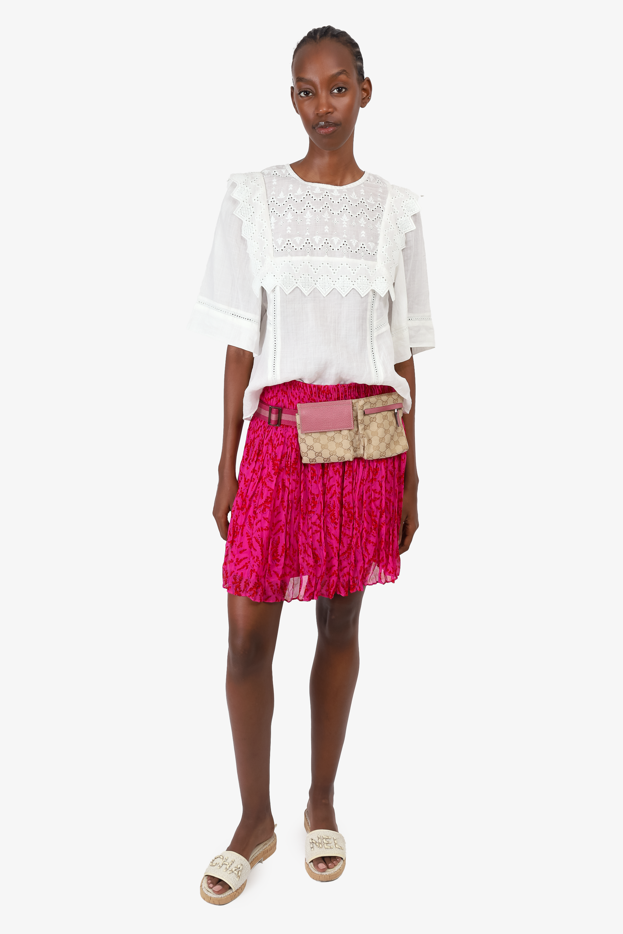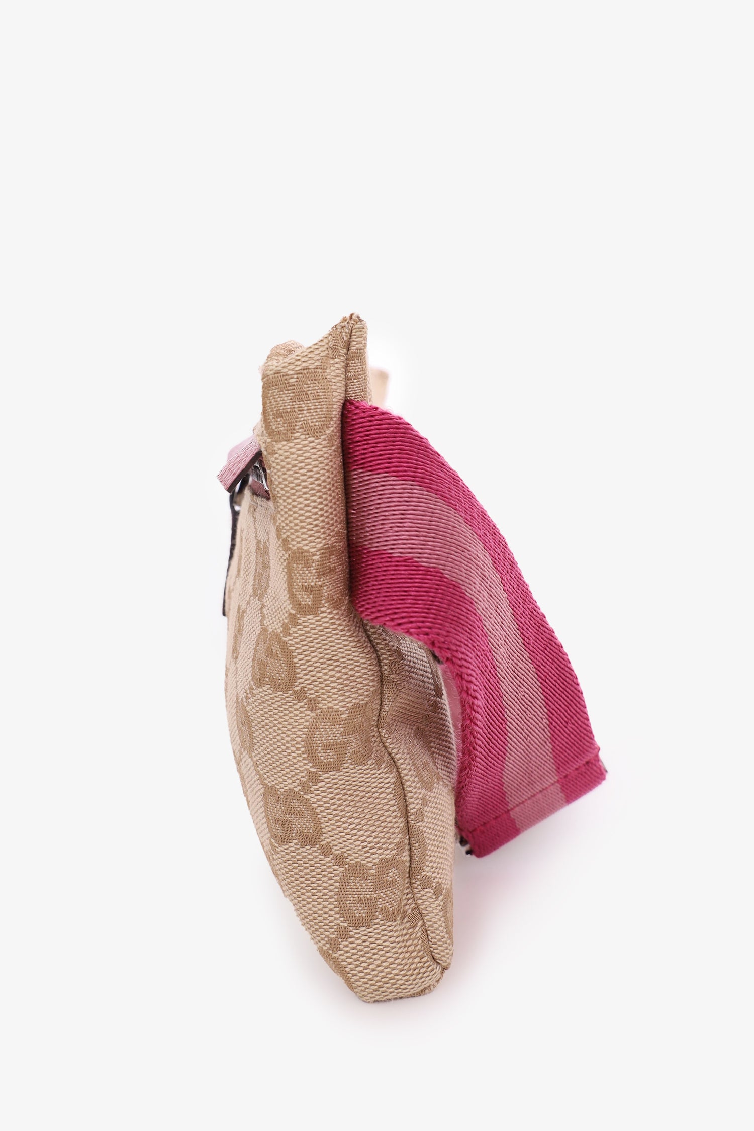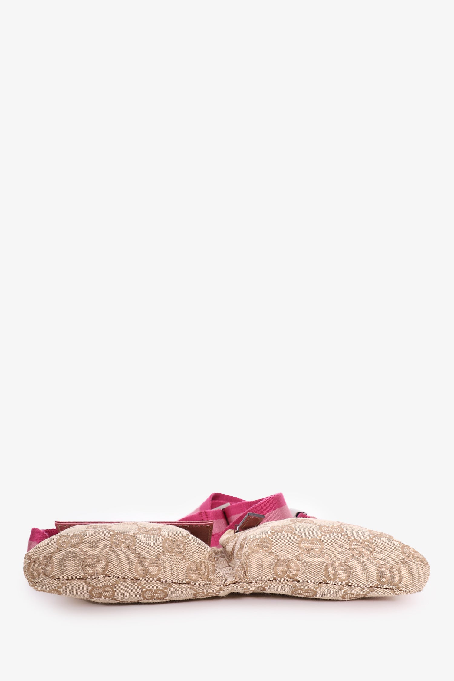 Gucci Brown GG Supreme Canvas/Pink Leather Double Pocket Waist Bag. Adjustable strap with buckle closure. 1 large interior pocket with zipper closure. 1 front flap pocket with velcro closure. 1 front pocket with zipper closure. Silver-tone hardware. Brown interior lining. Tonal stitching. Comes with dust bag.