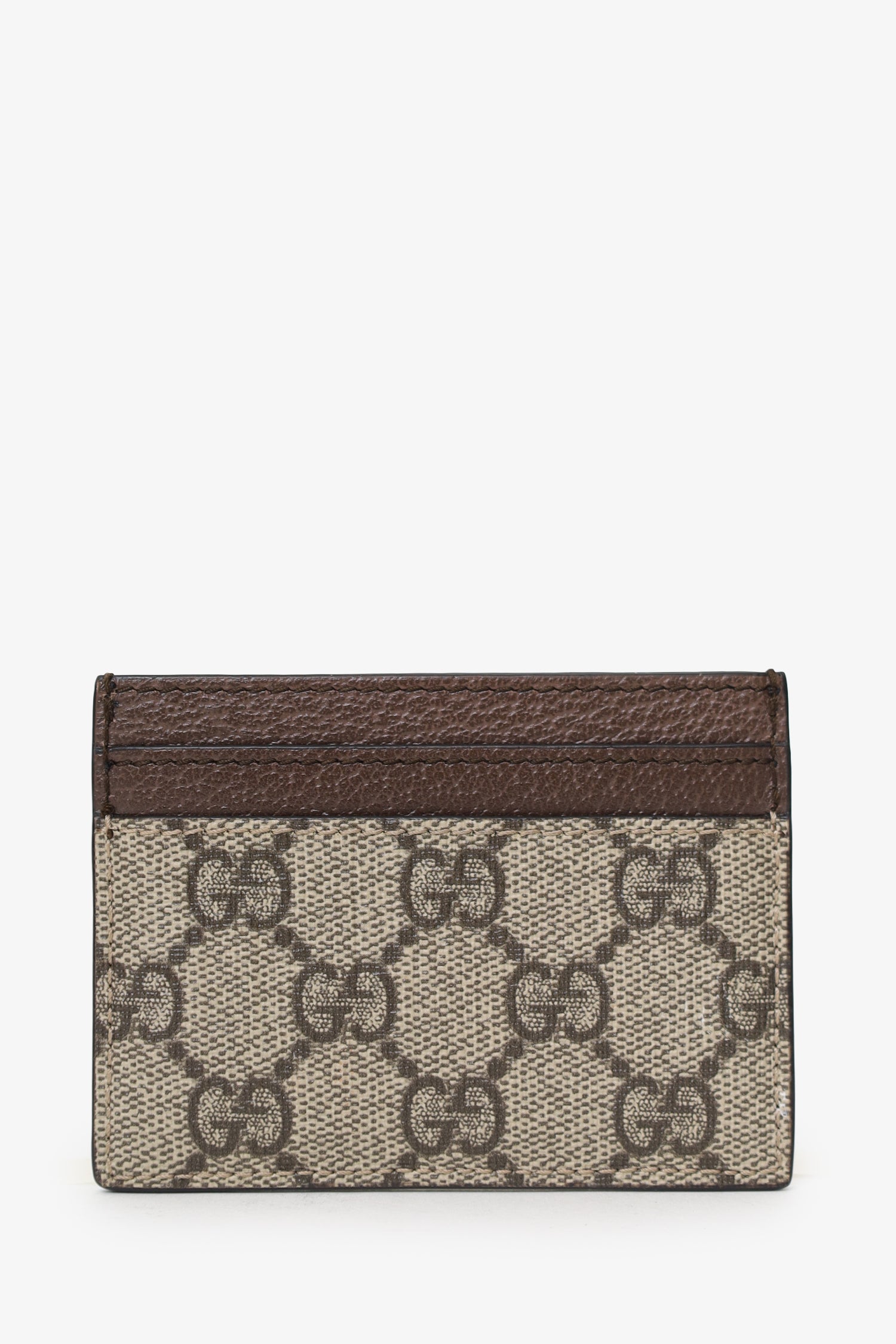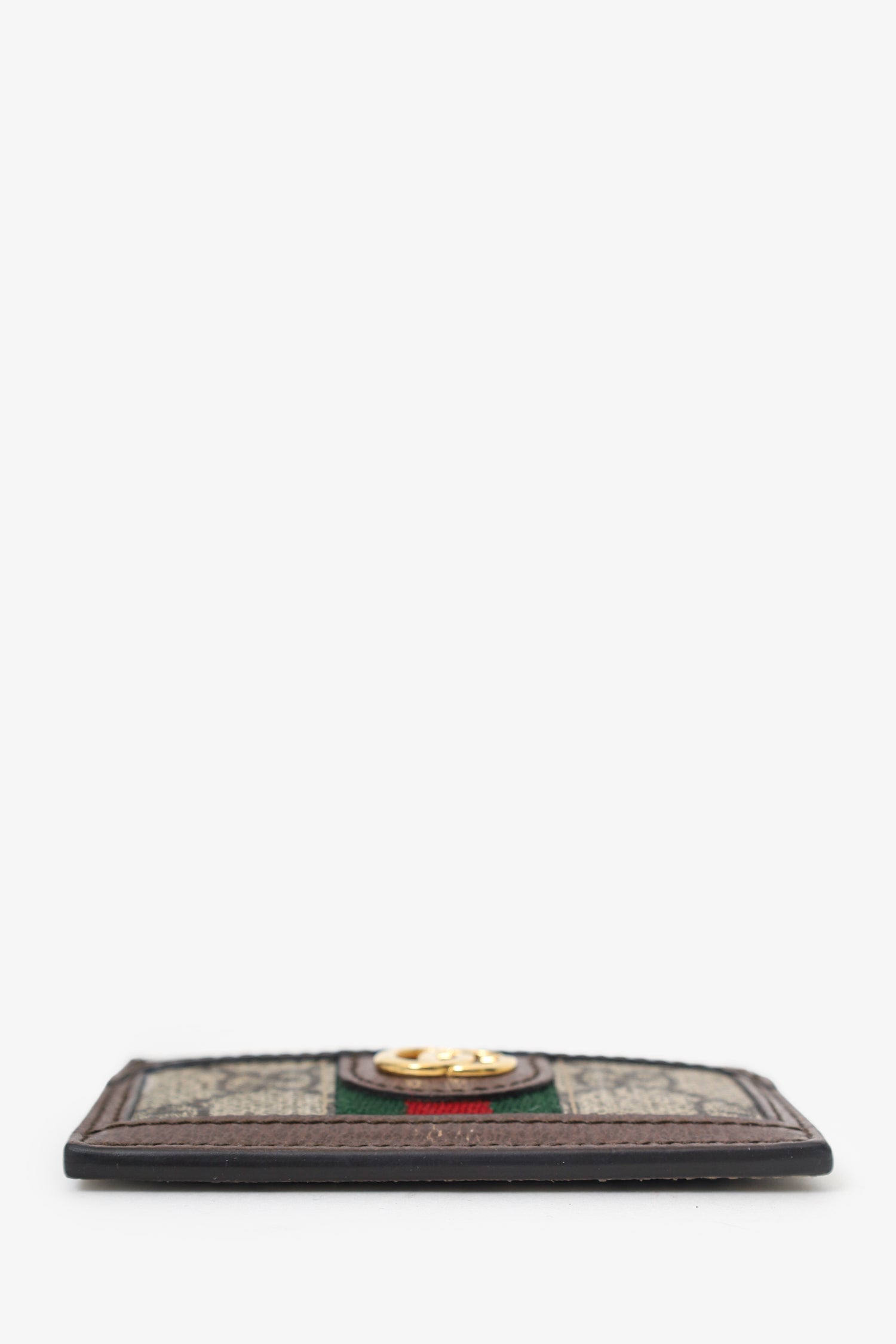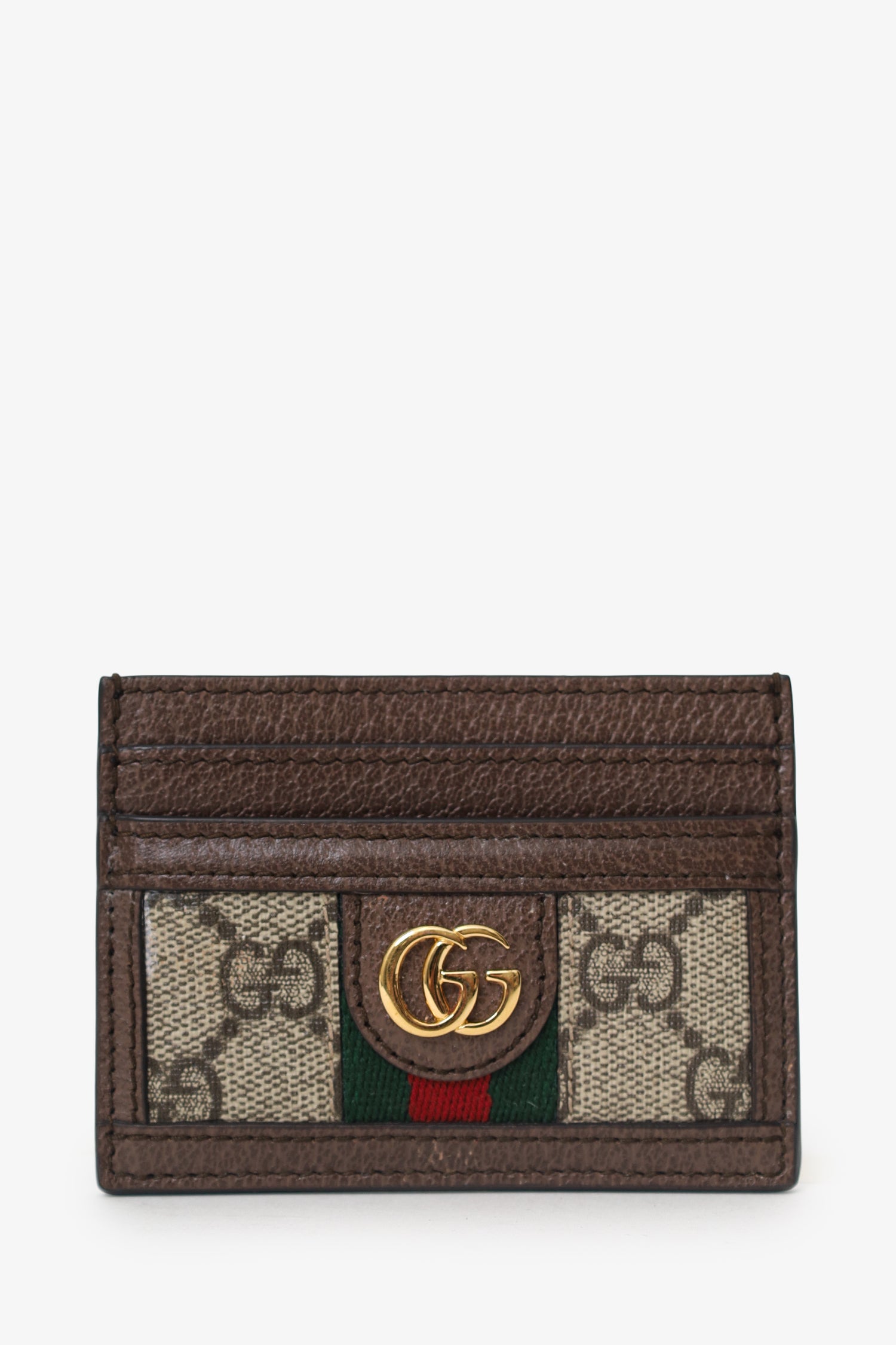 Refresh availabilityGucci Brown Ophidia GG Cardholder. 5 exterior card slots; 2 front, 1 middle, and 2 rear. Lined interior. Gold-tone hardware. Tonal stitching.