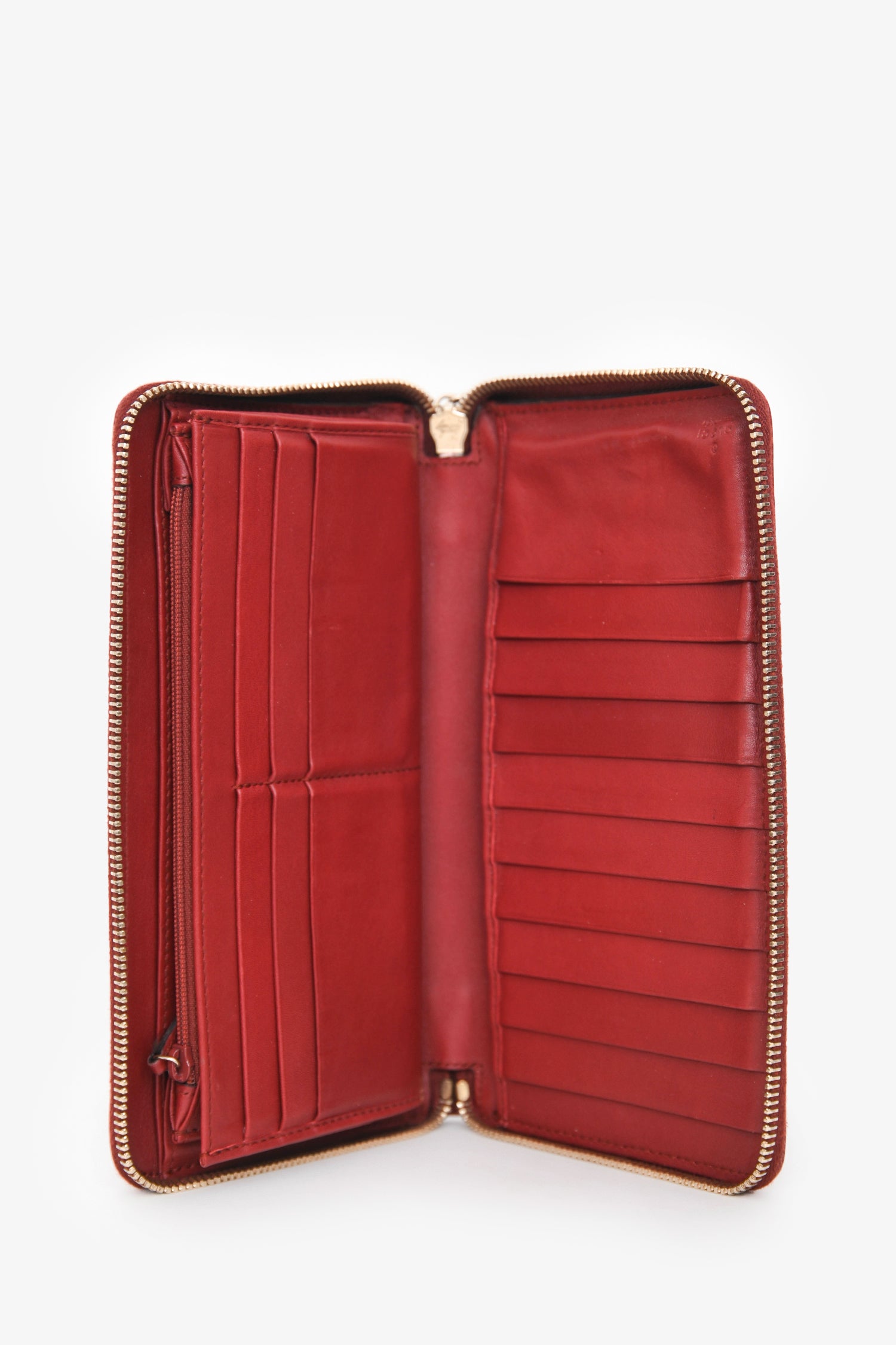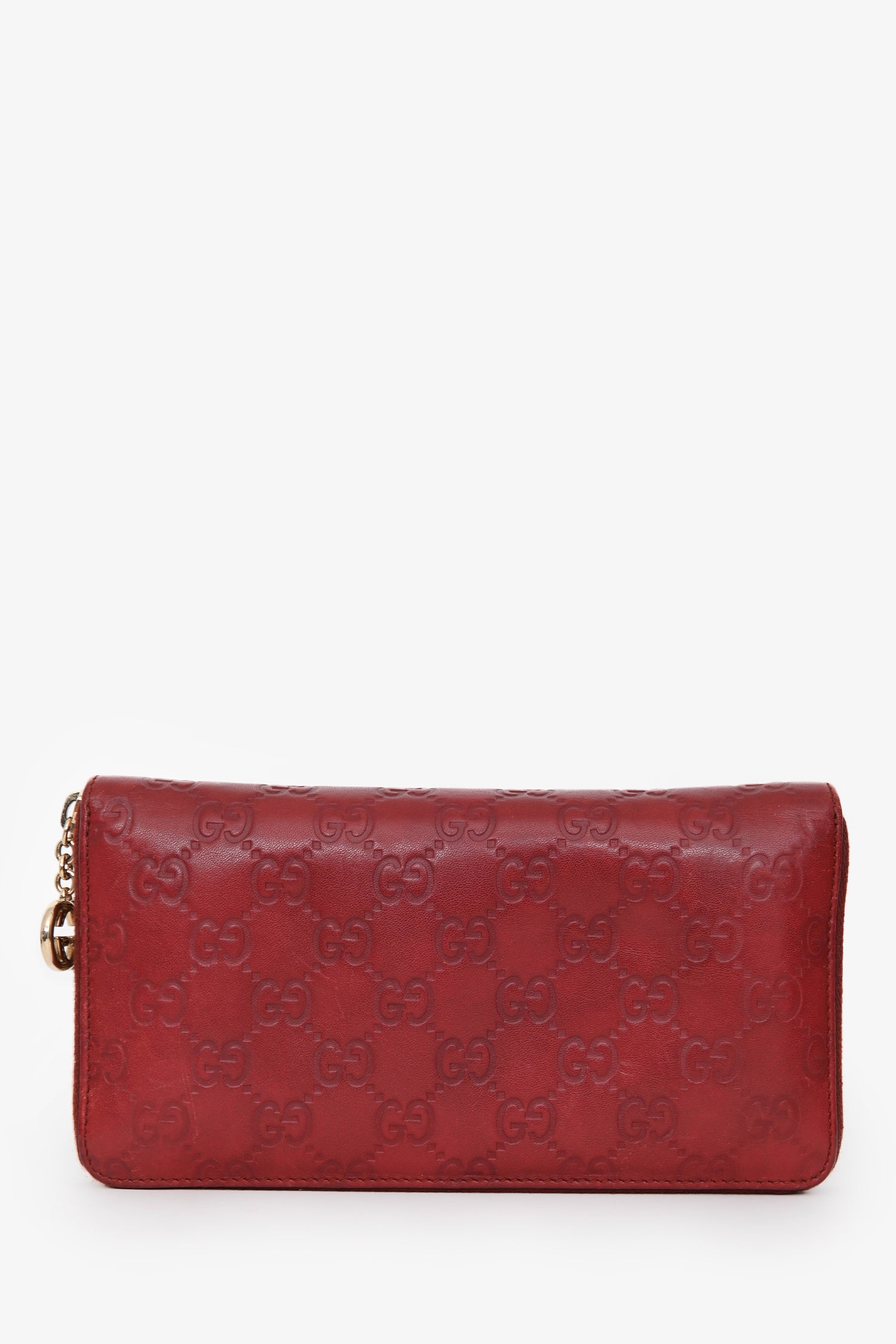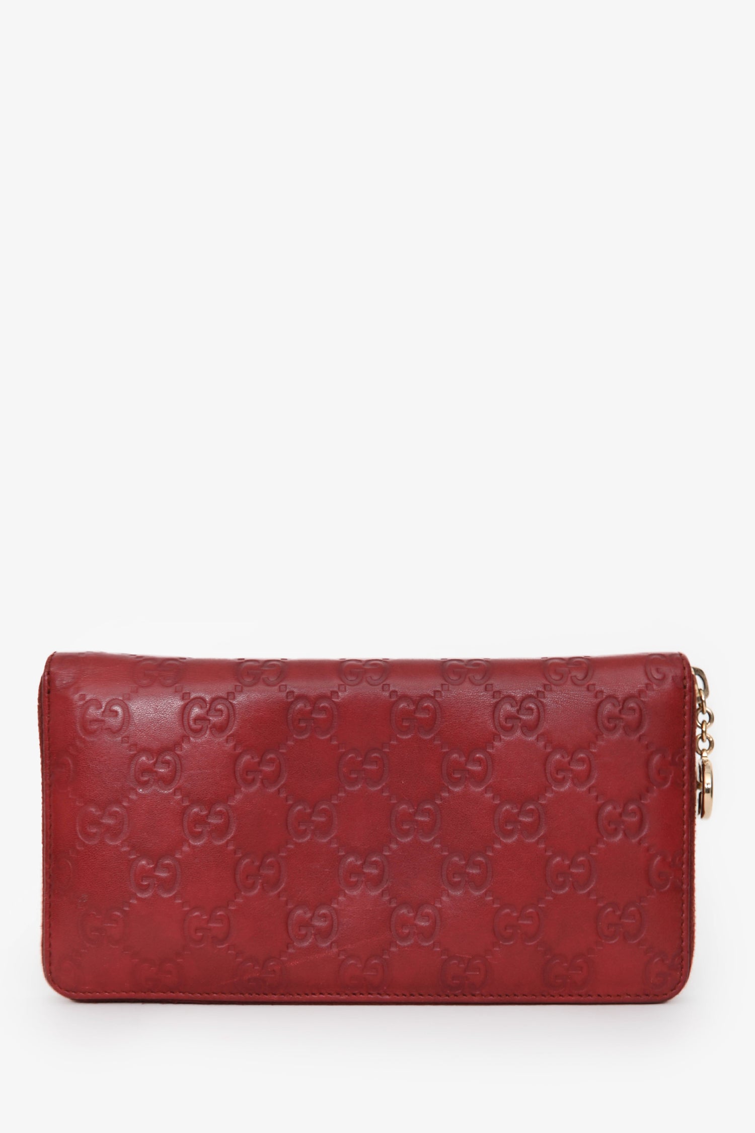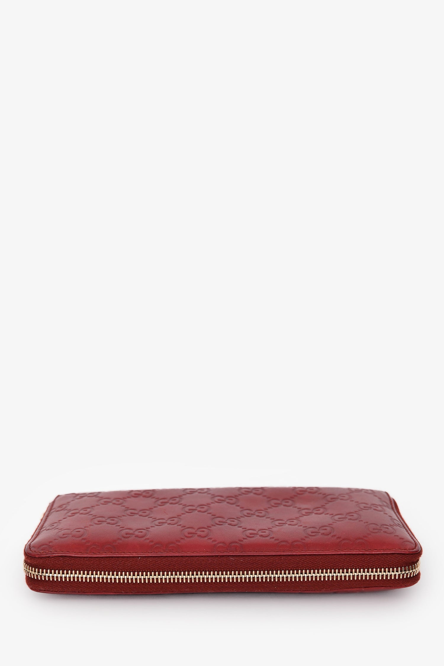 Refresh availabilityGucci Burgundy Leather Guccissima Zip Around Wallet. Top zip closure. Bi-fold opening. 21 interior pockets; 16 card slots, 4 bill folds, 1 coin pouch. Gold-tone hardware. Tonal stitching.
