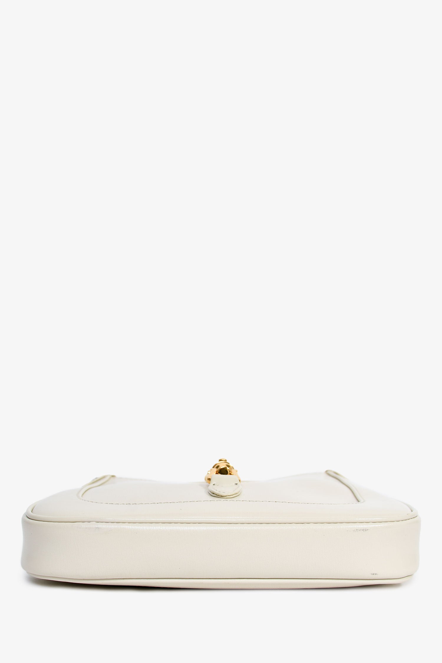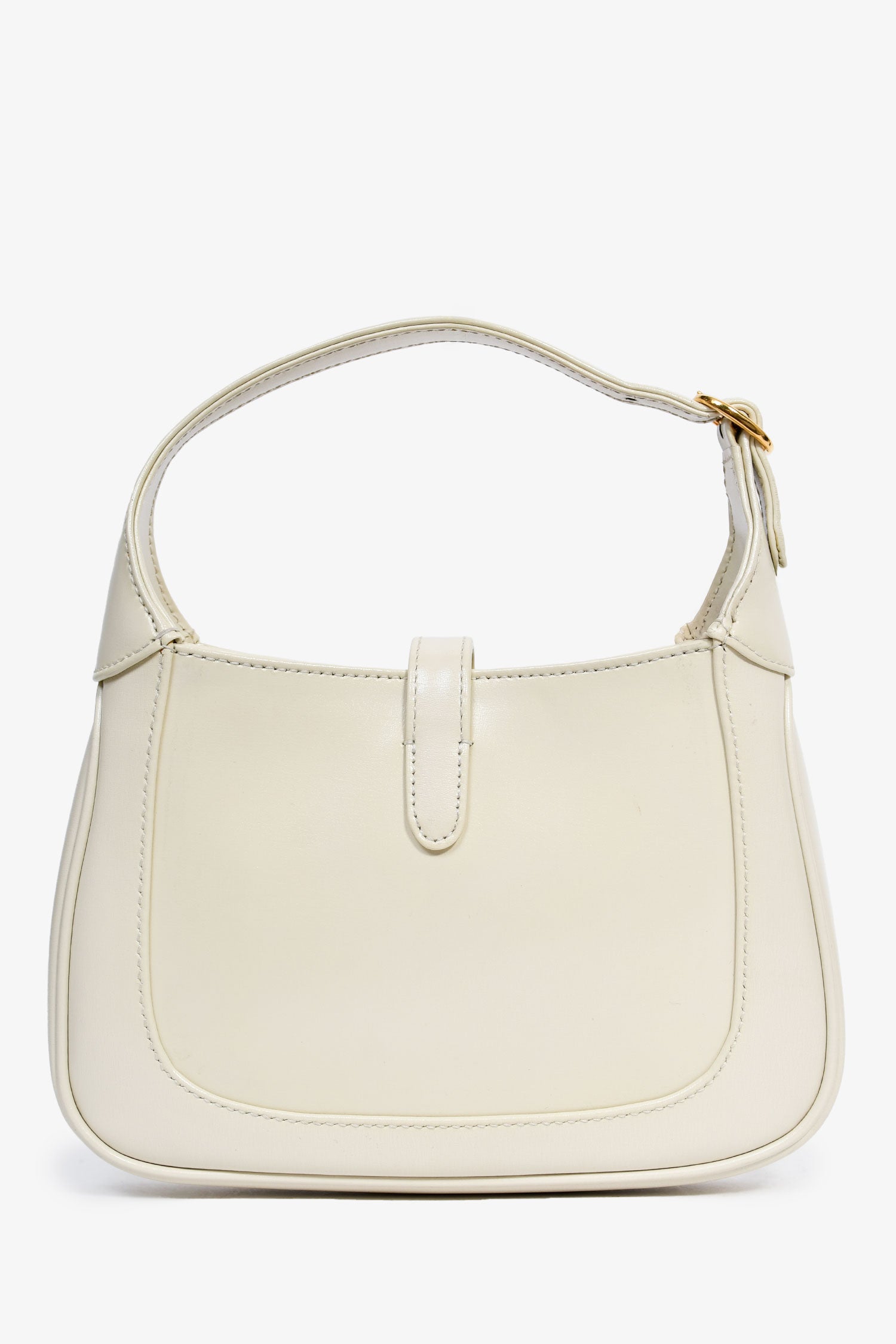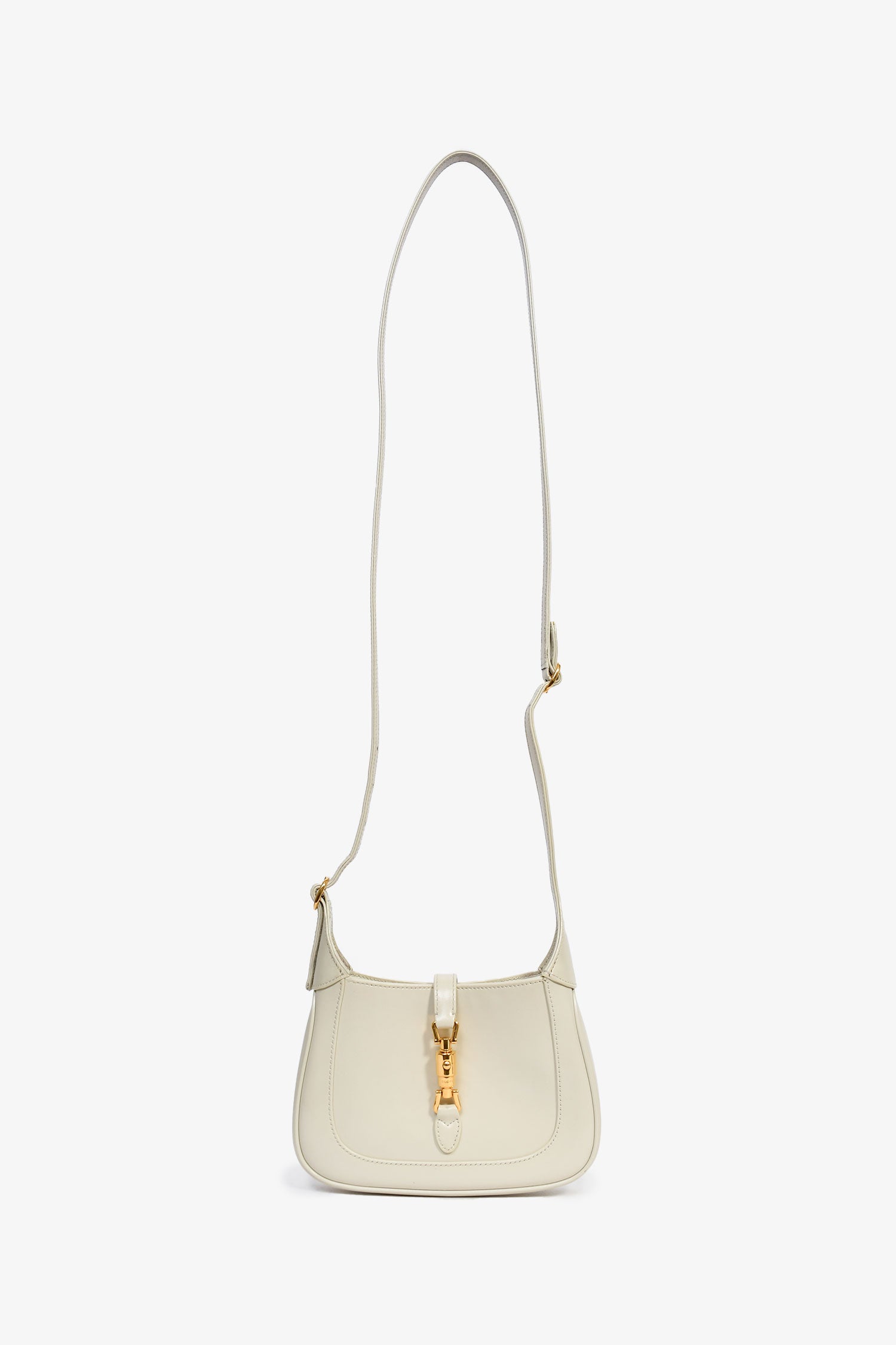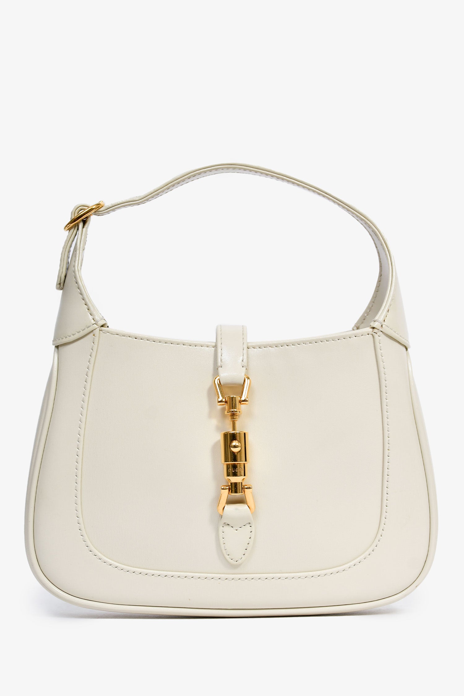 Refresh availabilityGucci Cream Leather Jackie 1961 Mini Horsebit Bag. Front piston closure. Adjustable shoulder strap. Suede-lined interior with a single pocket. Gold-tone hardware. Tonal stitching.