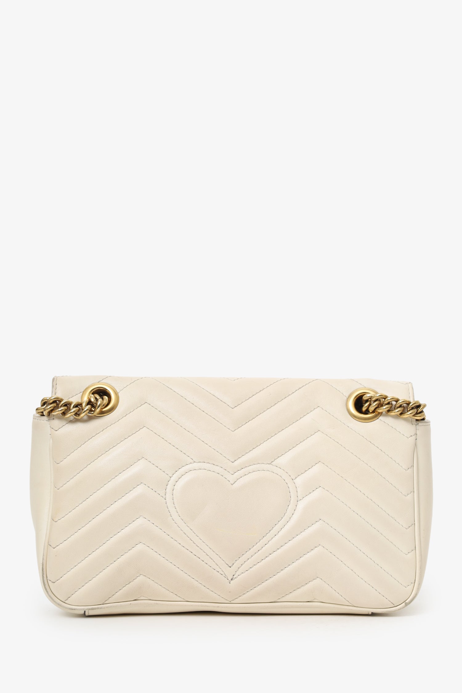 Refresh availabilityGucci Cream Leather Marmont Medium Shoulder Bag. Front fold-over flap with push-lock closure. Twin chainlink strap that can be pulled into one longer strap. Suede-lined interior. Single interior zip pocket. Gold-tone hardware. Tonal stitching.