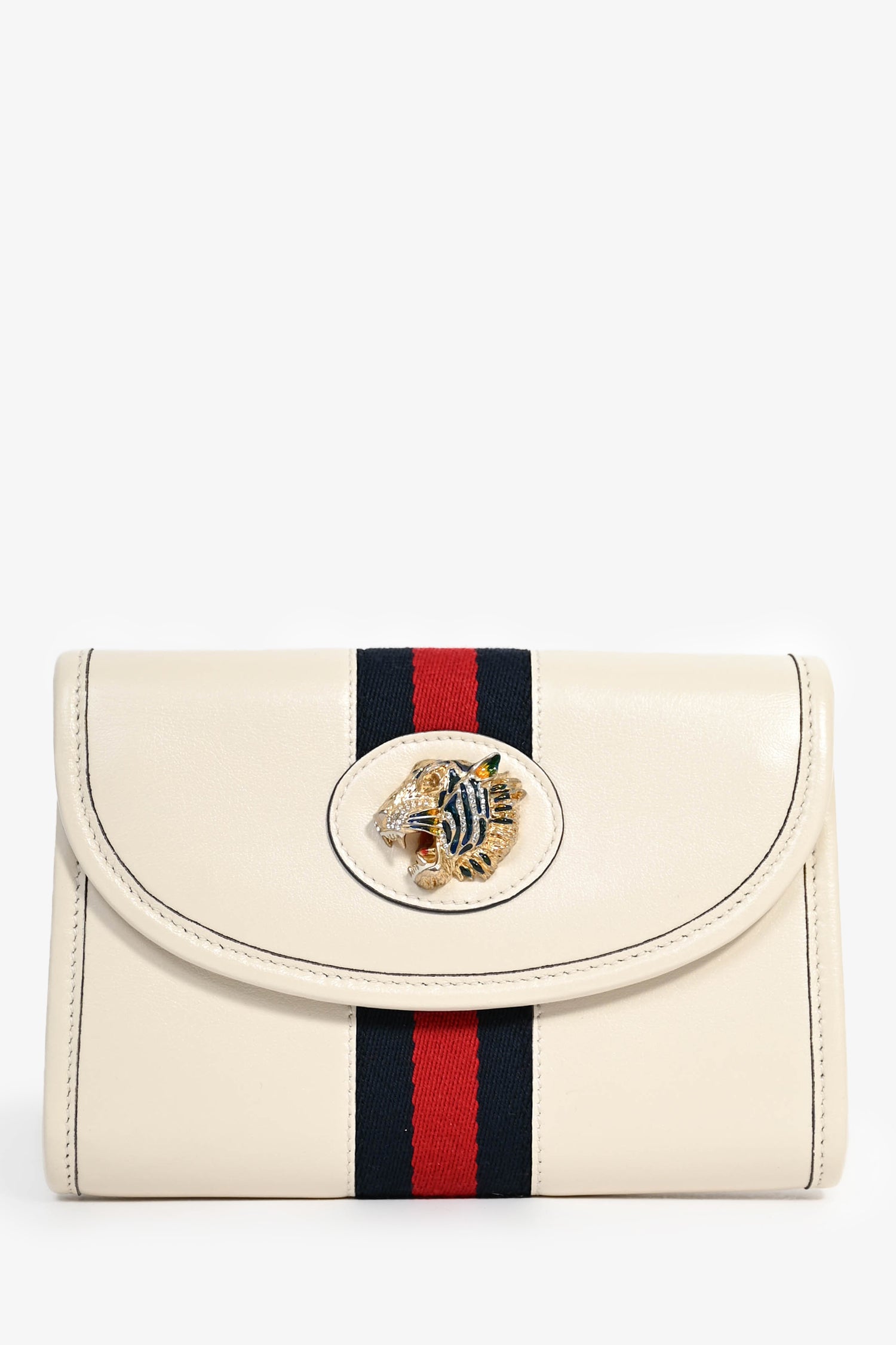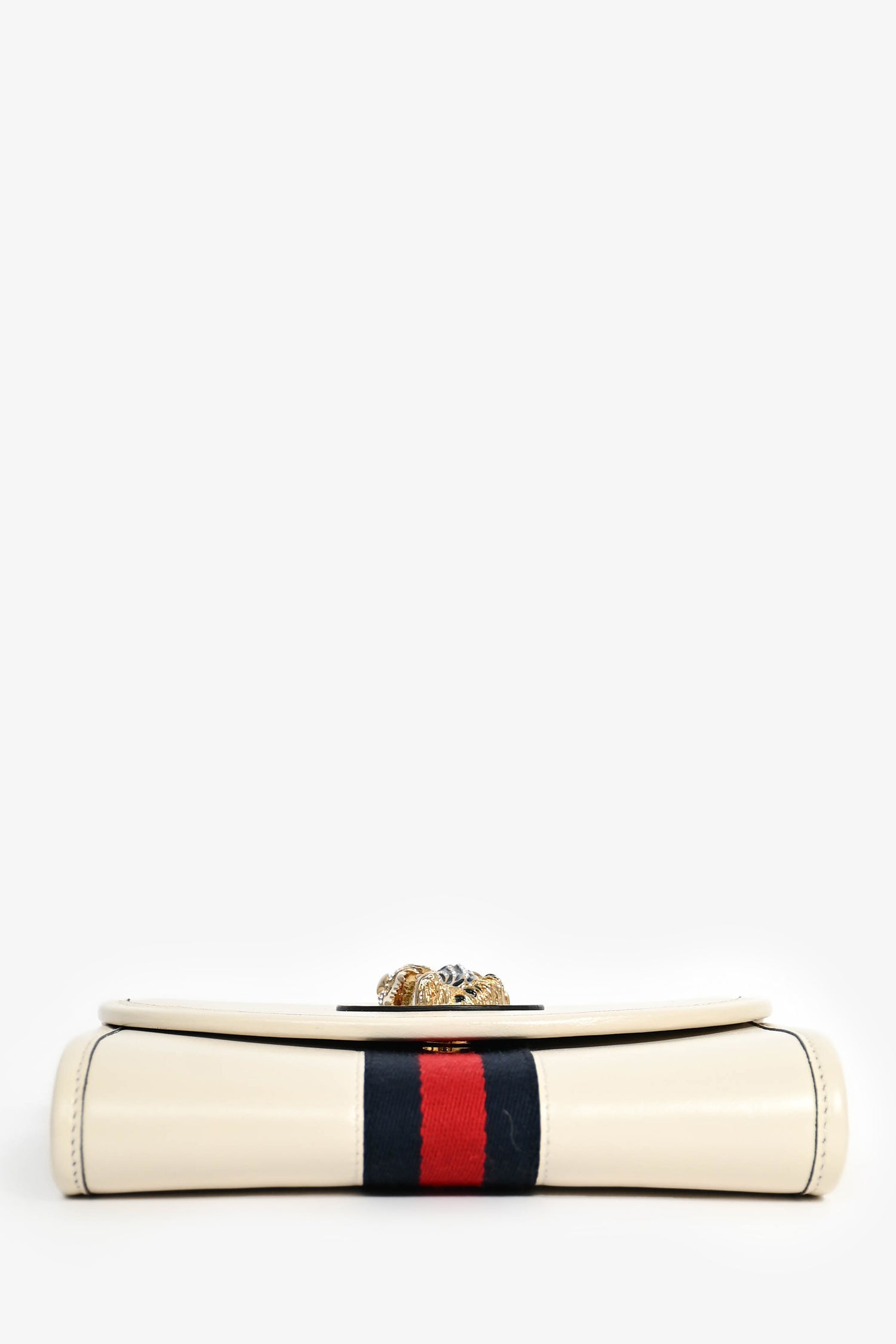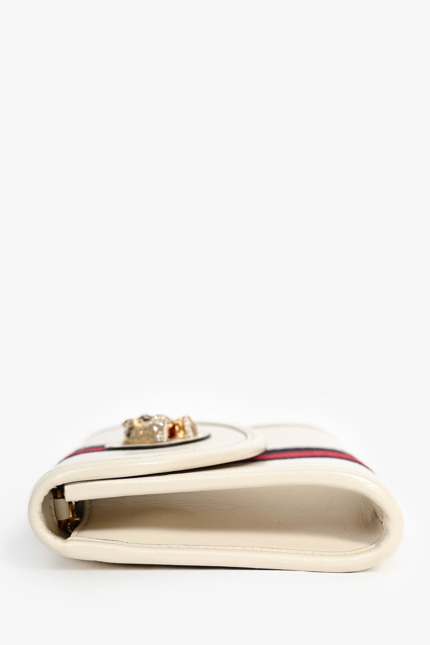 Refresh availabilityGucci Cream Leather Web Mini Rajah Clutch. Fold-over flap with a snap closure. Gold and silver-tone hardware with embellishments. Chain-link strap. Lined interior with 2 card pockets. Tonal stitching.
