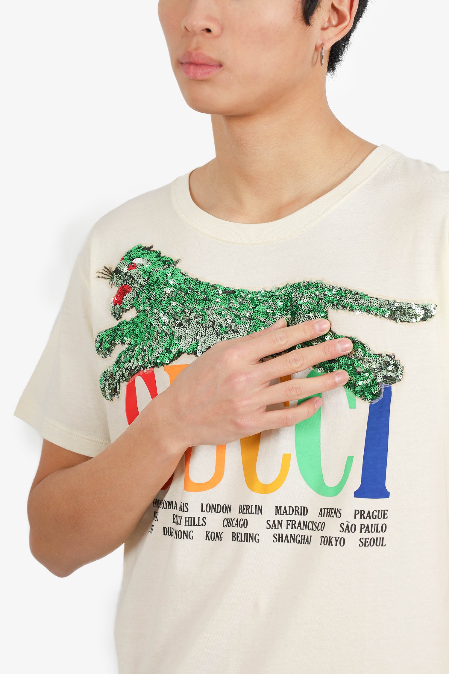 Refresh availabilityGucci Cream Sequin City Detail T-Shirt. Pull-on. Ribbed crew neckline. Partially lined. Tonal stitching.