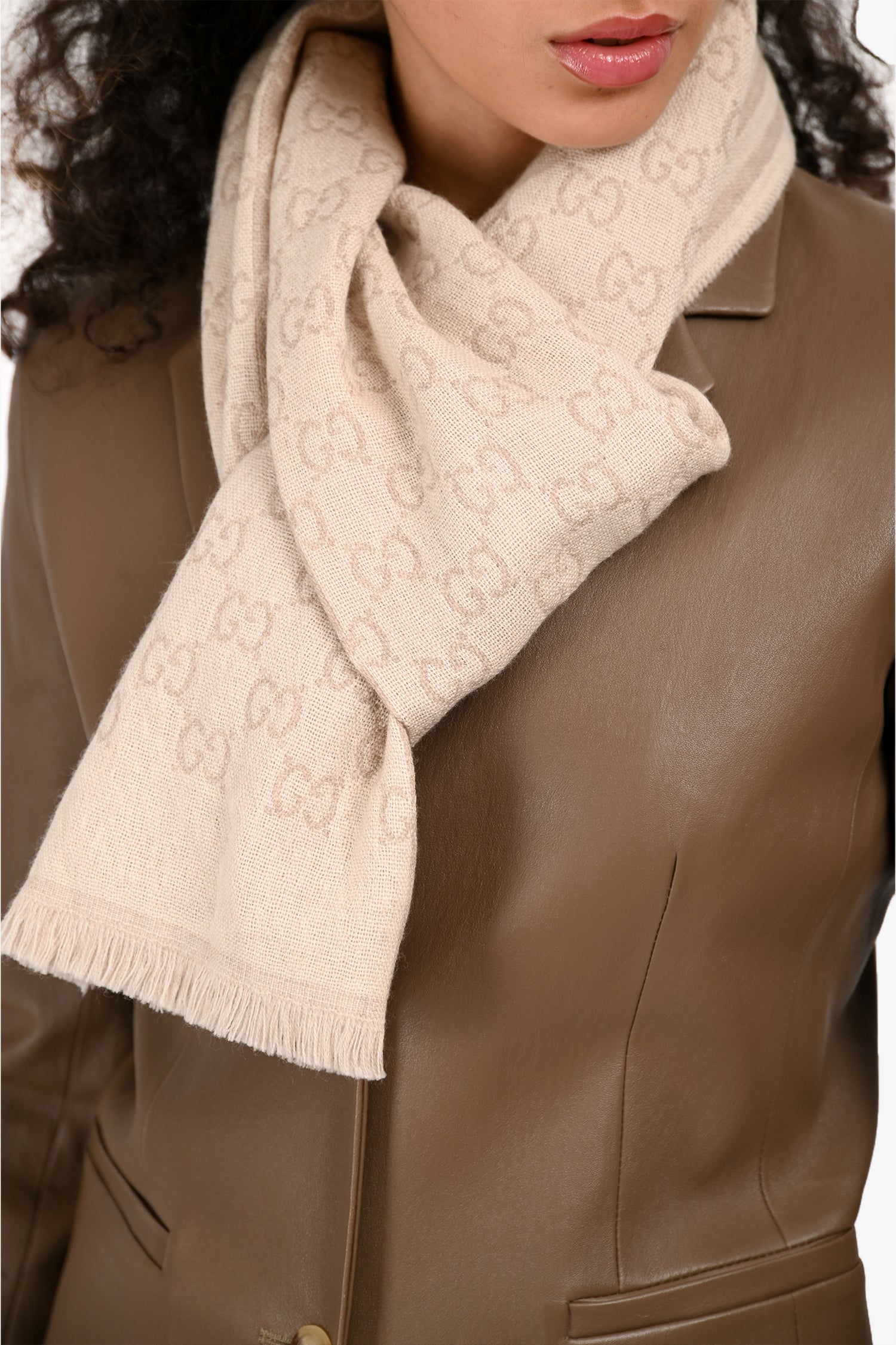 Refresh availabilityGucci Cream Wool Monogram Frayed Scarf. Tonal stitching.