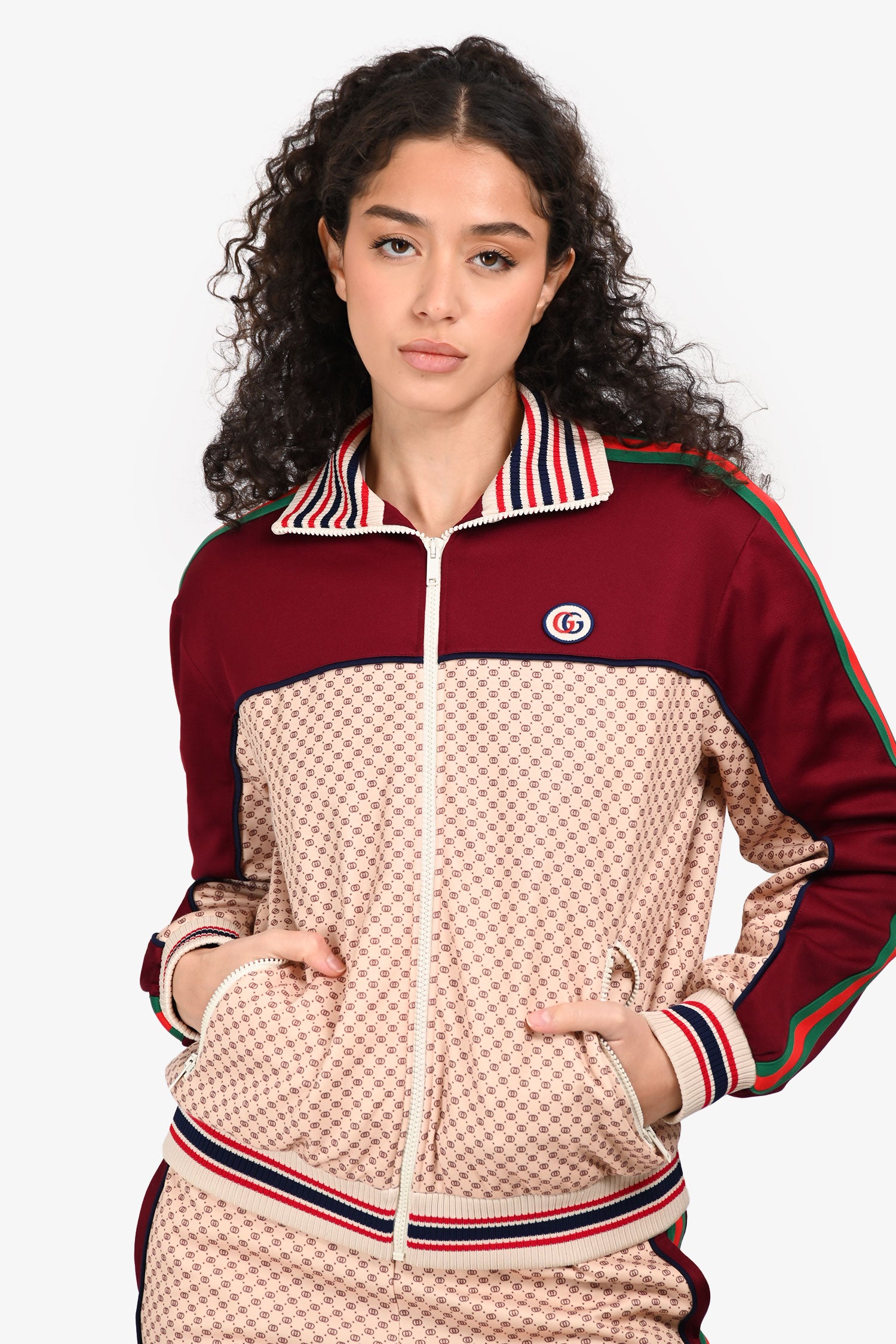 Refresh availabilityGucci Cream/Burgundy GG Web Sleeve Zip Up Track Jacket. Slip-on. Collared neckline. Front zip closure. 2 exterior zip pockets. Ribbed collar, cuffs, and hem. Lined interior. Tonal stitching.