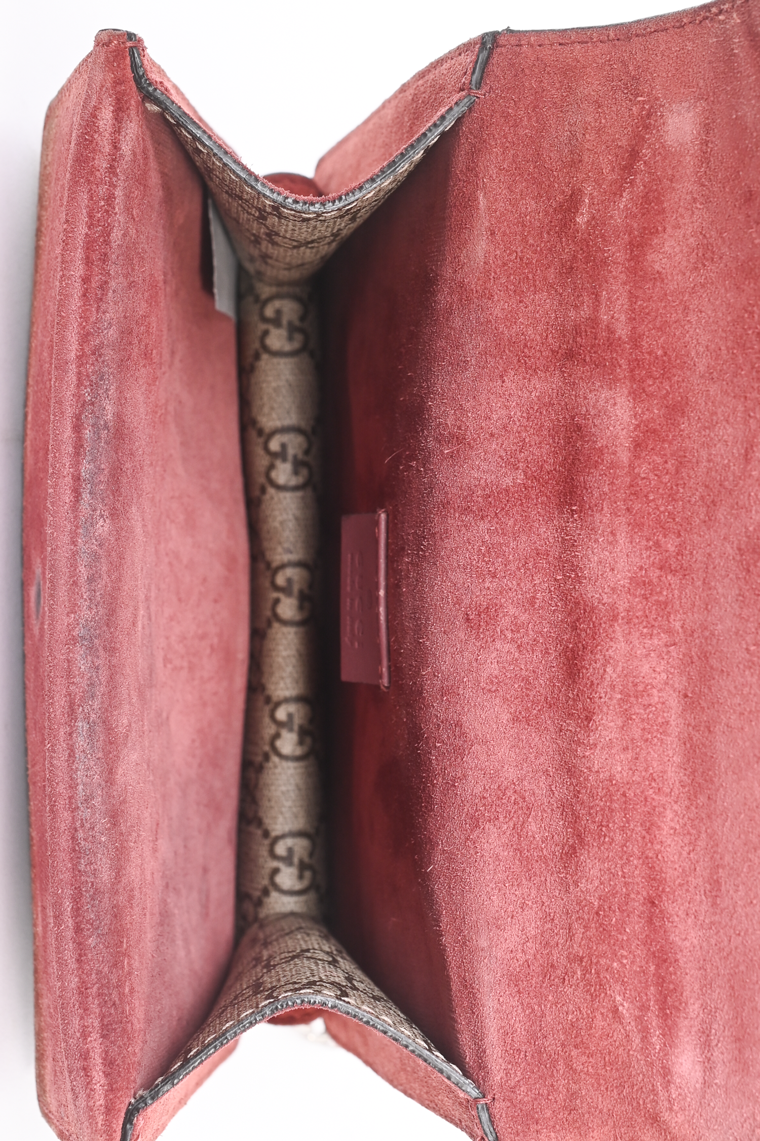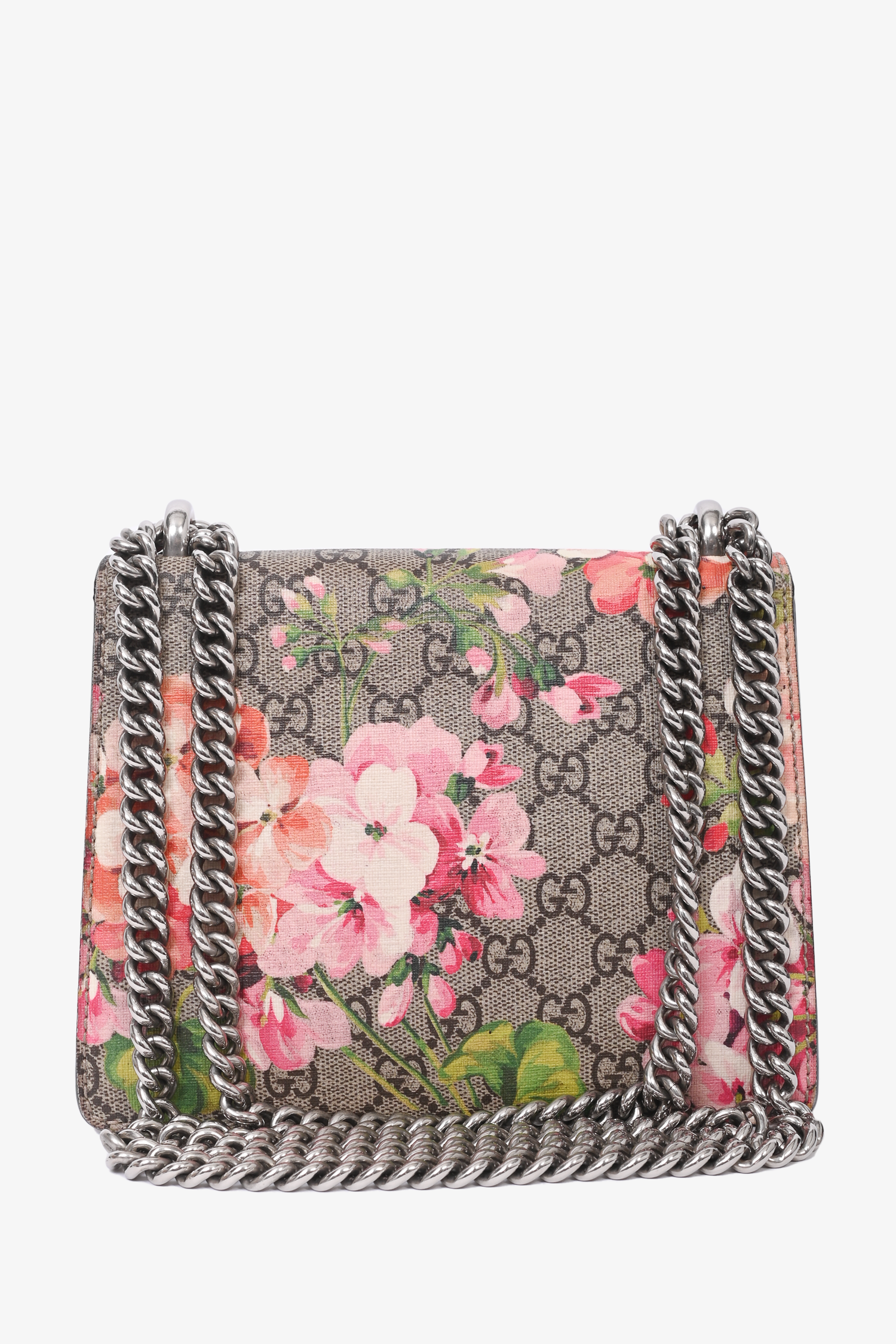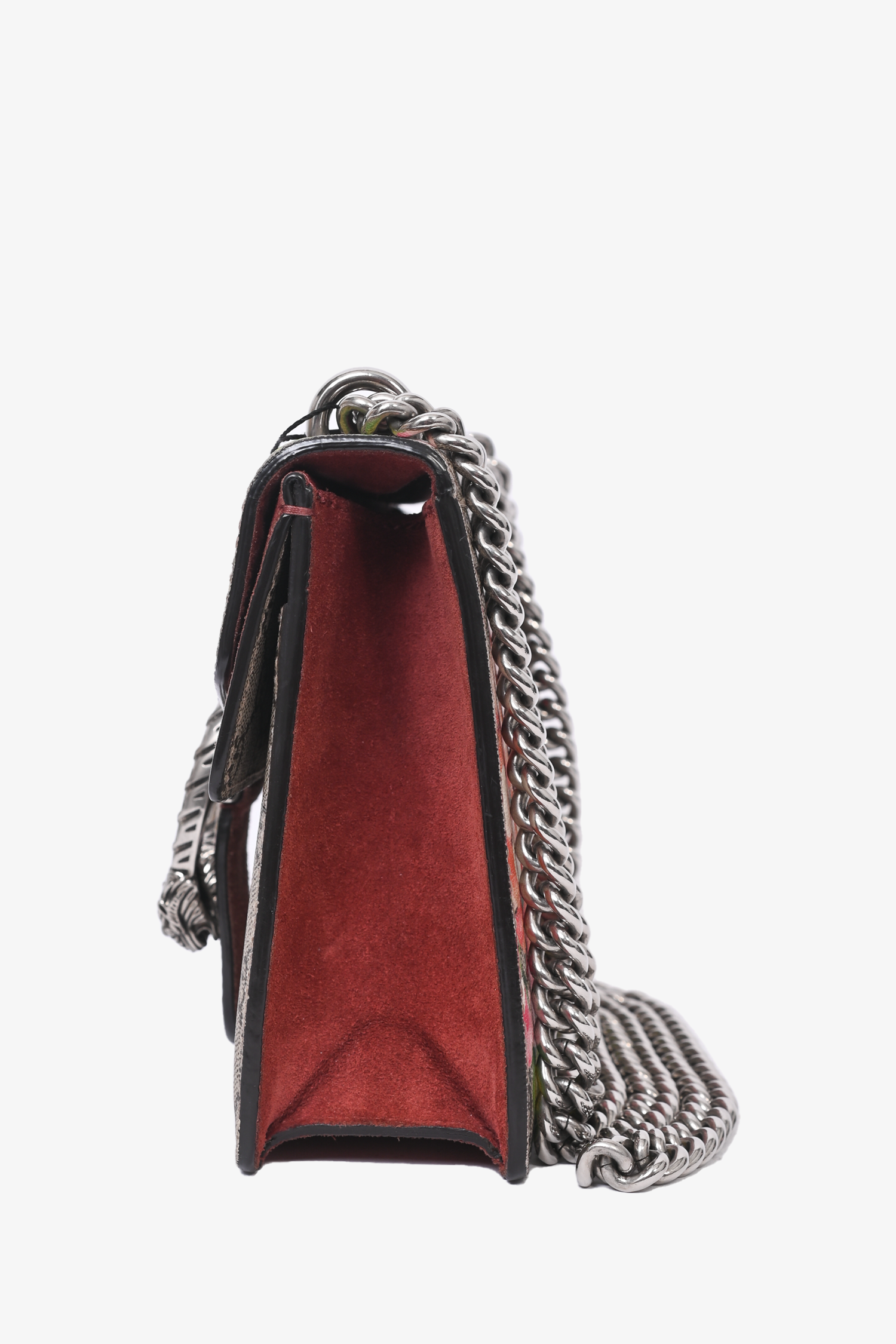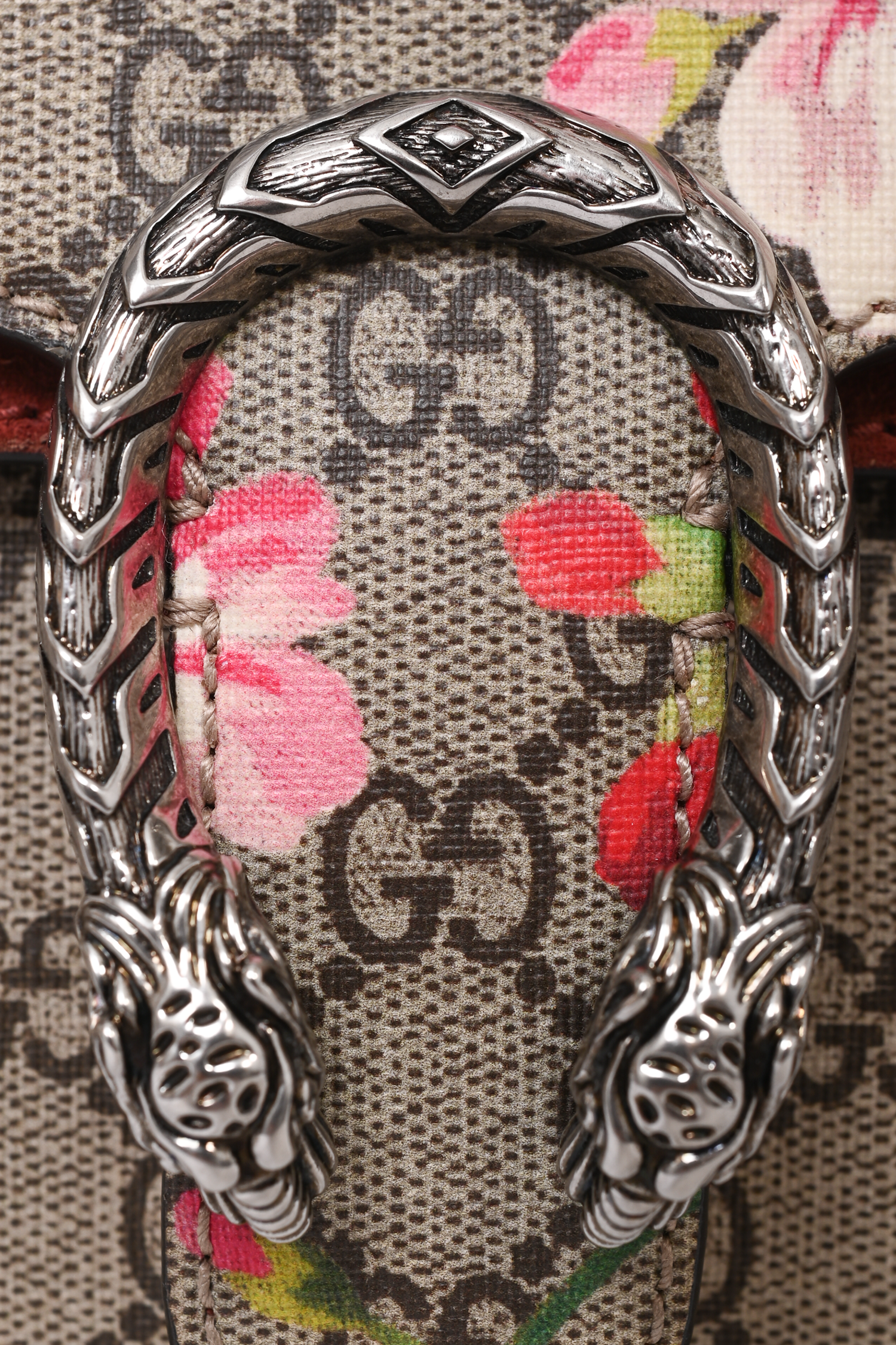 Gucci 'GG' Supreme Blooms Mini Dionysus Shoulder Bag. Fold-over flap with push-lock closure. Dark red/brown suede interior. Slide-around chain. Silver-tone hardware. Tonal stitching.