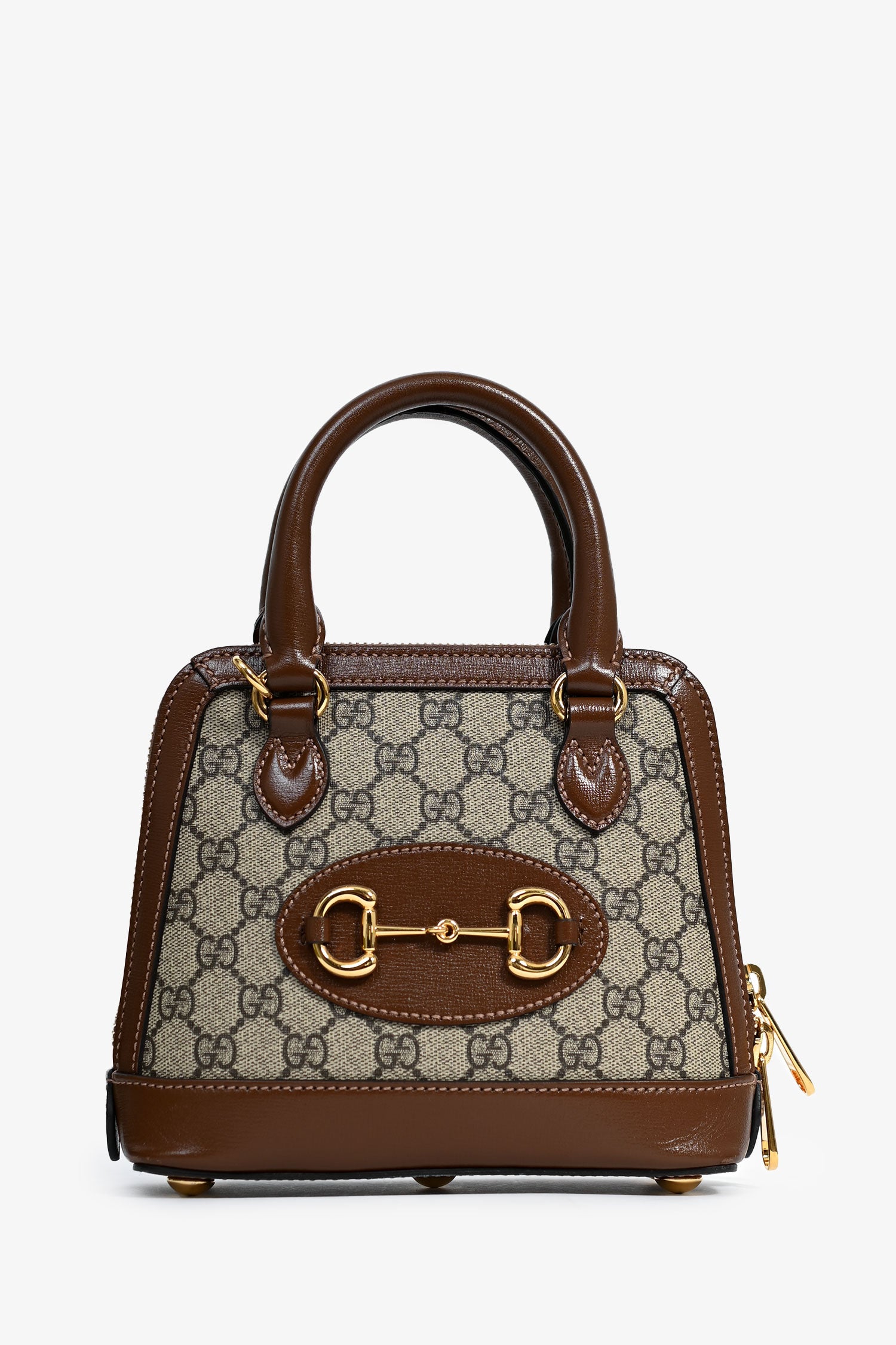 Refresh availabilityGucci GG Supreme Brown Leather 1955 Horsebit Top Handle with Strap. Dual handle. Top zipper closure. Single compartment with a wall slip pocket. Detachable straps. Protective feet on the bottom. Lined. Gold-tone hardware. Tonal stitching.