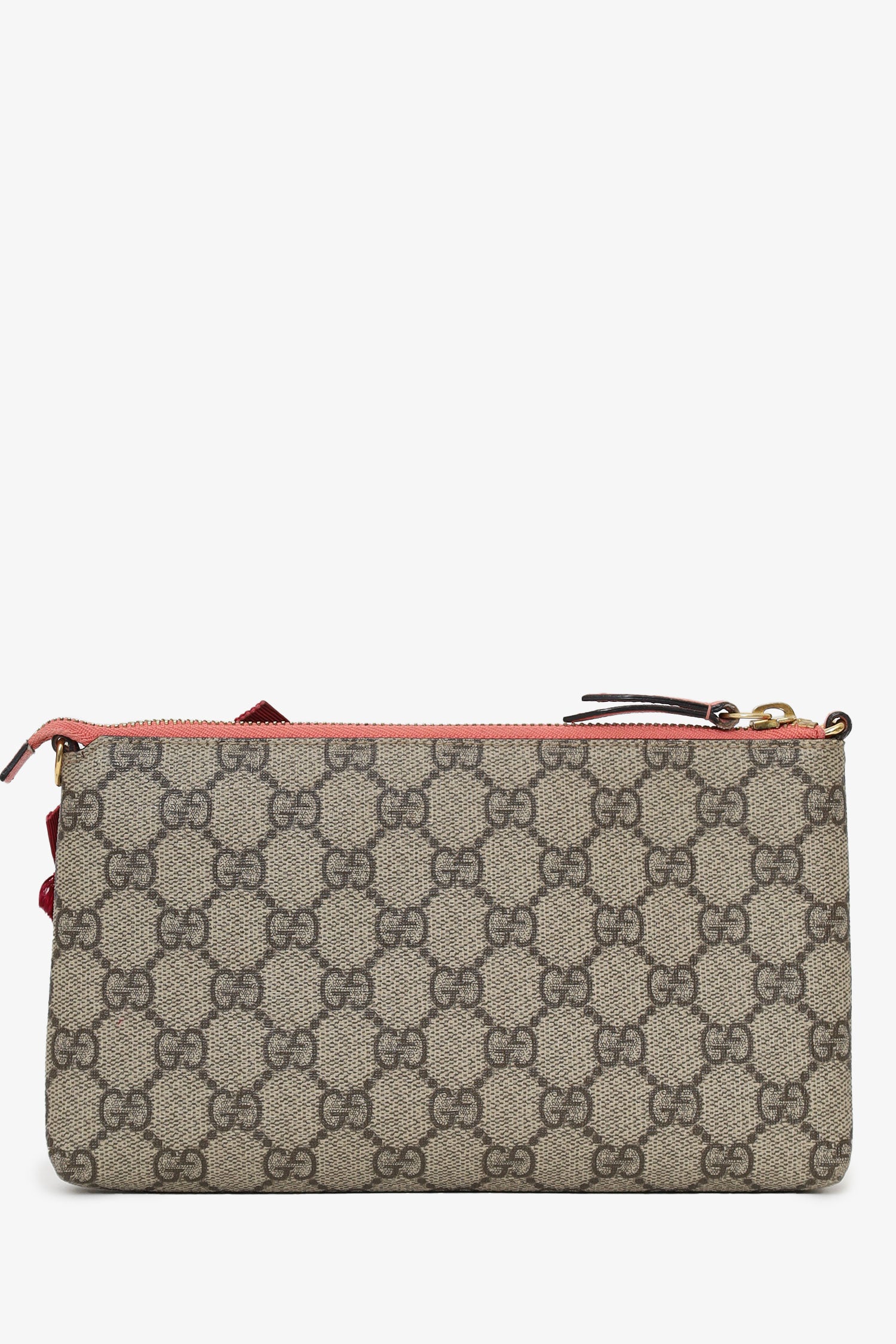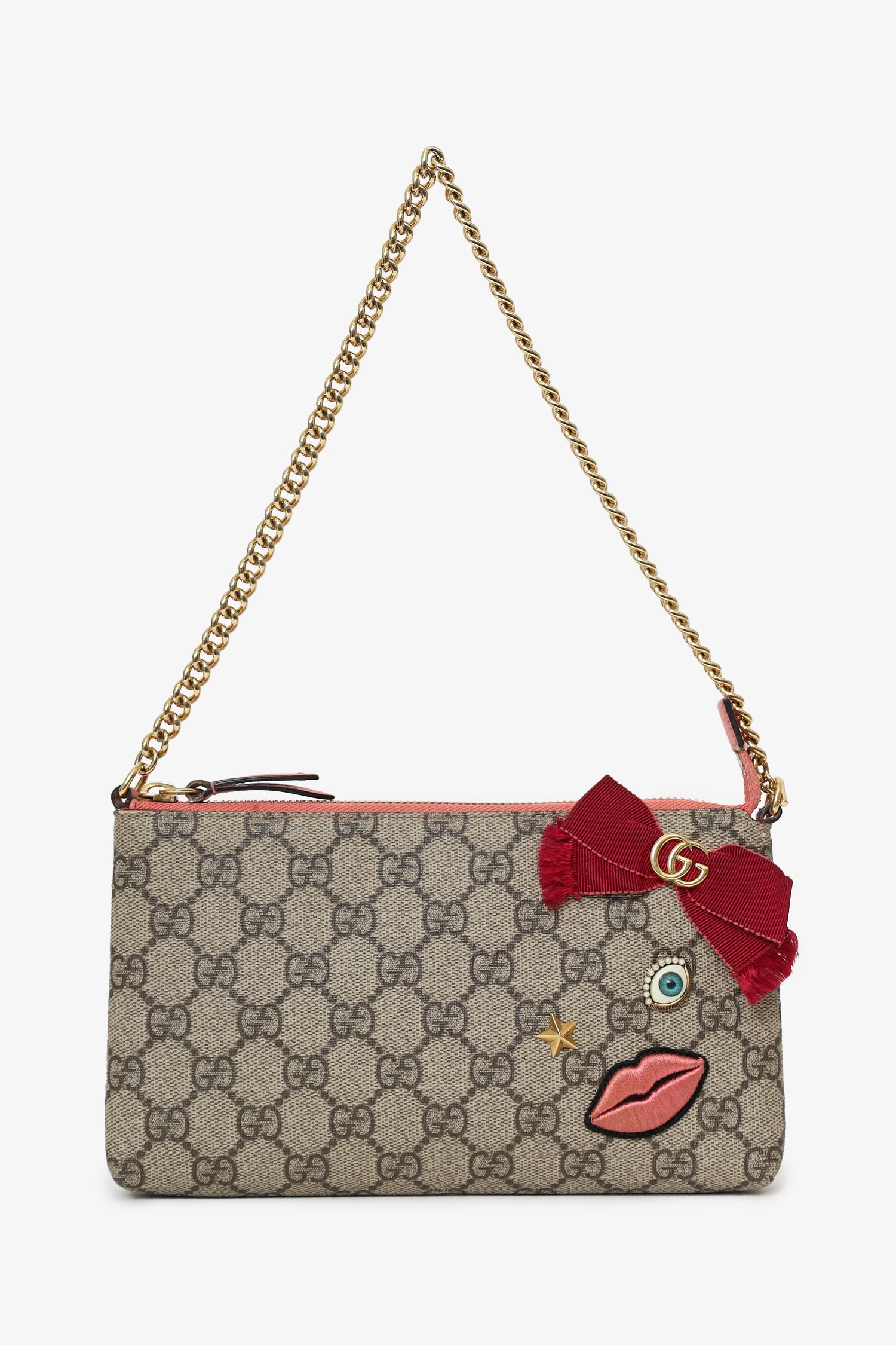 Refresh availabilityGucci GG Supreme Monogram Face Embroidered Wrist Wallet. Top zip closure. Partially-removable chainlink strap. Leather-lined interior. 6 interior card slots and 1 zip compartment. Gold-tone hardware. Tonal stitching.
