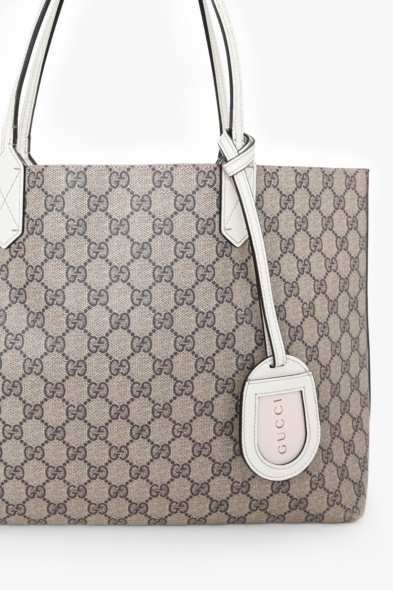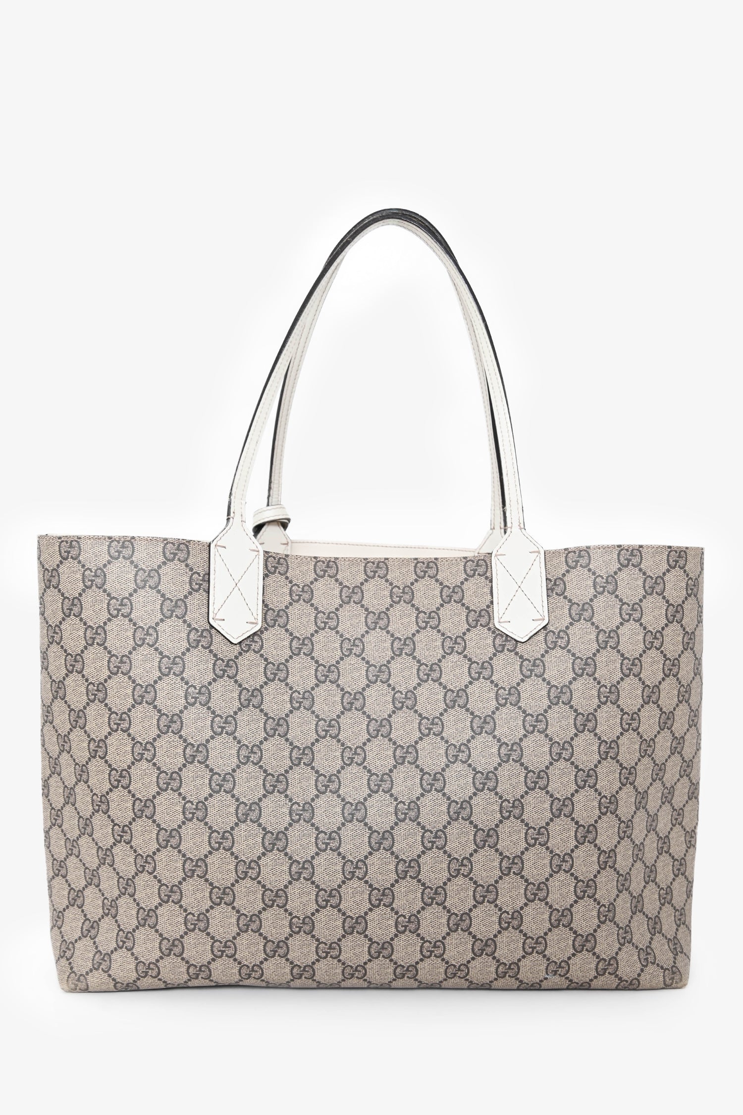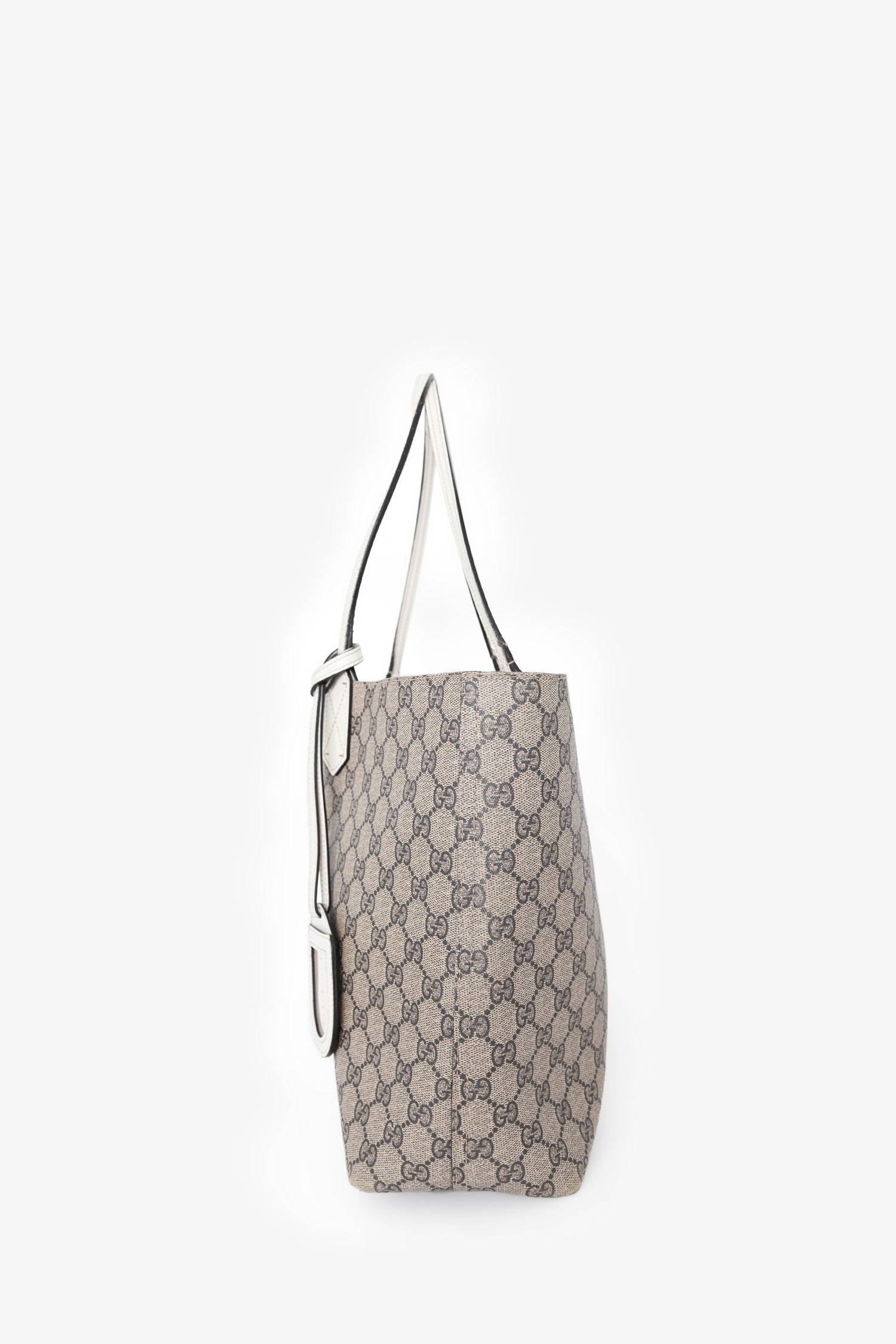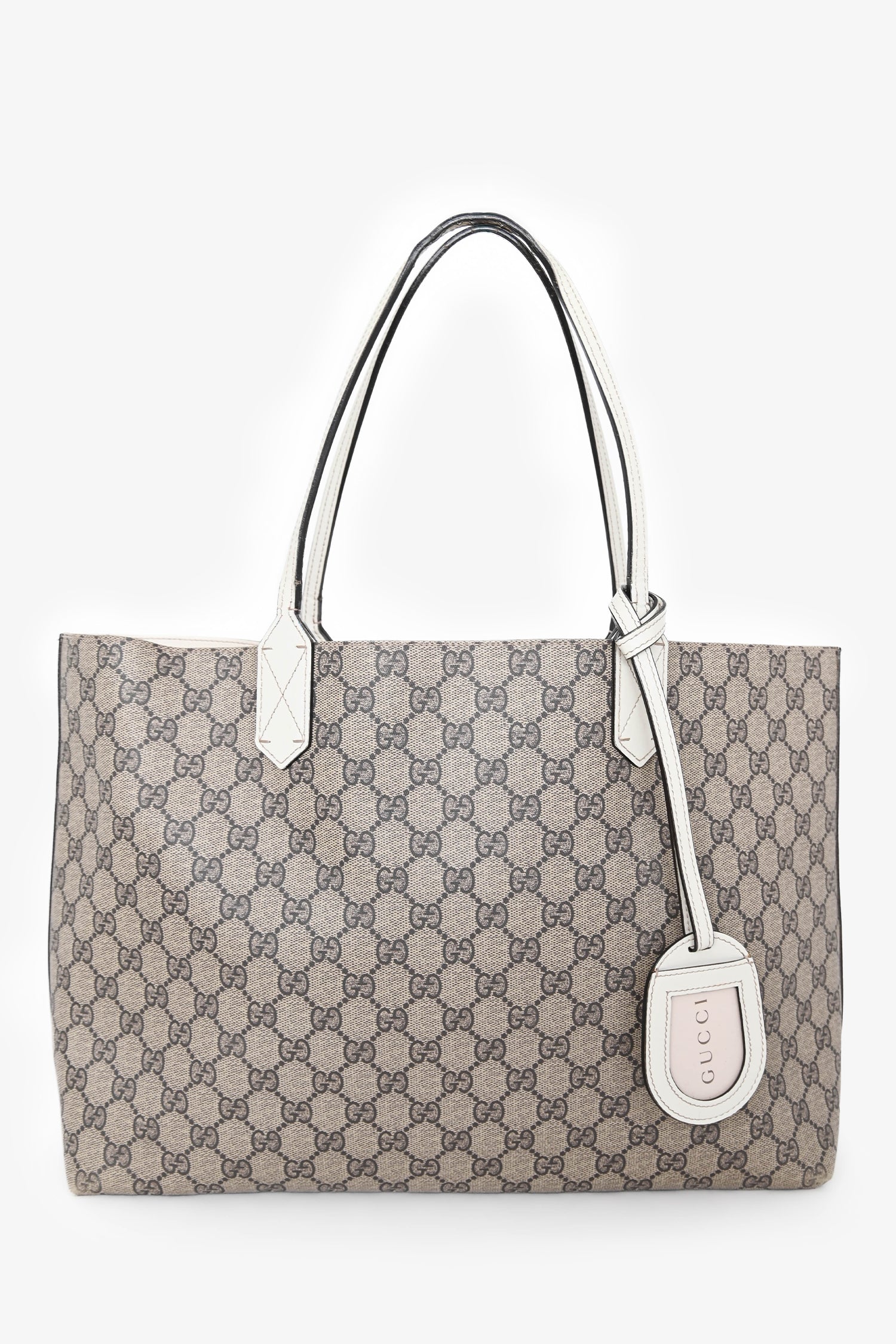 Refresh availabilityGucci GG Supreme/Cream Leather Reversible Tote. Open top. Twin shoulder straps. Single interior compartment. Detachable luggage tag on the exterior. Tonal and contrast stitching.