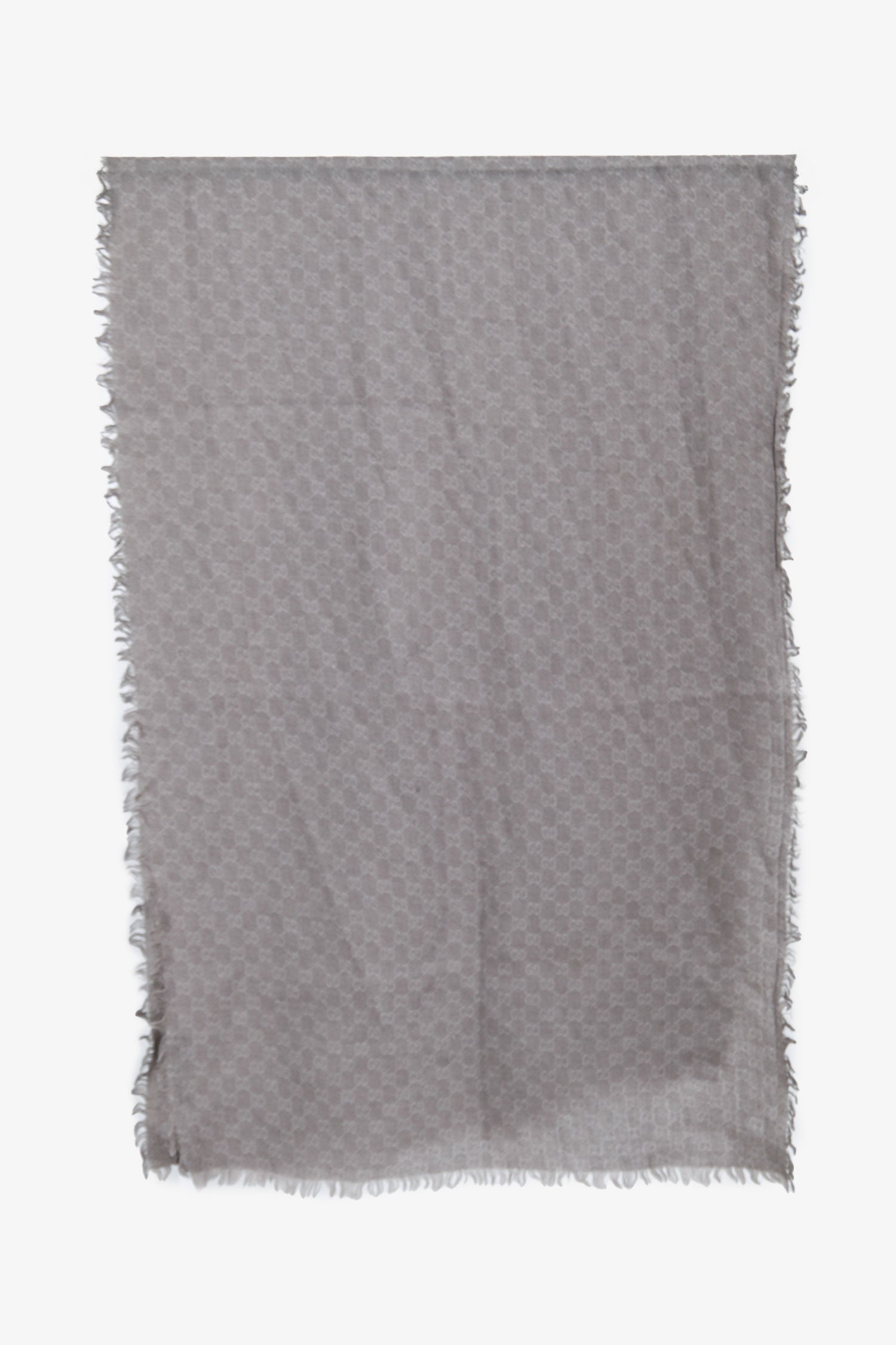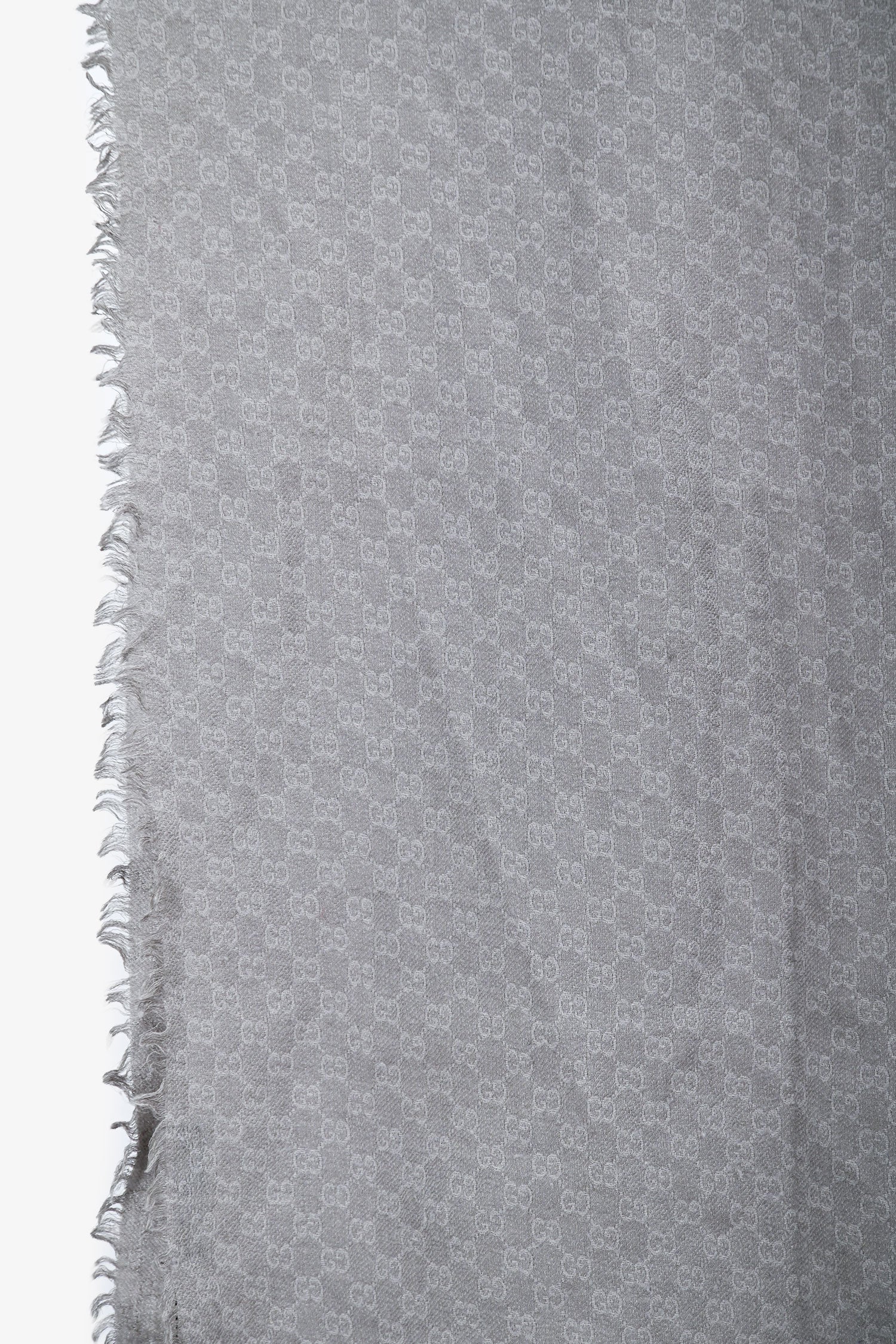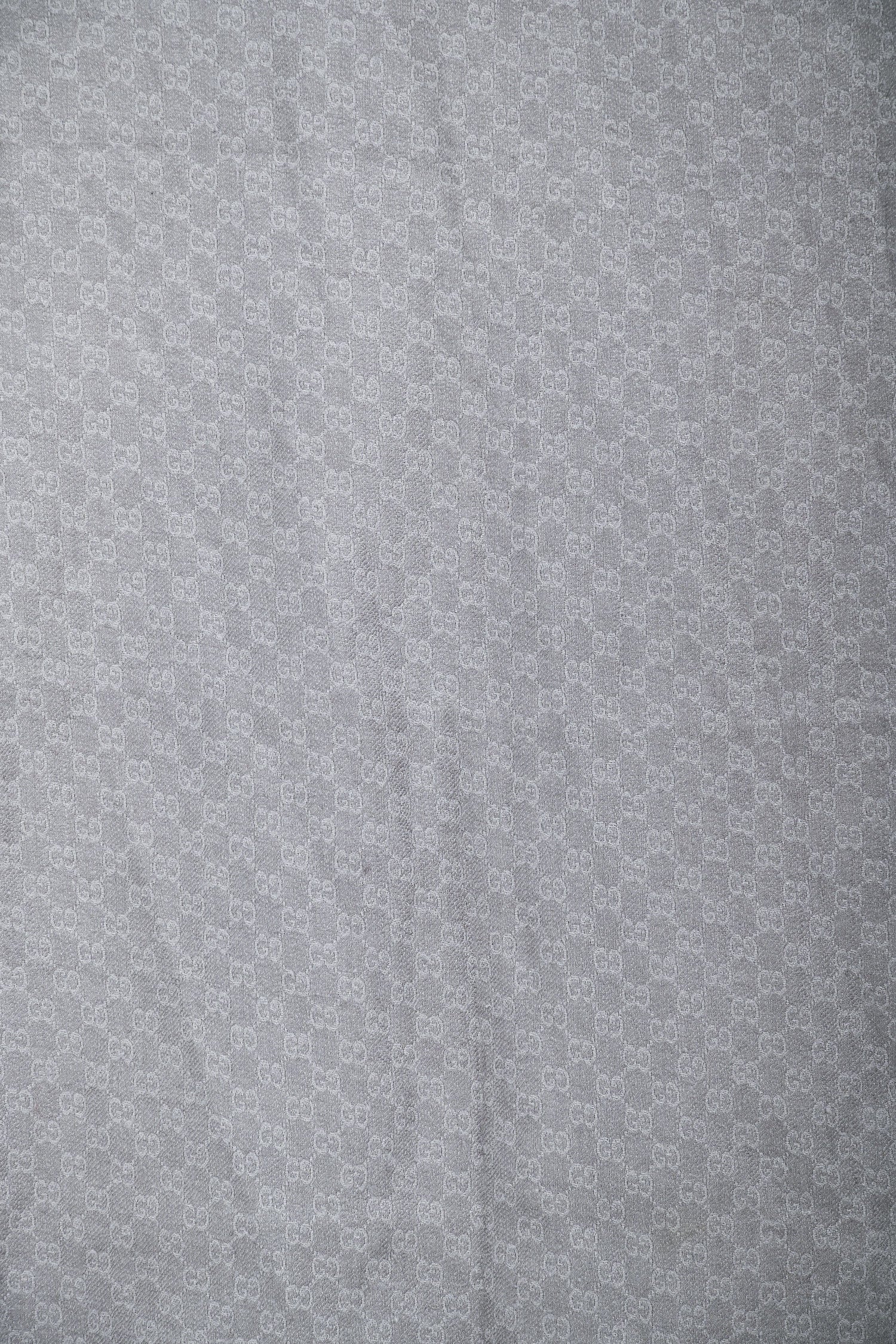 Refresh availabilityGucci Gray Wool/Silk GG Jacquard Monogram Scarf. Tonal stitching. Frayed edges.
