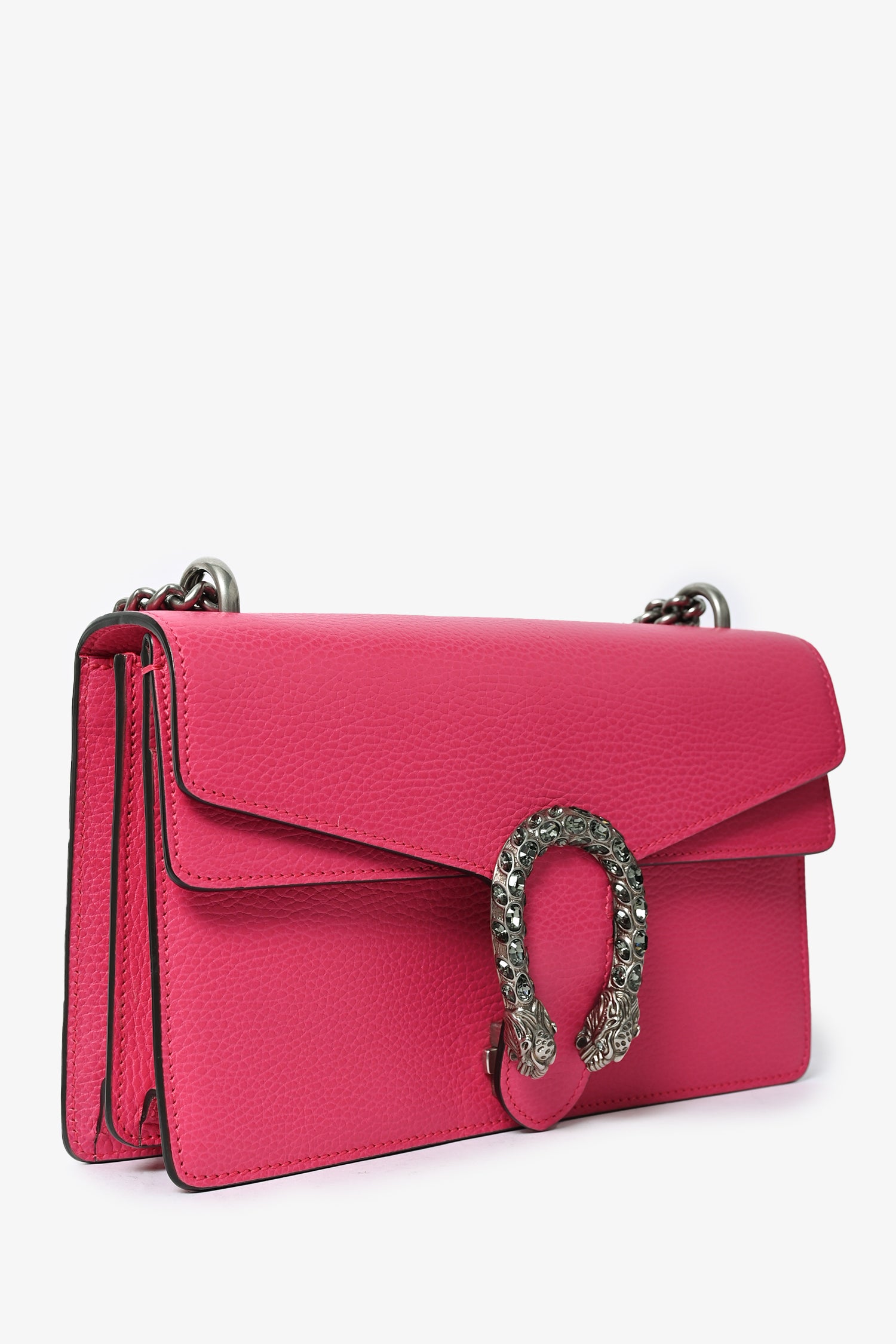 Refresh availabilityGucci Hot Pink Leather Dionysus Small Shoulder Bag. Tonal stitching. Leather trimming. Chain-link shoulder strap. Embellished front. Push-lock closure. Silver-toned hardware. 2 interior compartments. 1 zippered compartment. Front pocket with flap. Canvas lined interior.