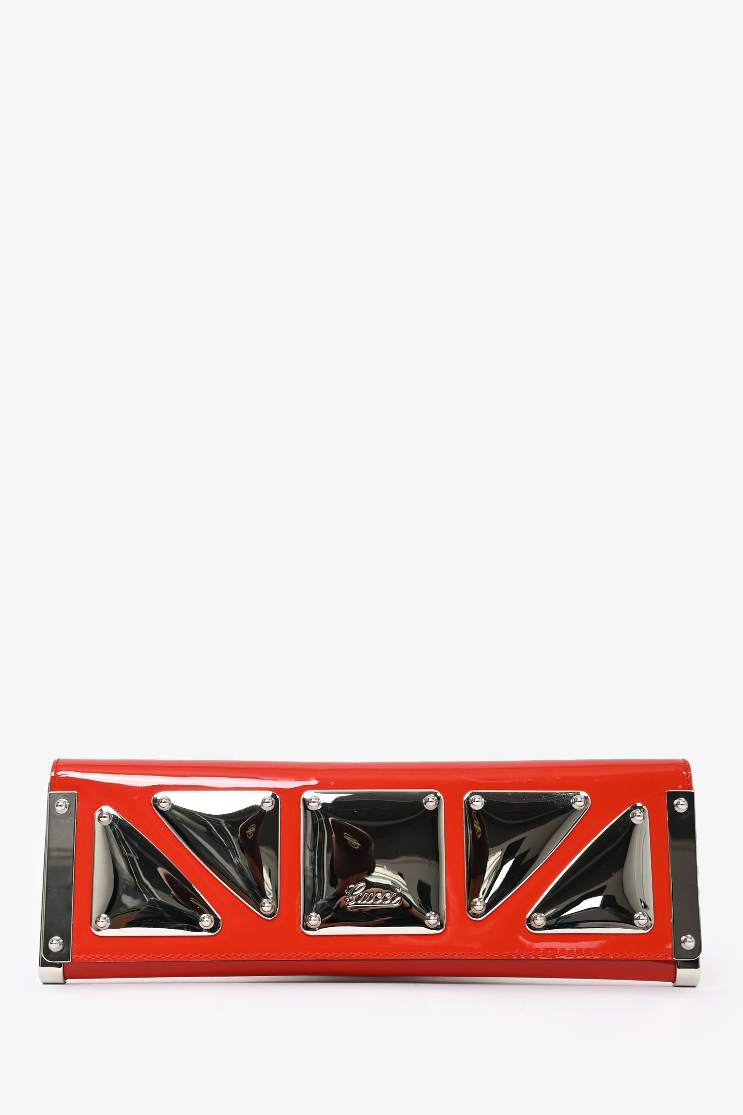 Refresh availabilityGucci Red/Silver Toned Patented Leather Plated Clutch. Front flap magnetic button closure. Red suede interior lining. Tonal stitching.