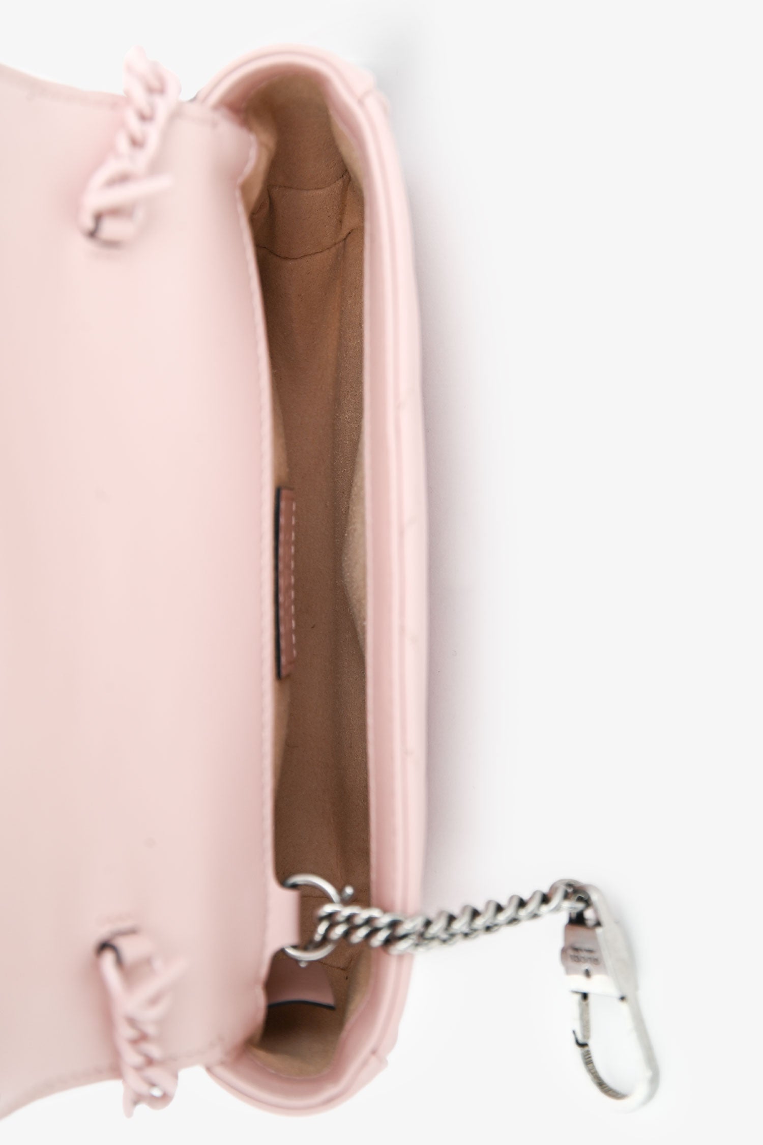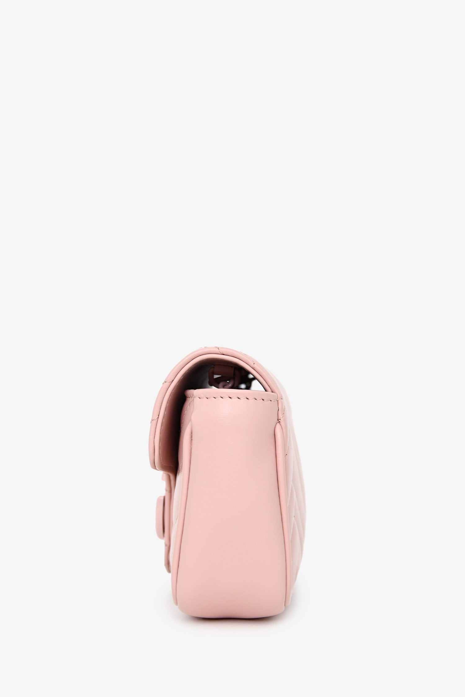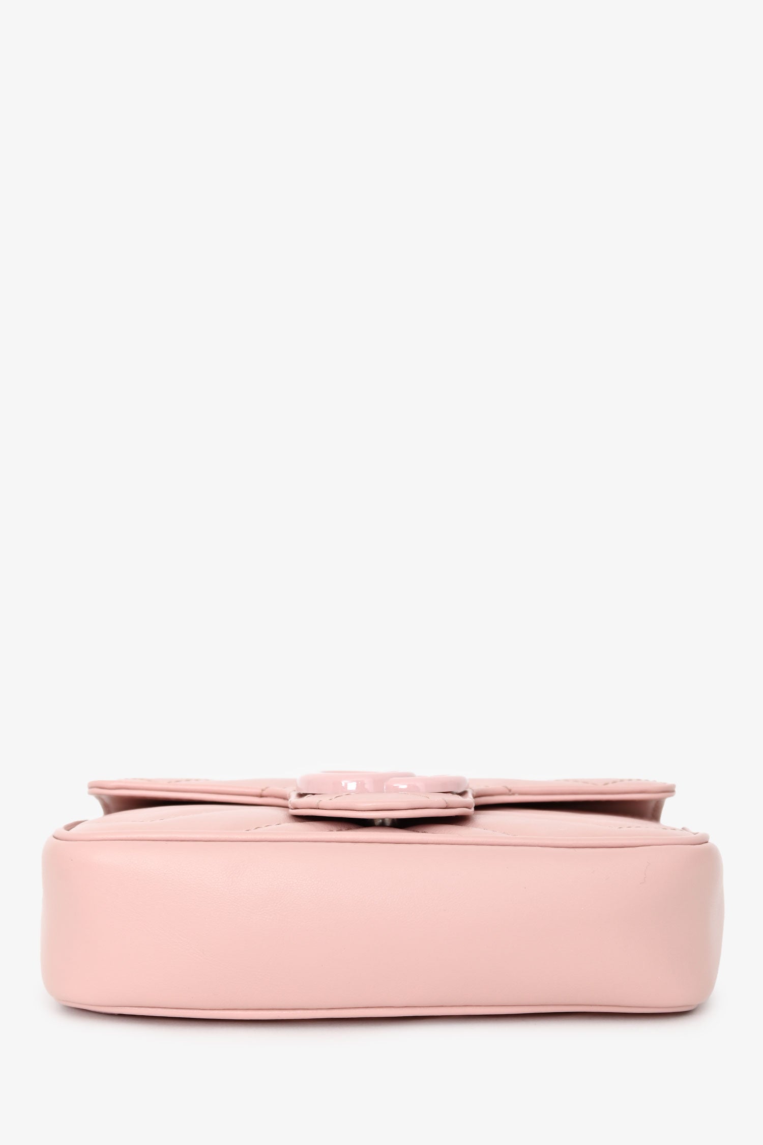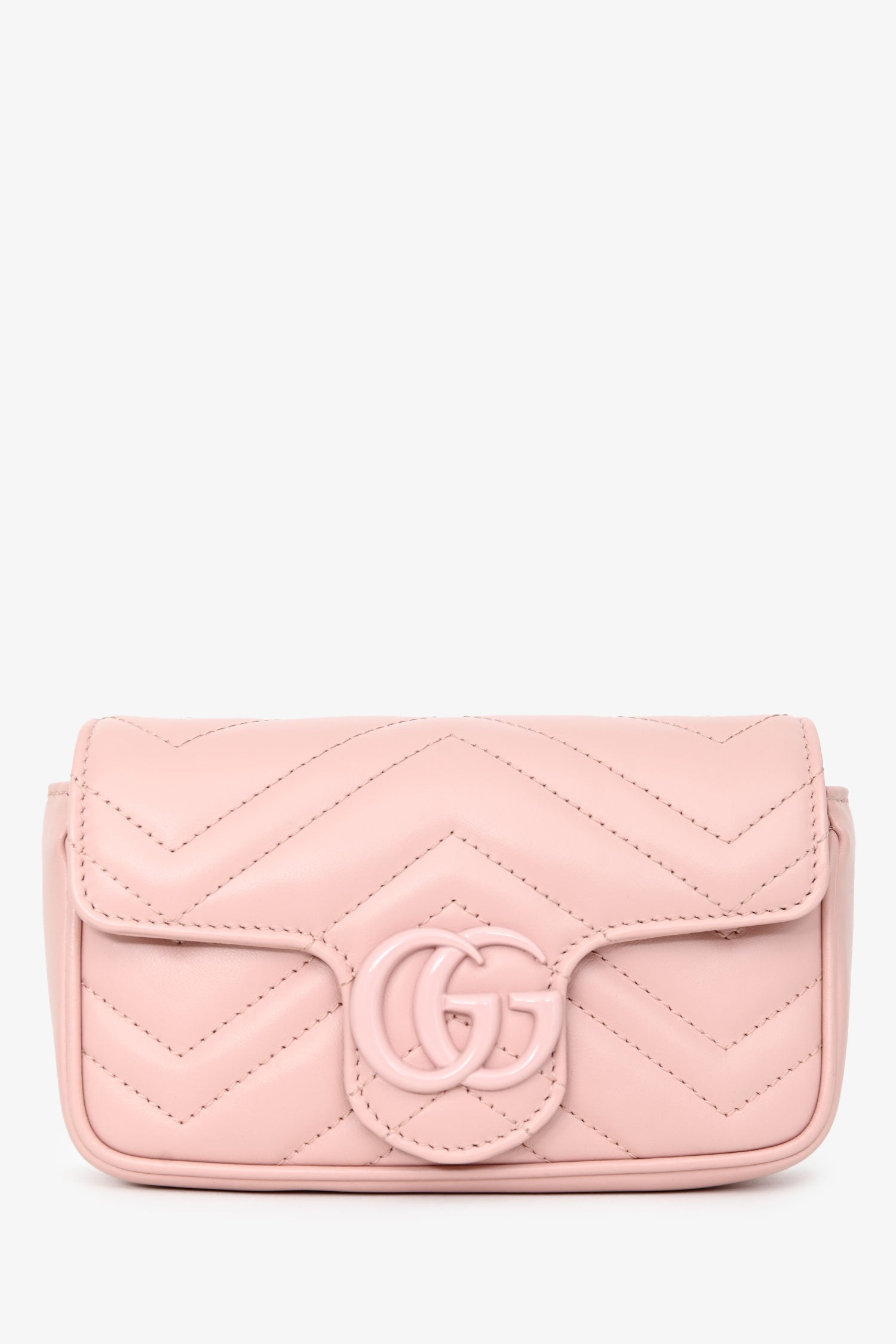 Refresh availabilityGucci Perfect Pink Leather Chevron Quilted Super Mini GG Marmont Belt Bag. Front fold-over flap with snap-button closure. Chain link belt strap. Single interior compartment. Suede-lined interior. Tonal hardware. Tonal stitching.