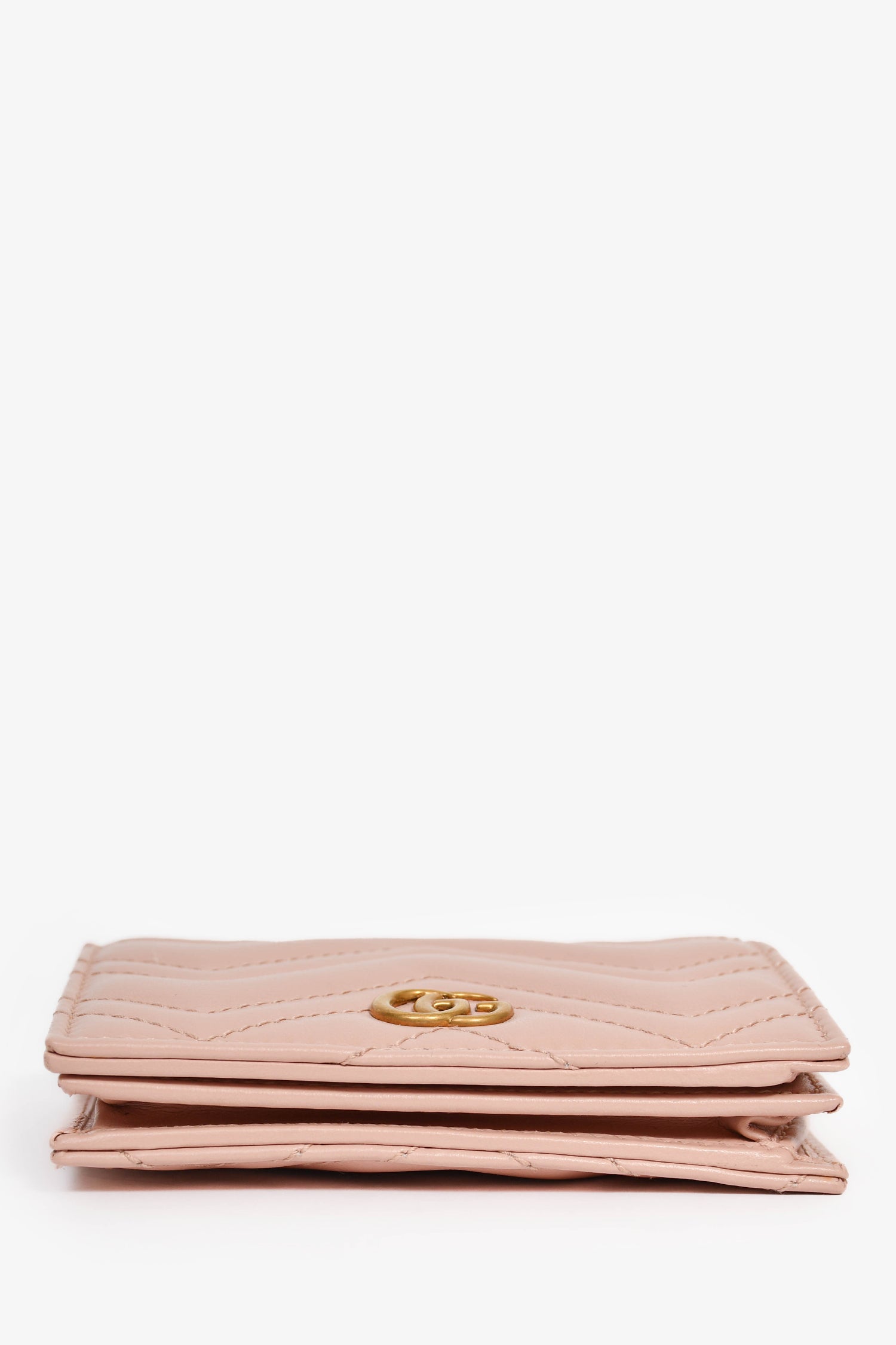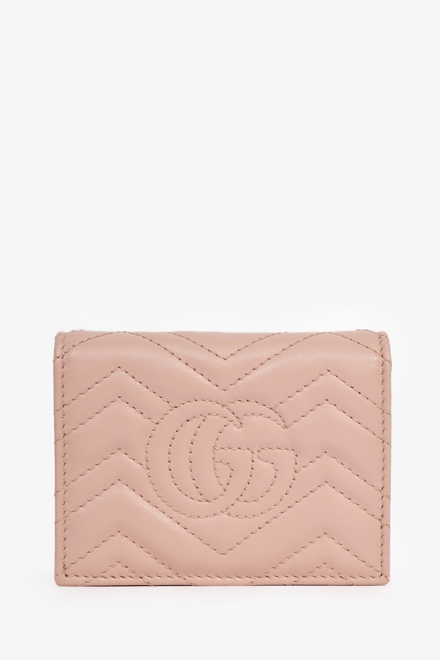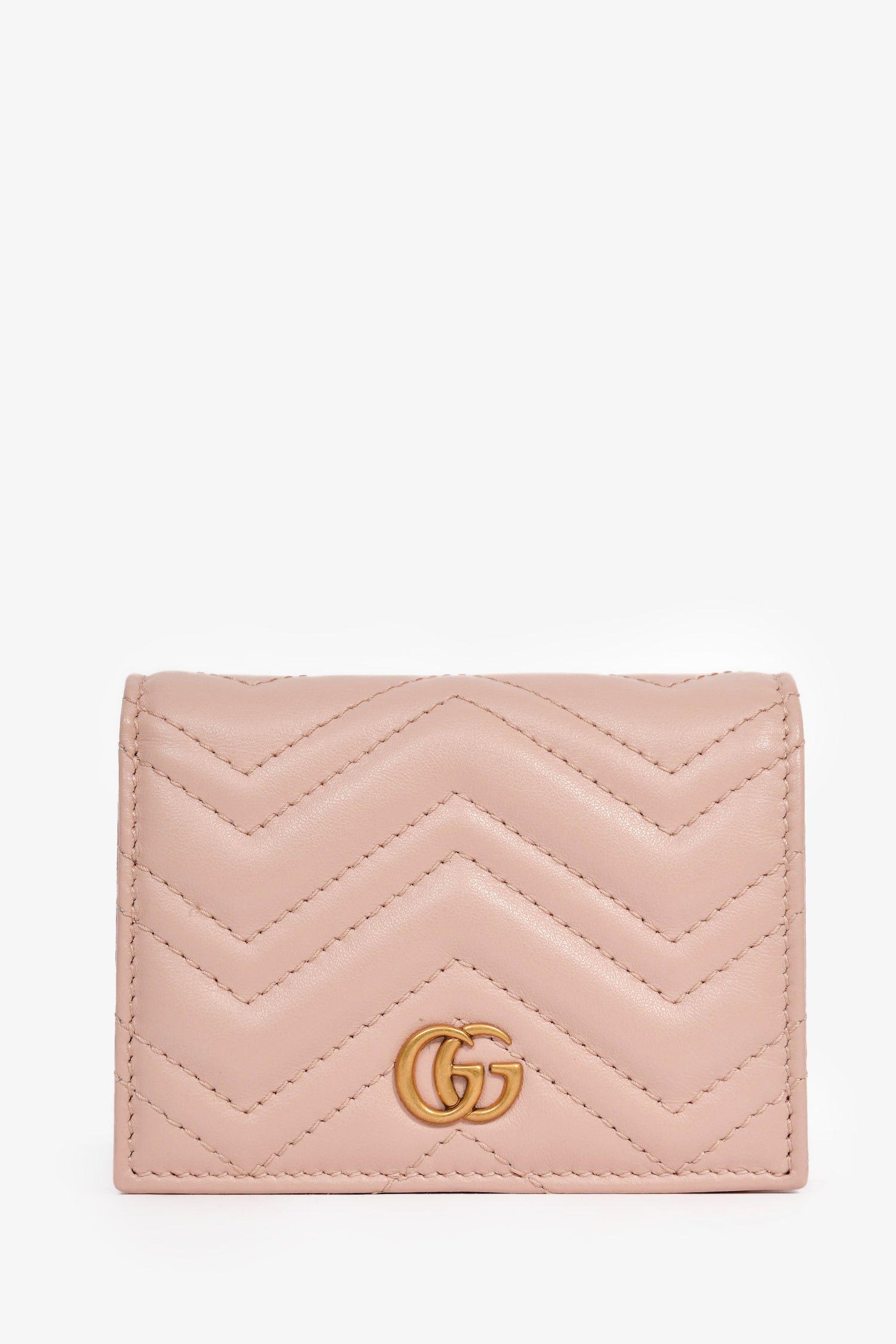 Refresh availabilityGucci Pink Chevron Leather GG Marmont Card Holder. Front fold-over flap with snap-button closure. Six card slots. One zippered coin compartment. Gold-tone hardware.