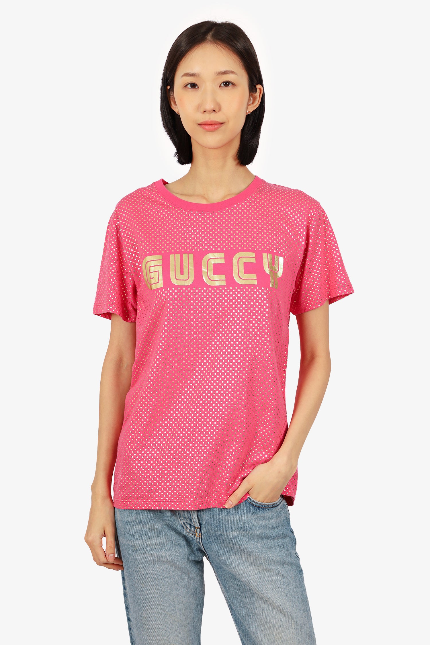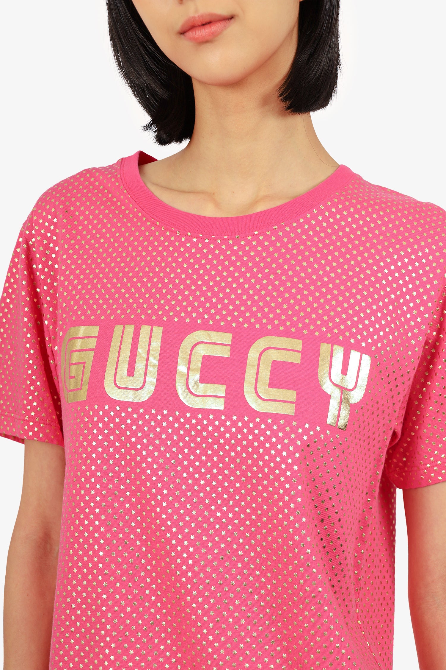 Refresh availabilityGucci Pink/Gold Star Printed 'Guccy' T-shirt. Pull-on. Round neckline. Short-sleeve. Tonal stitching.