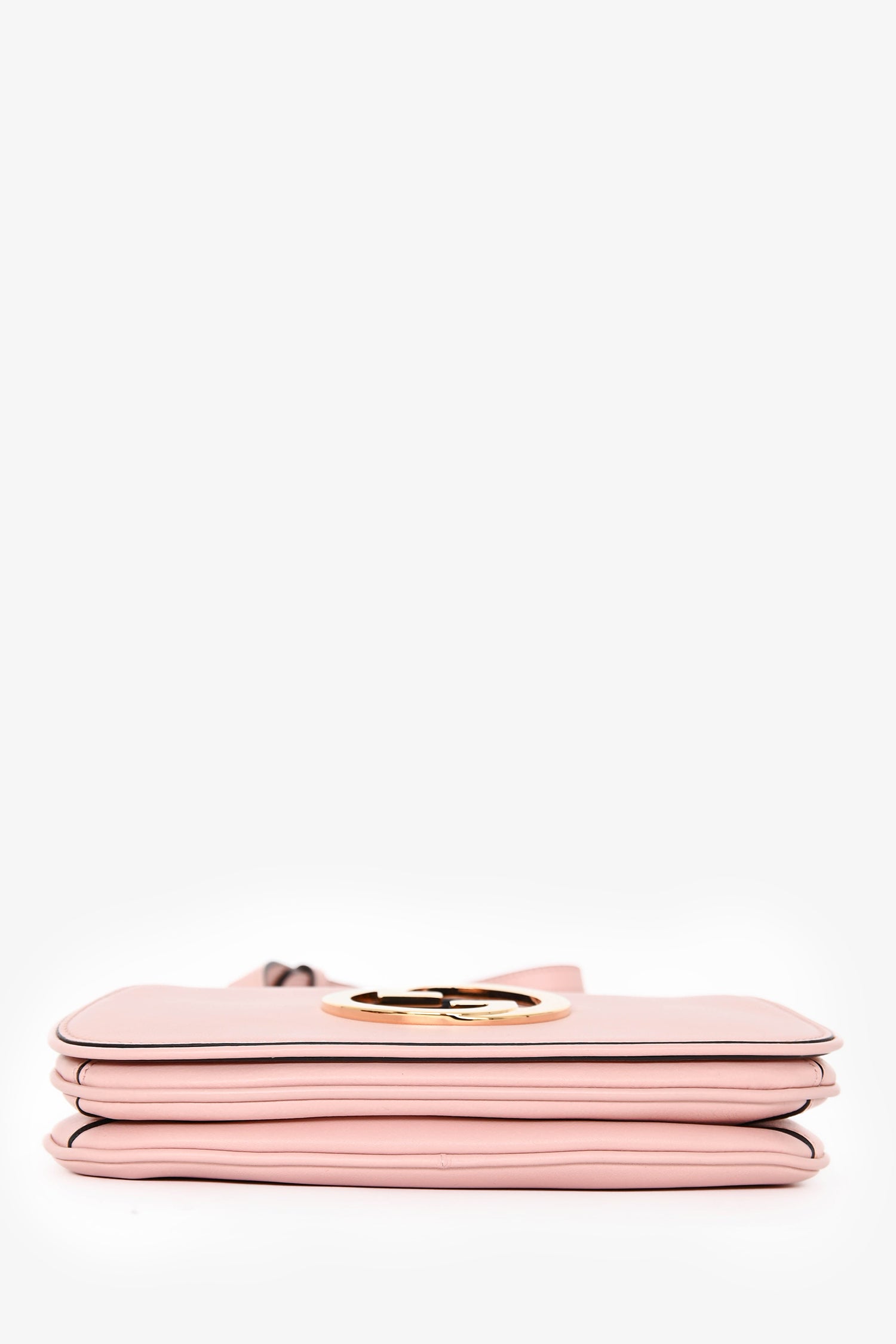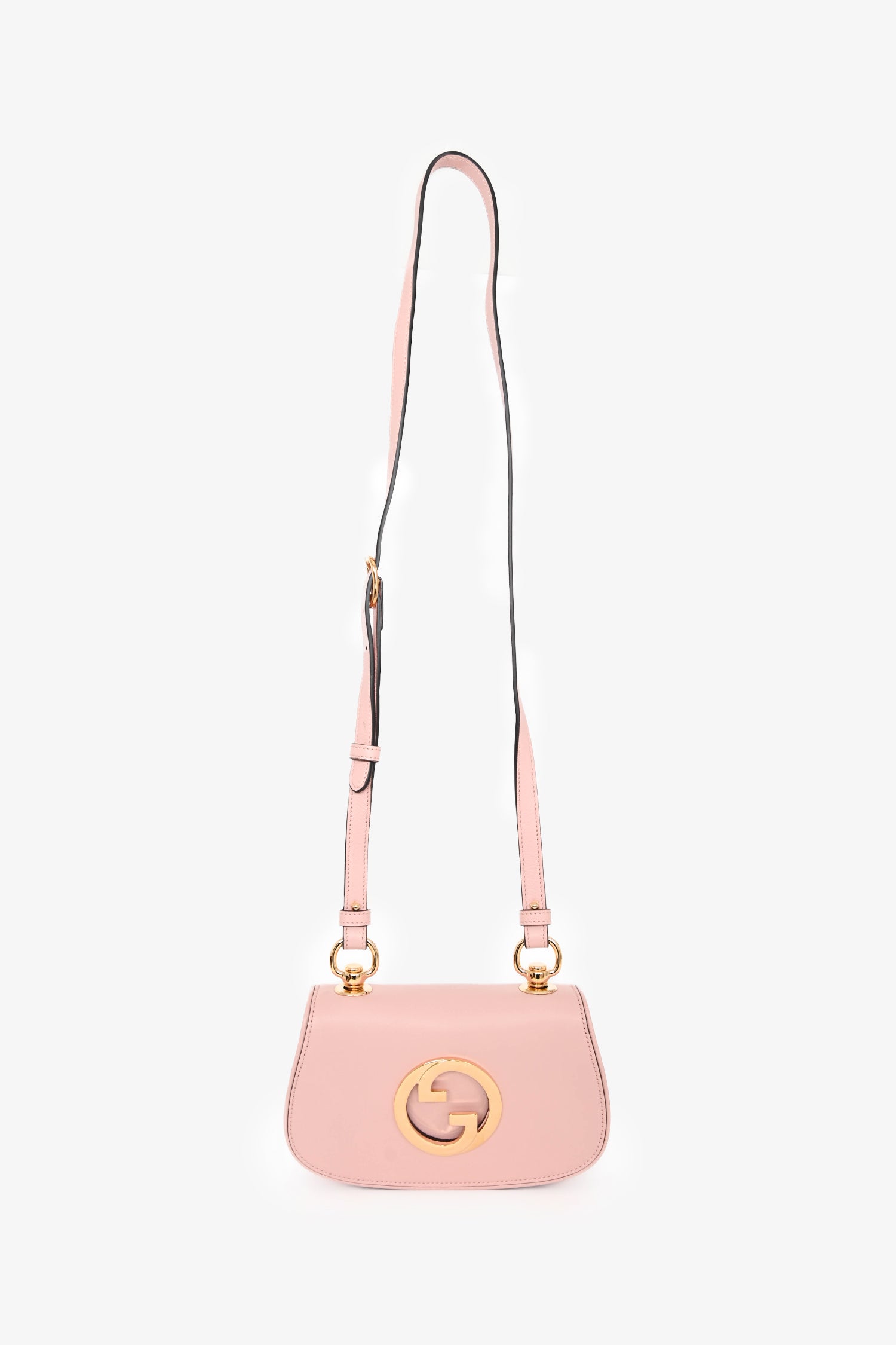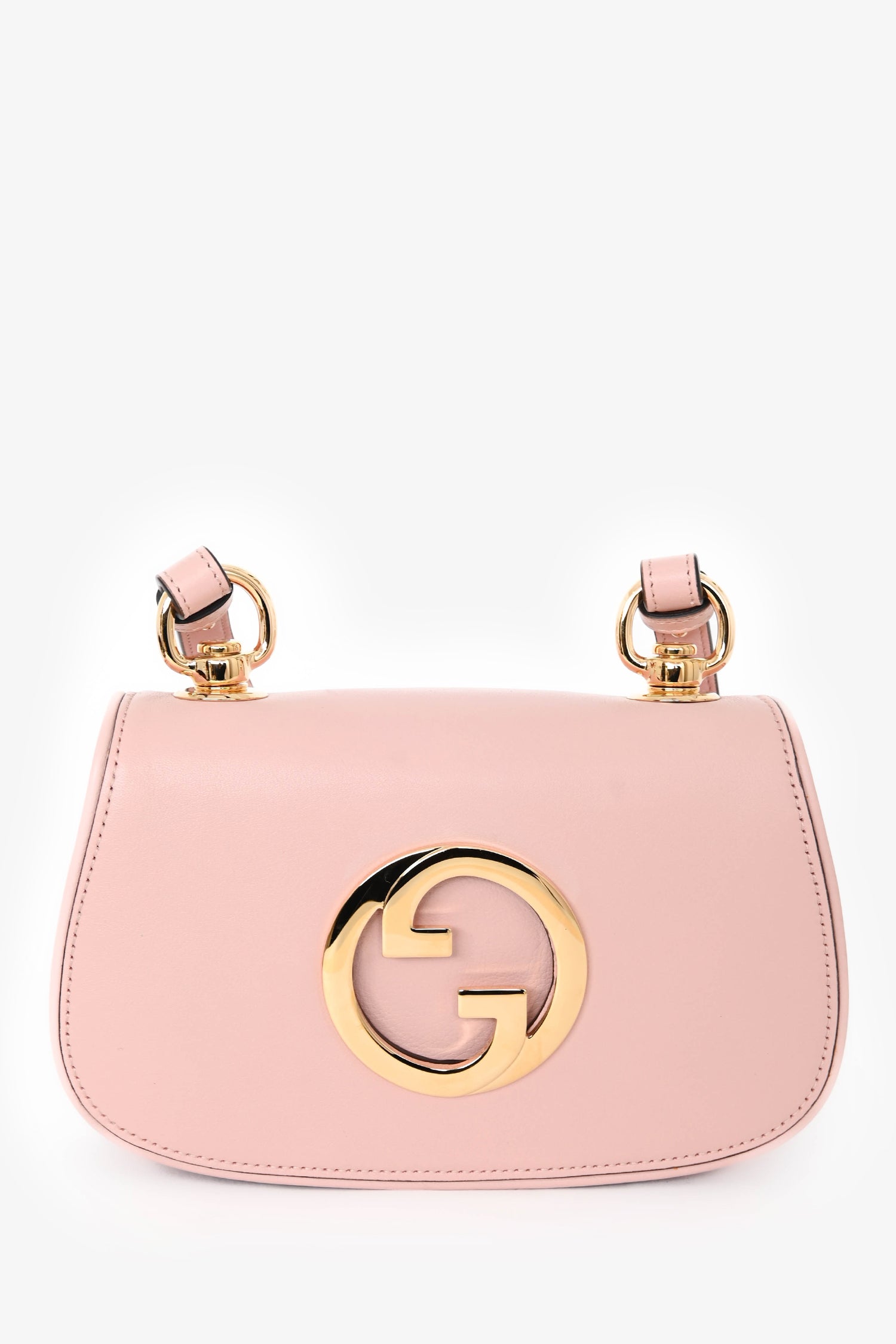 Refresh availabilityGucci Pink Leather Mini 'Blondie' Crossbody Bag with Web Canvas Strap. Front fold-over flap with magnetic closure. 2 adjustable and detachable crossbody straps. Leather-lined interior. 2 interior compartments. Single wall slip pocket. Gold-tone hardware. Tonal stitching.