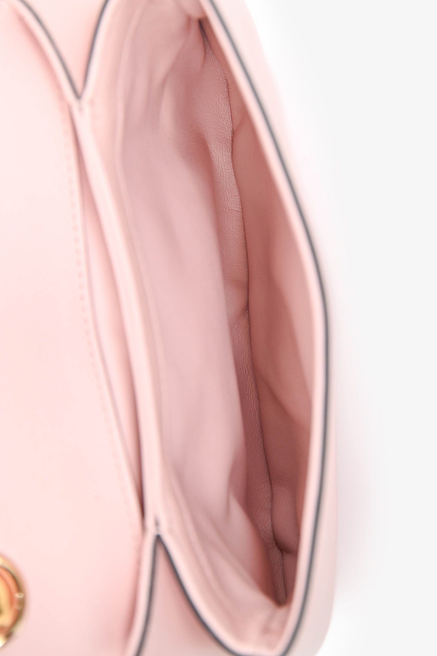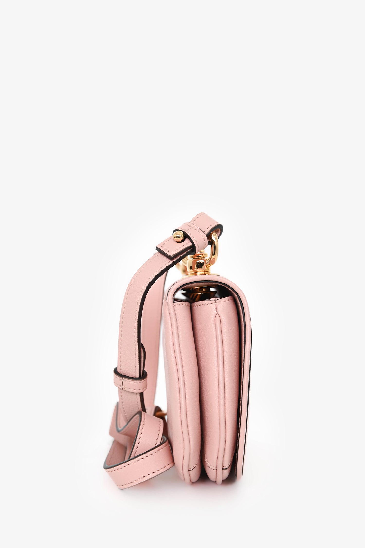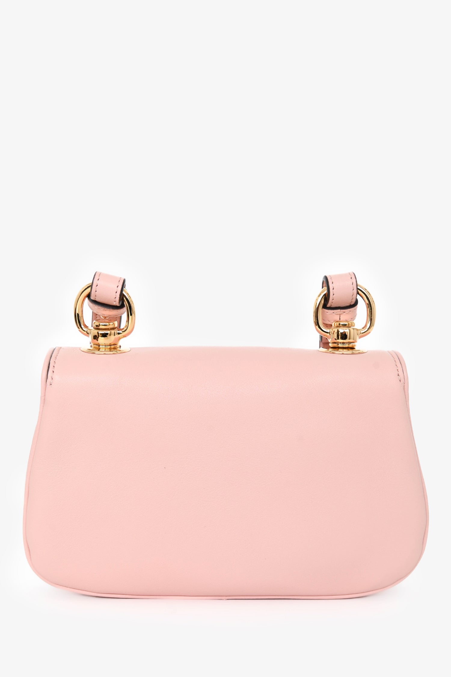 Refresh availabilityGucci Pink Leather Mini 'Blondie' Crossbody Bag with Web Canvas Strap. Front fold-over flap with magnetic closure. 2 adjustable and detachable crossbody straps. Leather-lined interior. 2 interior compartments. Single wall slip pocket. Gold-tone hardware. Tonal stitching.