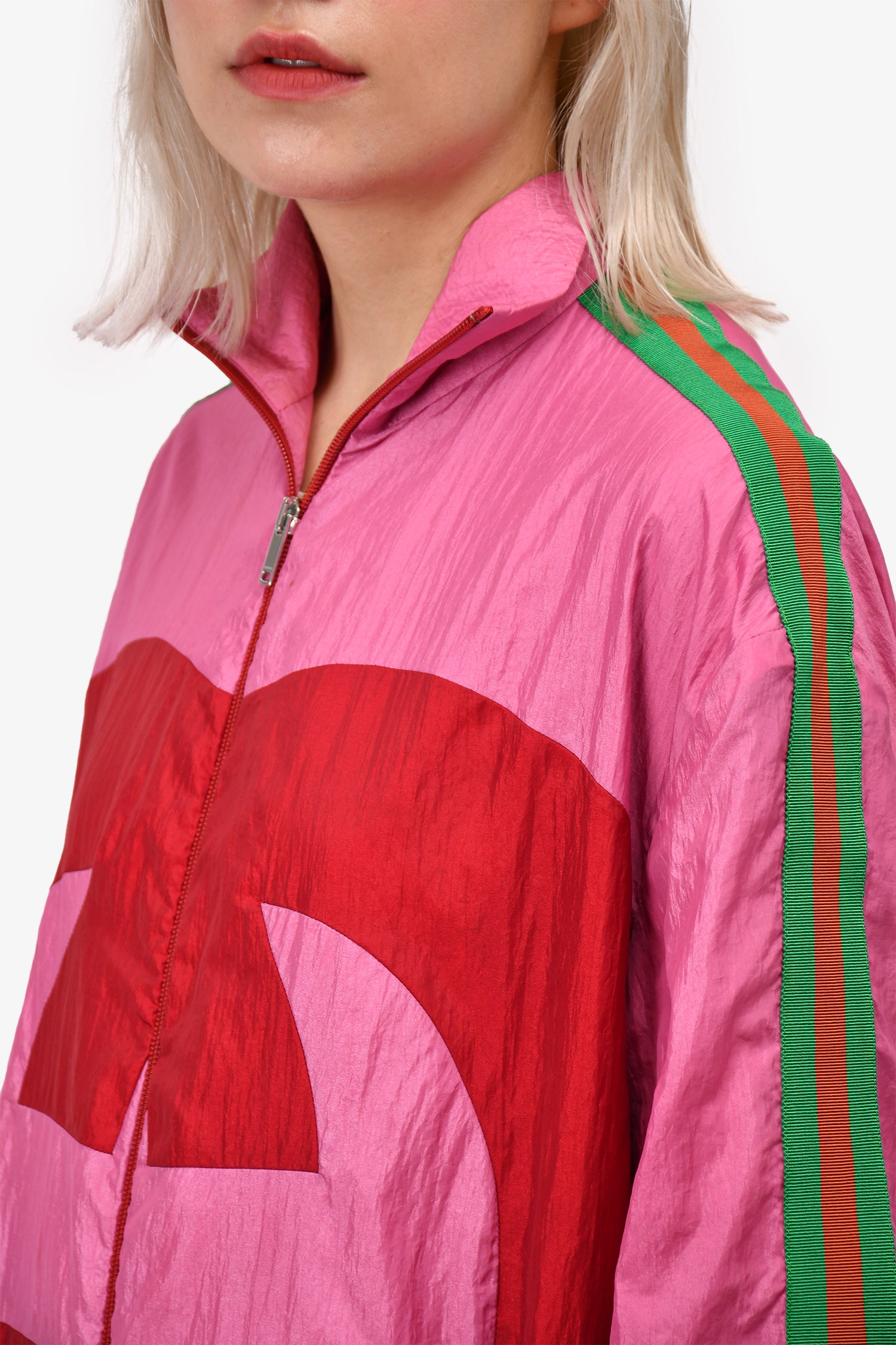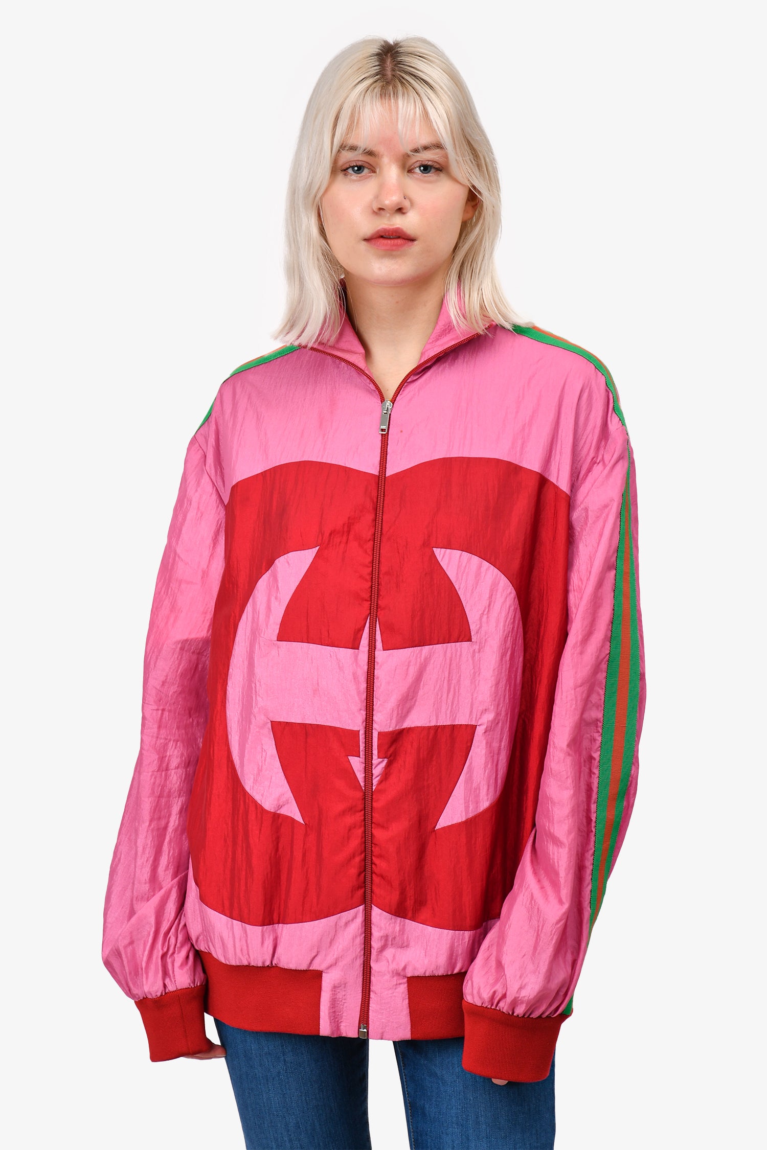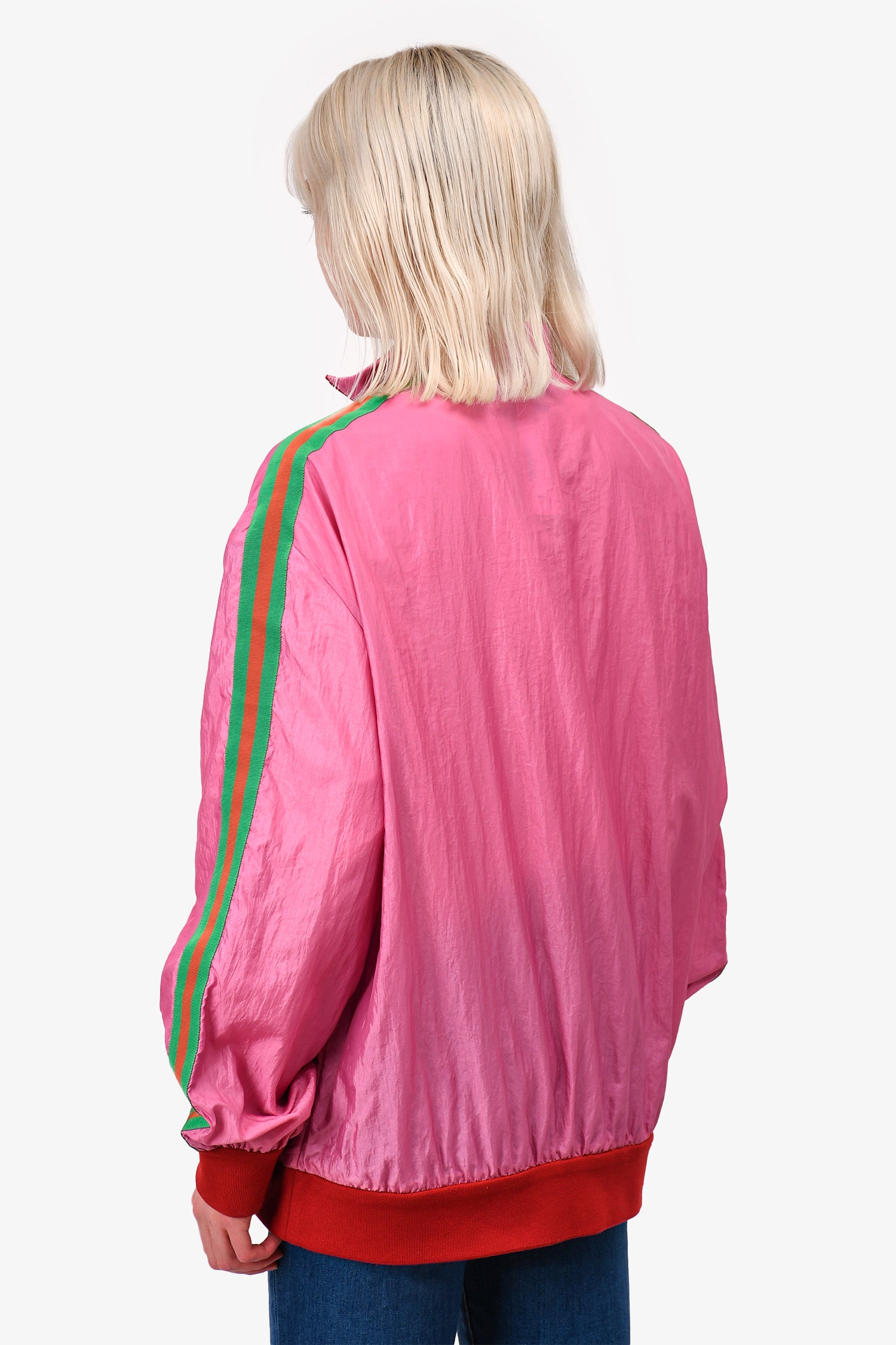 Refresh availabilityGucci Pink/Red Web Nylon Track Zip-Up Jacket. Ribbed cuffs and waistband. Front zip closure. 2 side slip pockets. Tonal stitching. Lined.