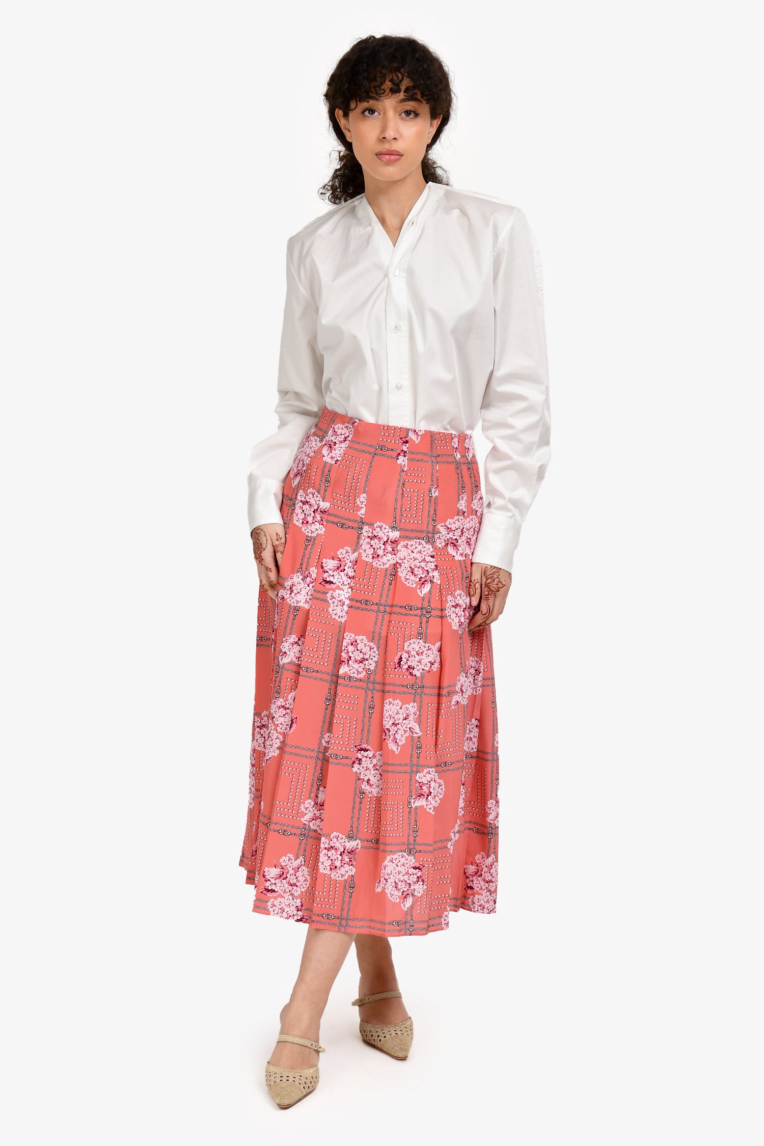 Refresh availabilityGucci Pink Silk Floral Horsebit Print Pleated Skirt. Side zip closure. Unlined. Tonal stitching.