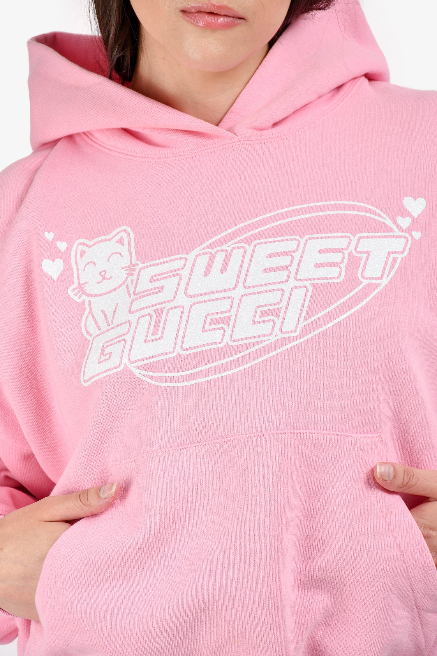 Gucci Pink 'Sweet Gucci' Printed Hoodie. Long sleeves with ribbed cuffs. Kangaroo pocket. Ribbed hem. Tonal stitching.