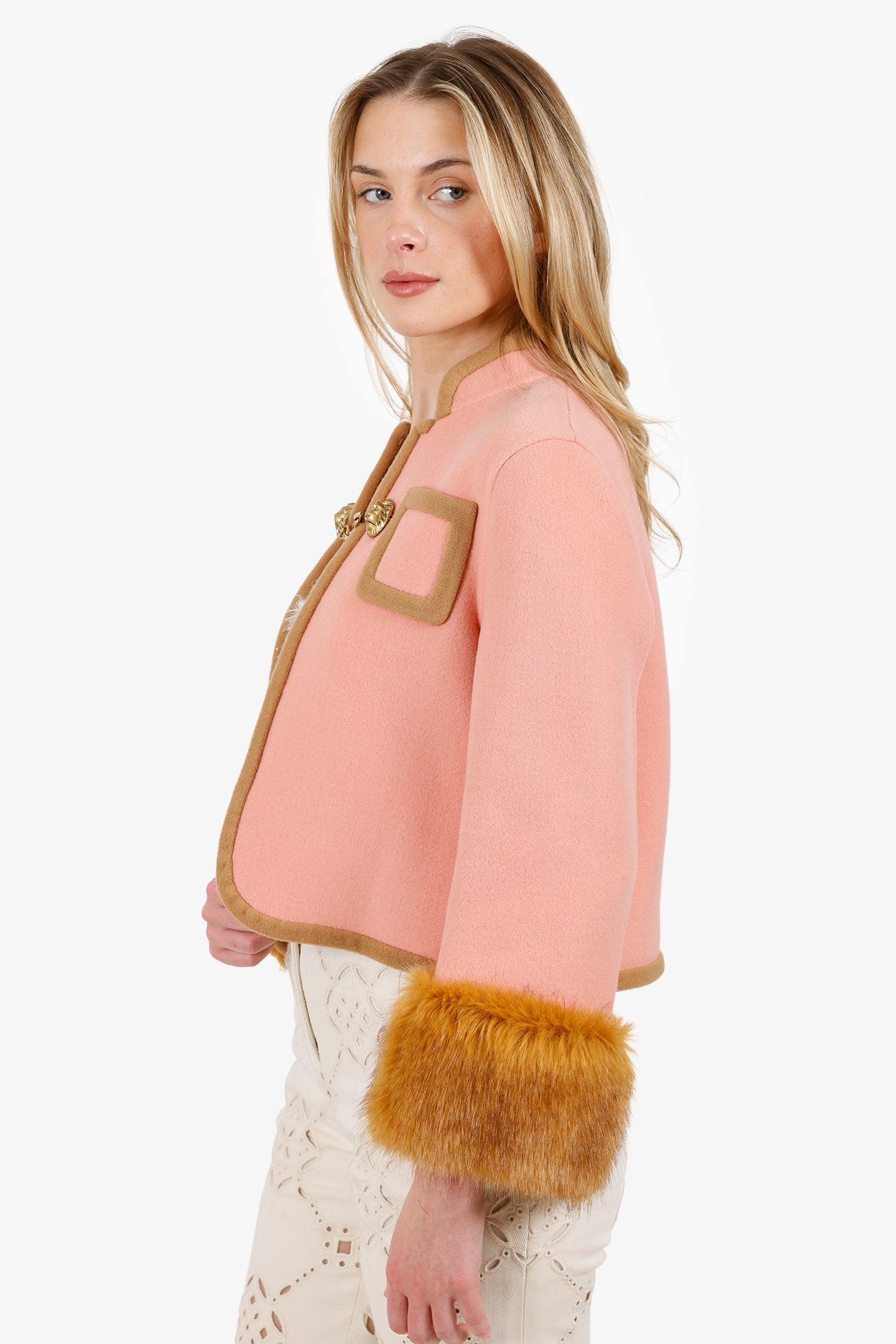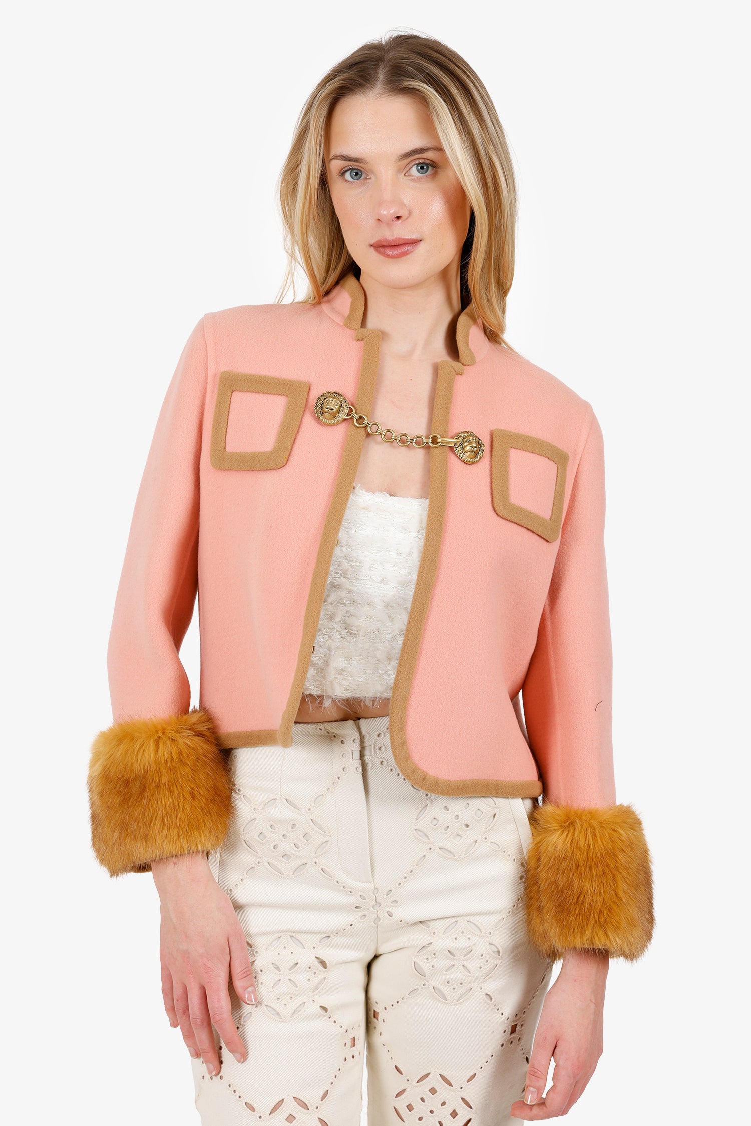 Refresh availabilityGucci Pink Wool Lion Head Buckle Detail Coat With Fur. Pull-on. Front hook closure. 2 exterior chest slip pockets. Gold-tone hardware. Tonal stitching.