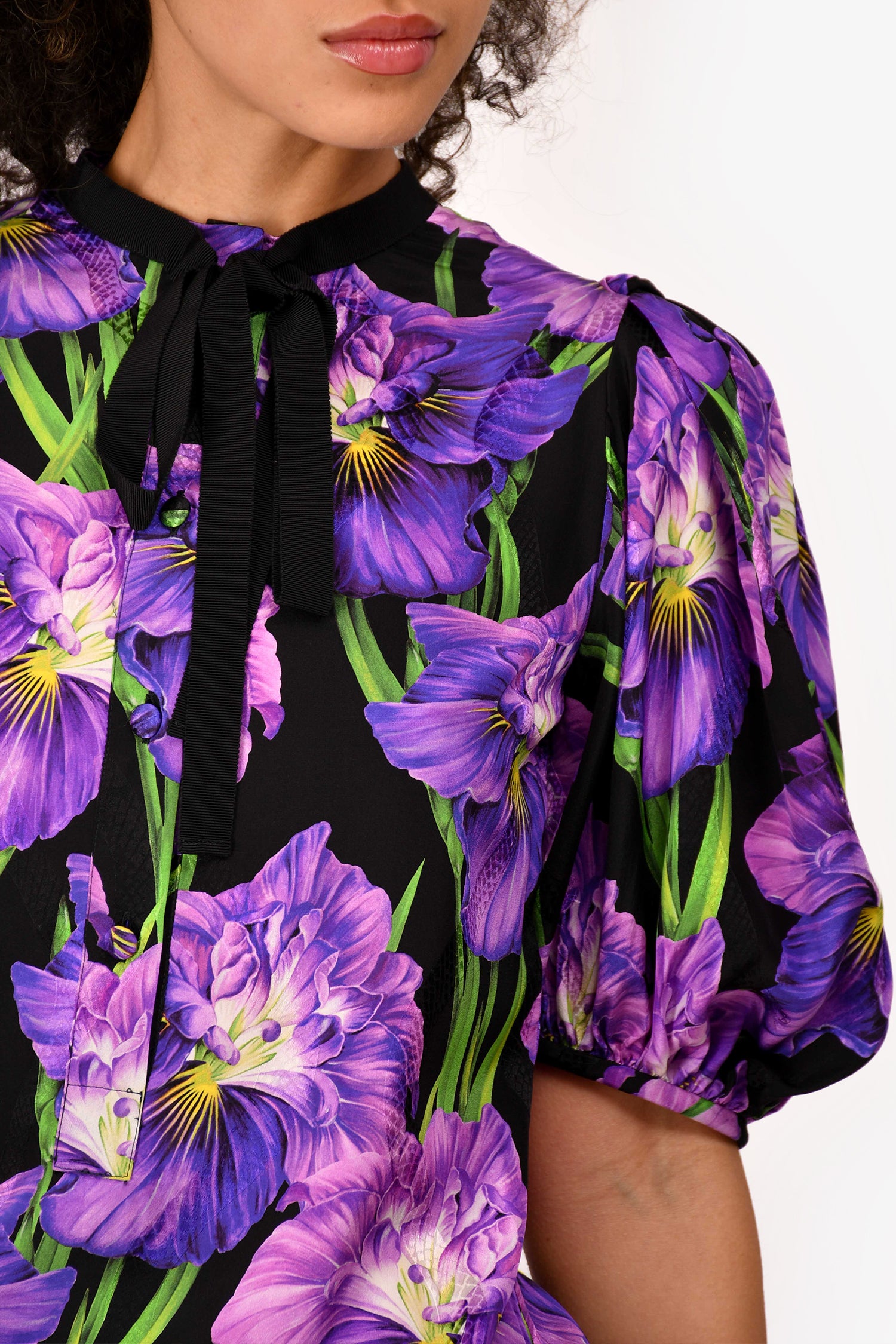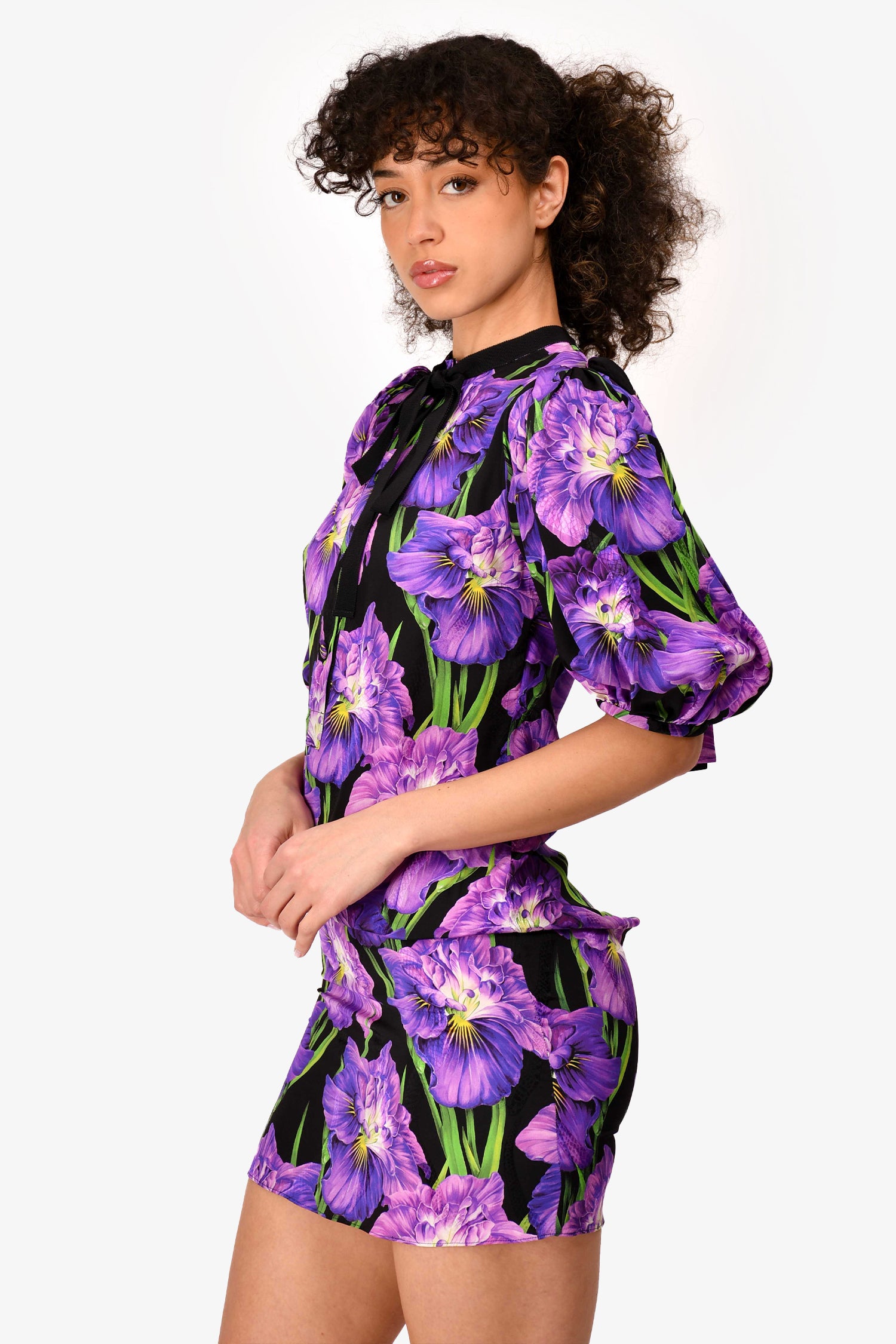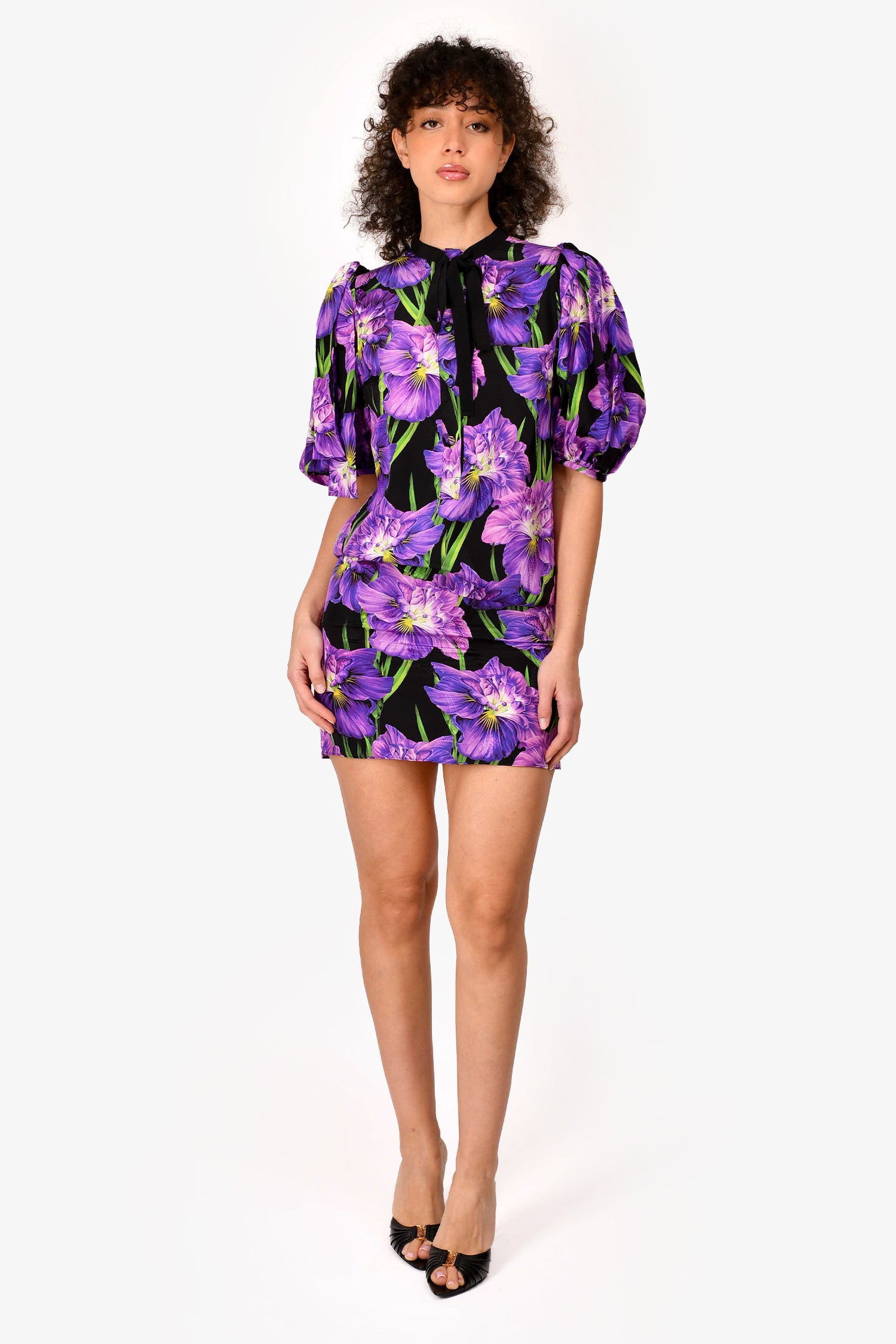 Refresh availabilityGucci 2016 Purple/Black Silk Floral Printed Short Sleeve Mini Dress. Back zip closure. Half front button-up closure. Black bow detail on the front. Button closure on the cuffs. Unlined. Silver-tone hardware. Tonal stitching.