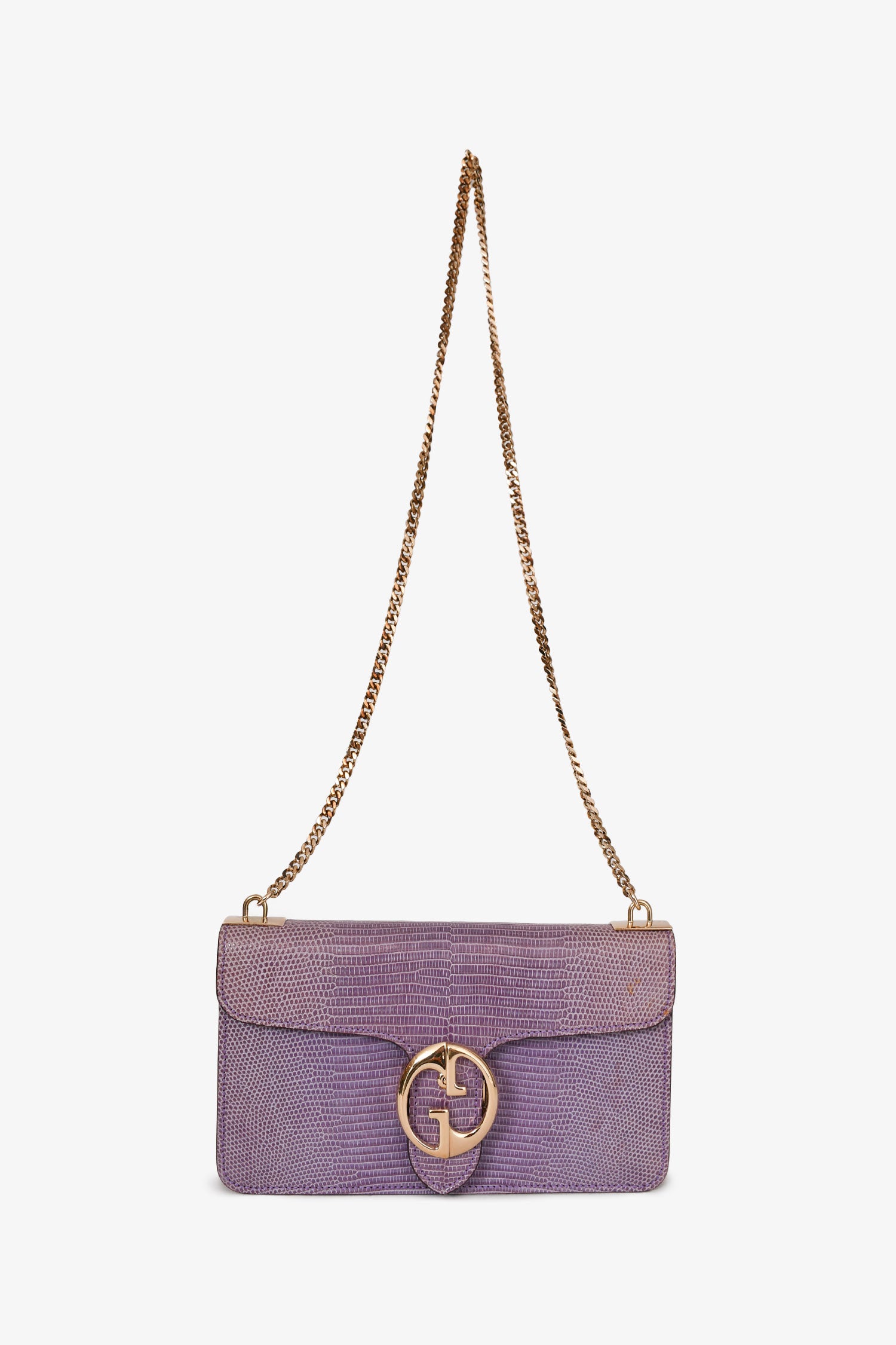Refresh availabilityGucci Purple Lizard Leather 1973 East West Chain Bag. Gold-tone hardware. Fold-over flap with a flip-lock closure. Chain-link shoulder strap. Lined leather interior with a zipped and slip compartment. Coated trimming. Tonal stitching.