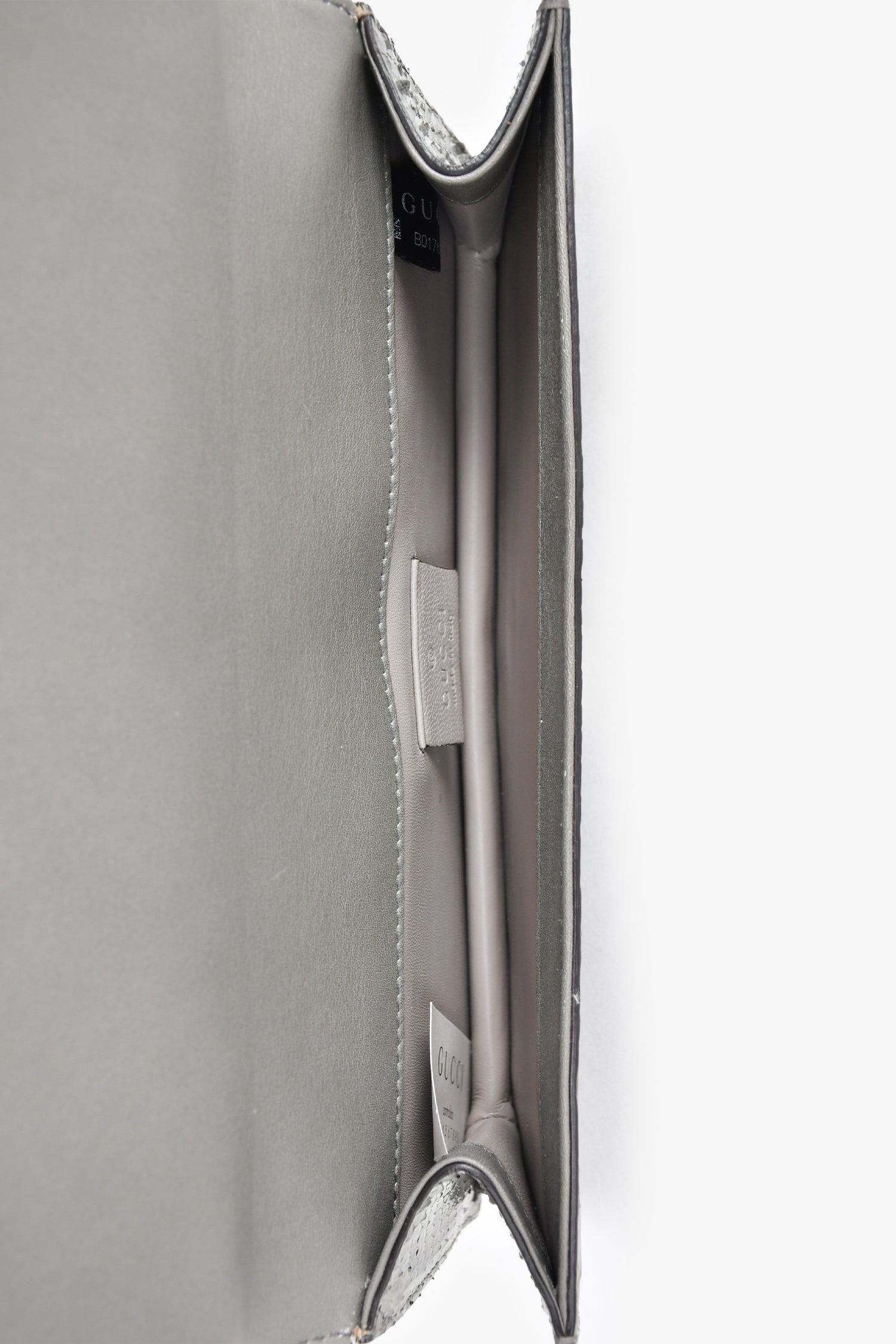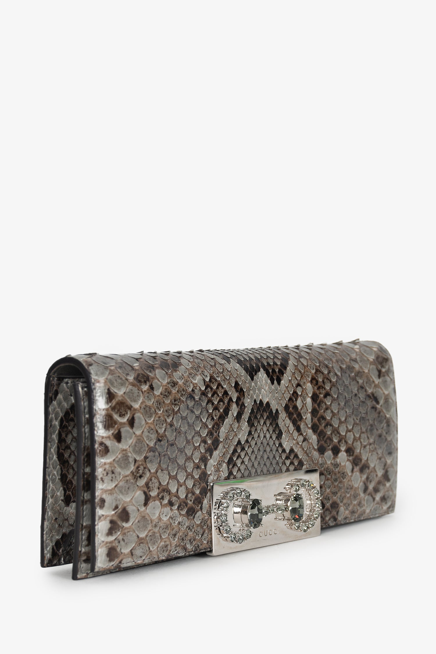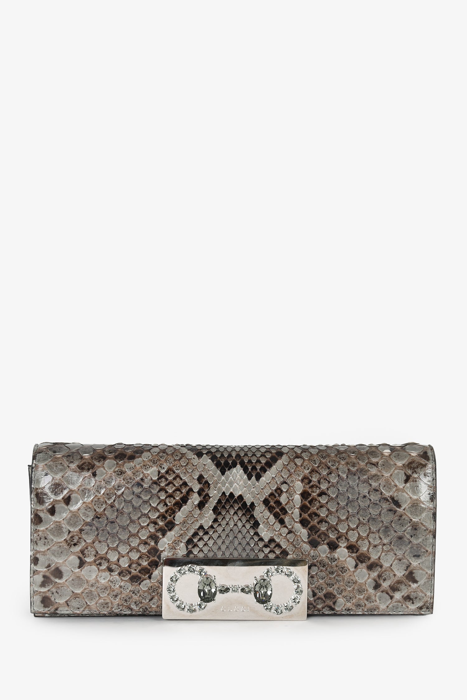 Refresh availabilityGucci Python Leather Crystal Horsebit Clutch. Magnet closure. Open compartment. Tonal stitching.