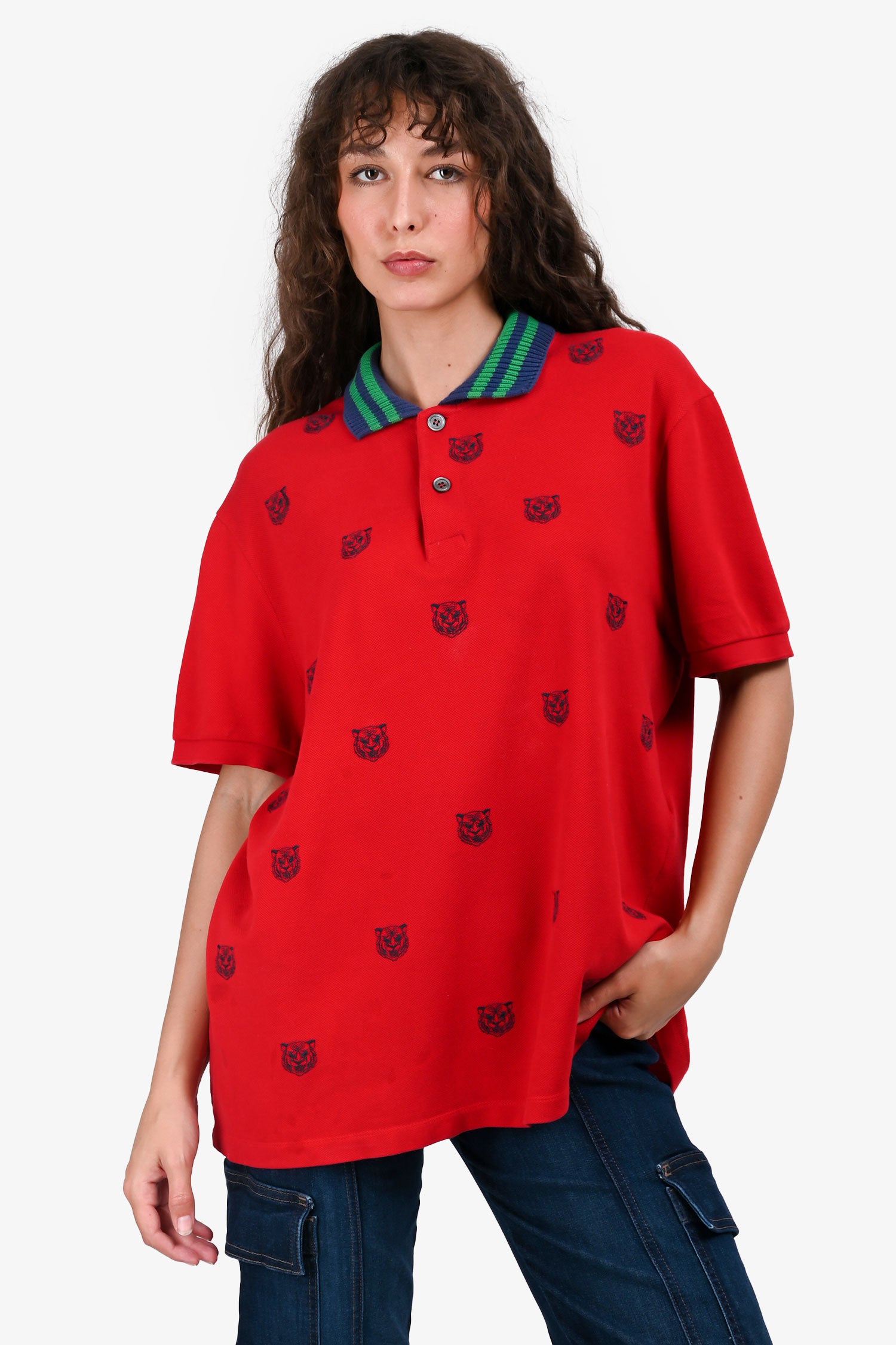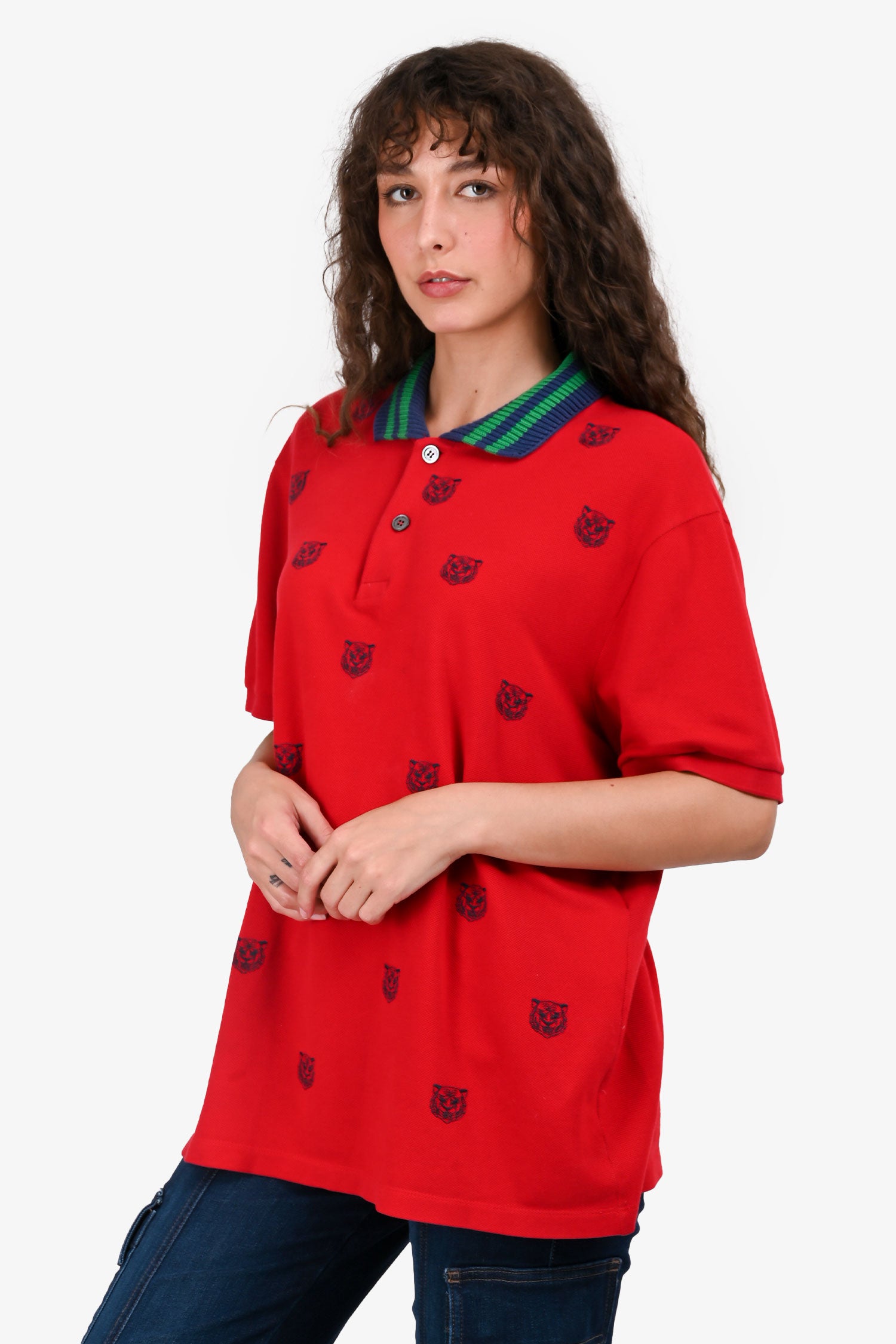 Gucci Red Blue/Green Lapel Tiger Print Short Sleeves Top Size XL Mens