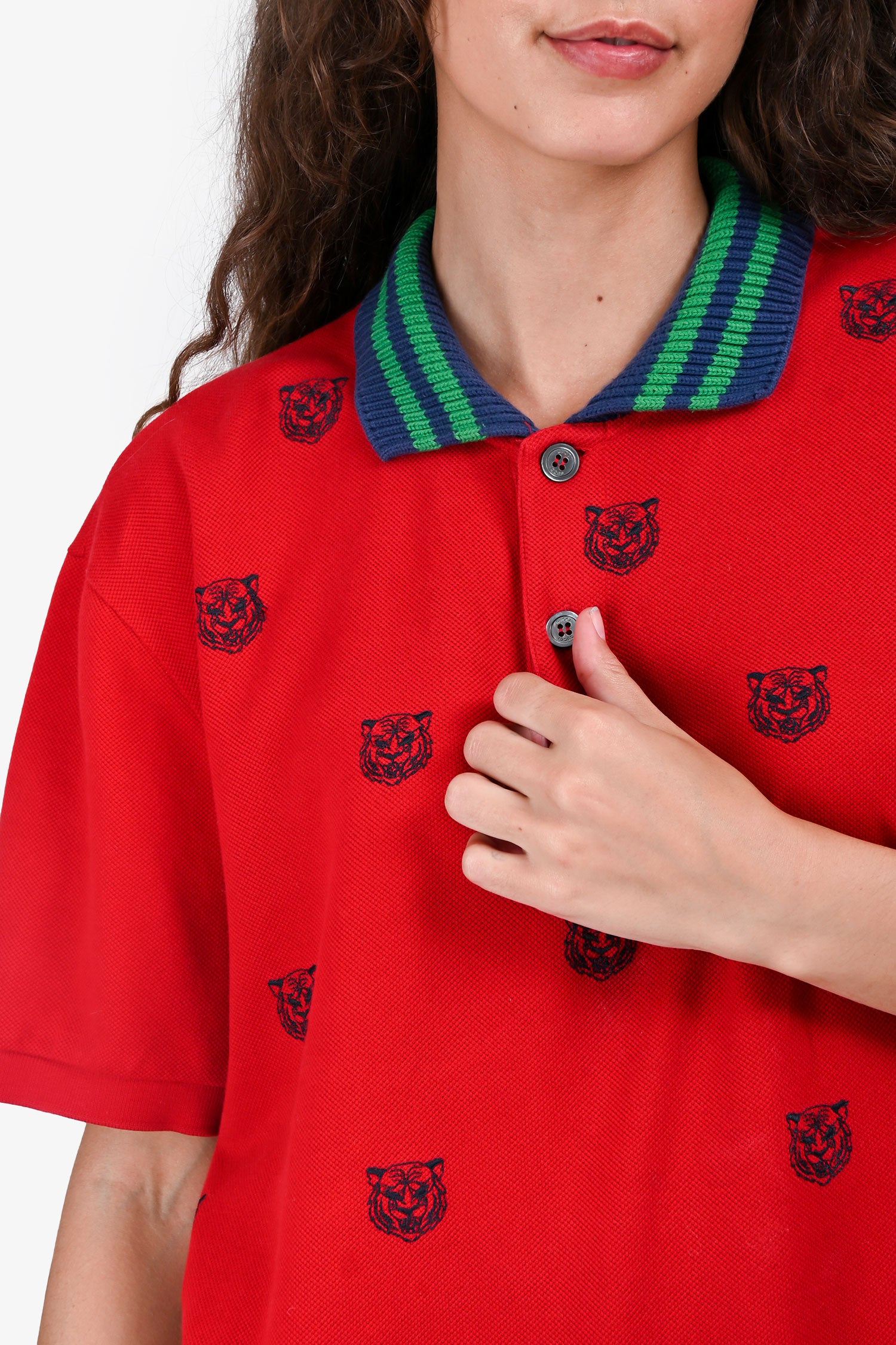Refresh availabilityGucci Red Blue/Green Lapel Tiger Print Short Sleeves Top. Classic collar. Short sleeves. Button front closure. Tonal stitching.