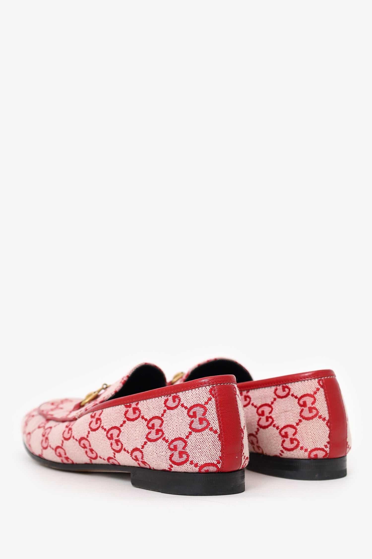 Refresh availabilityGucci Red Canvas GG Monogram Horsebit Womens Jordaan Loafers. Slip-on. Pointed-round toe. Gold-tone hardware. Tonal stitching.