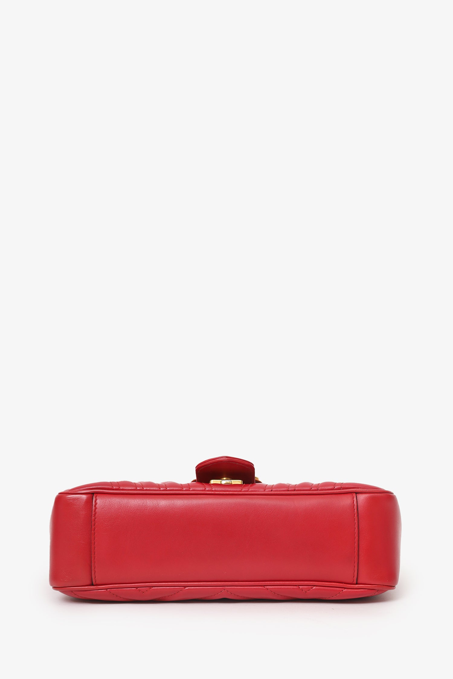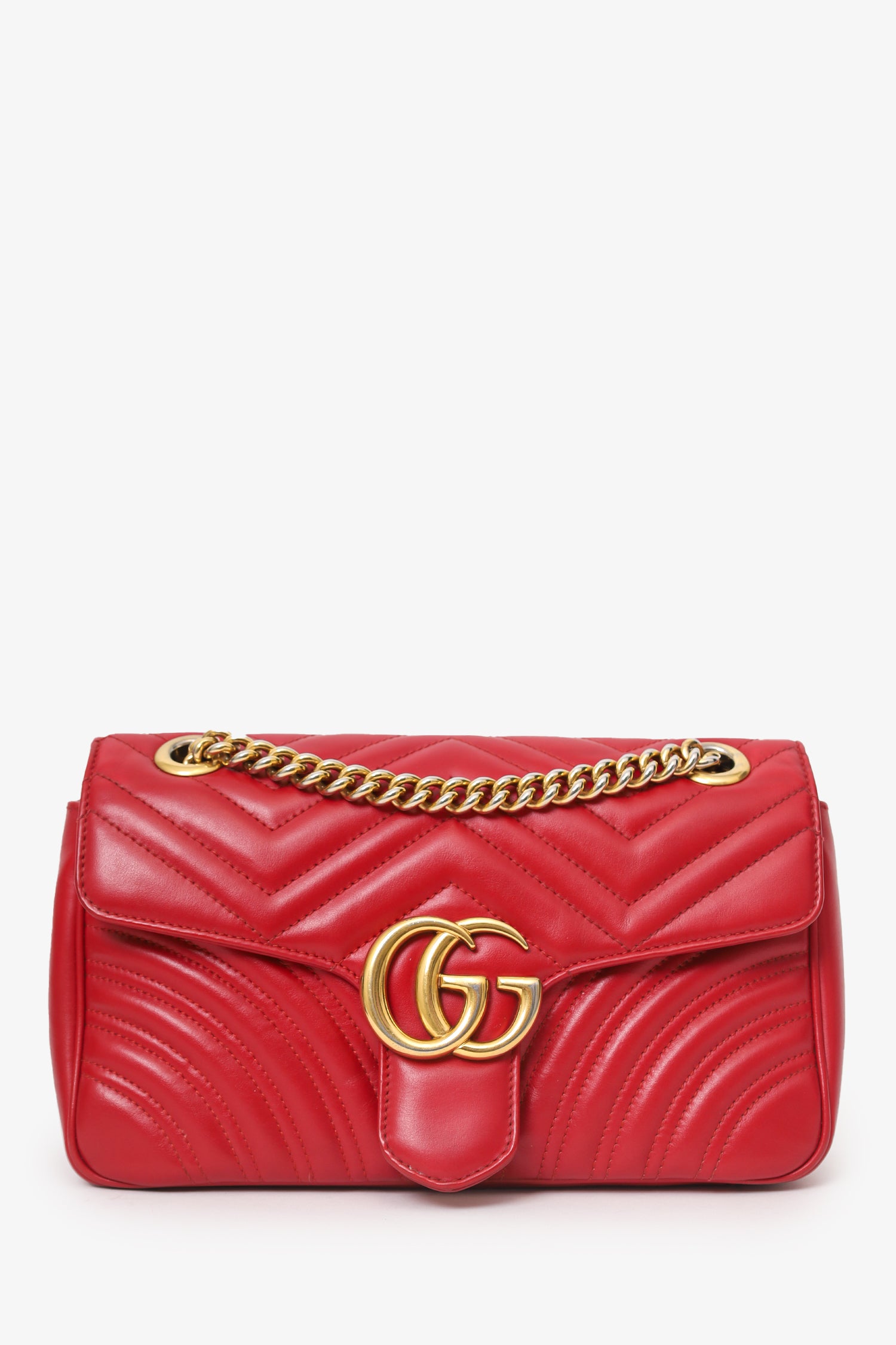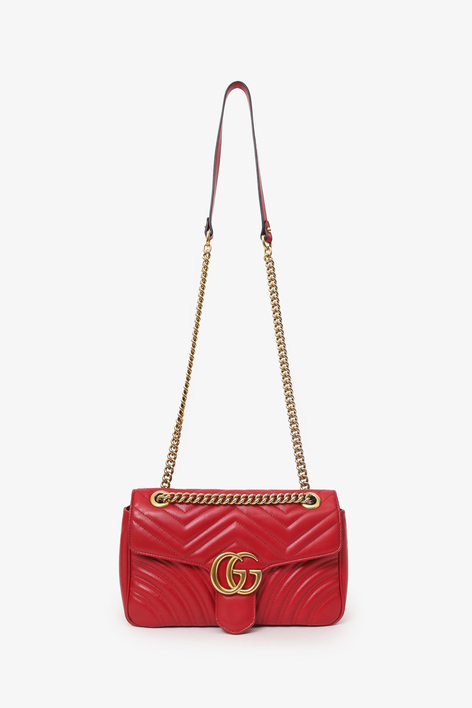 Refresh availabilityGucci Red Chevron Leather Medium Marmont Shoulder Bag. Front fold-over flap with snap-closure. Twin chainlink strap that can be pulled into one longer strap. Lined interior. Single interior zip-pocket. Tonal stitching. Gold-tone hardware.