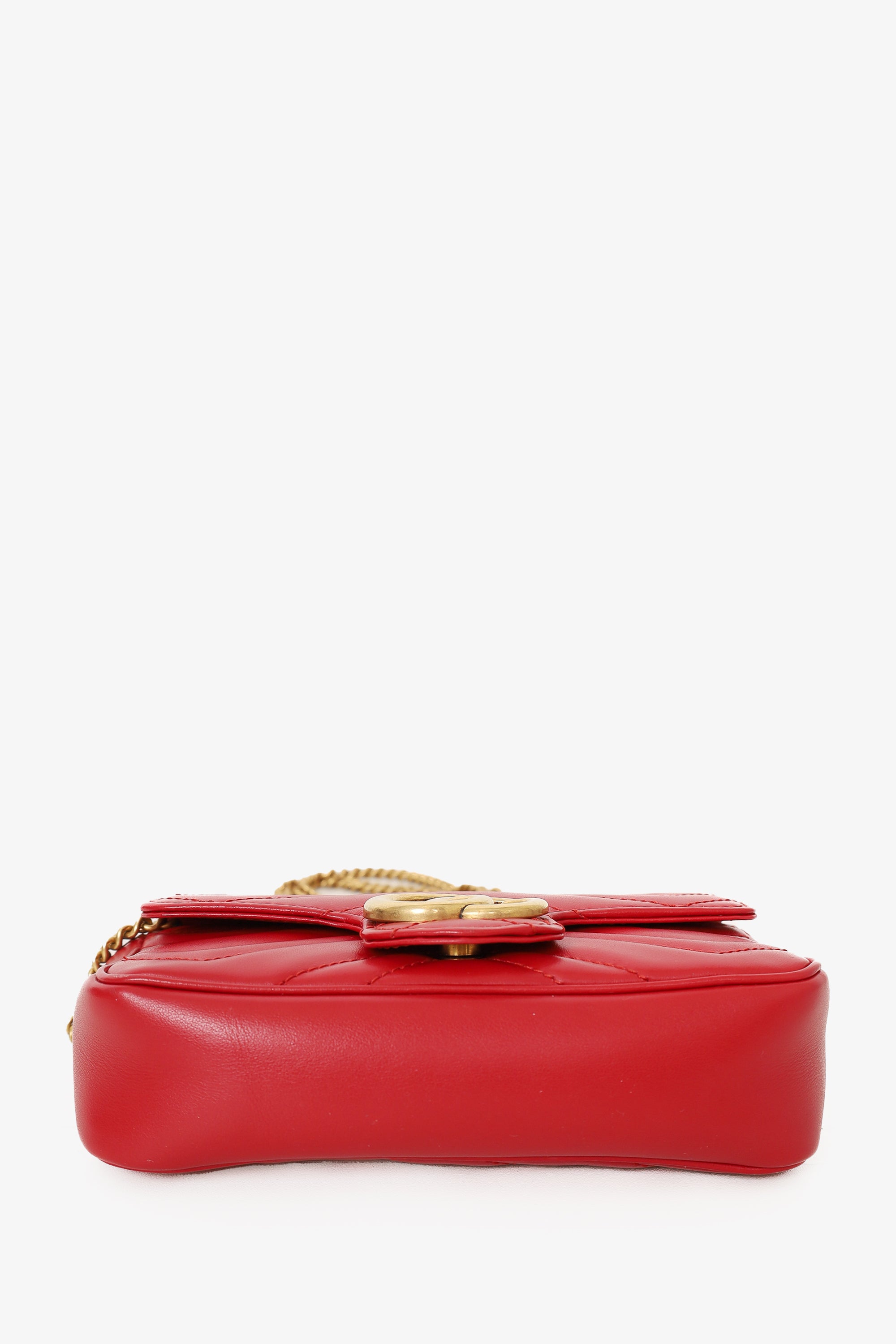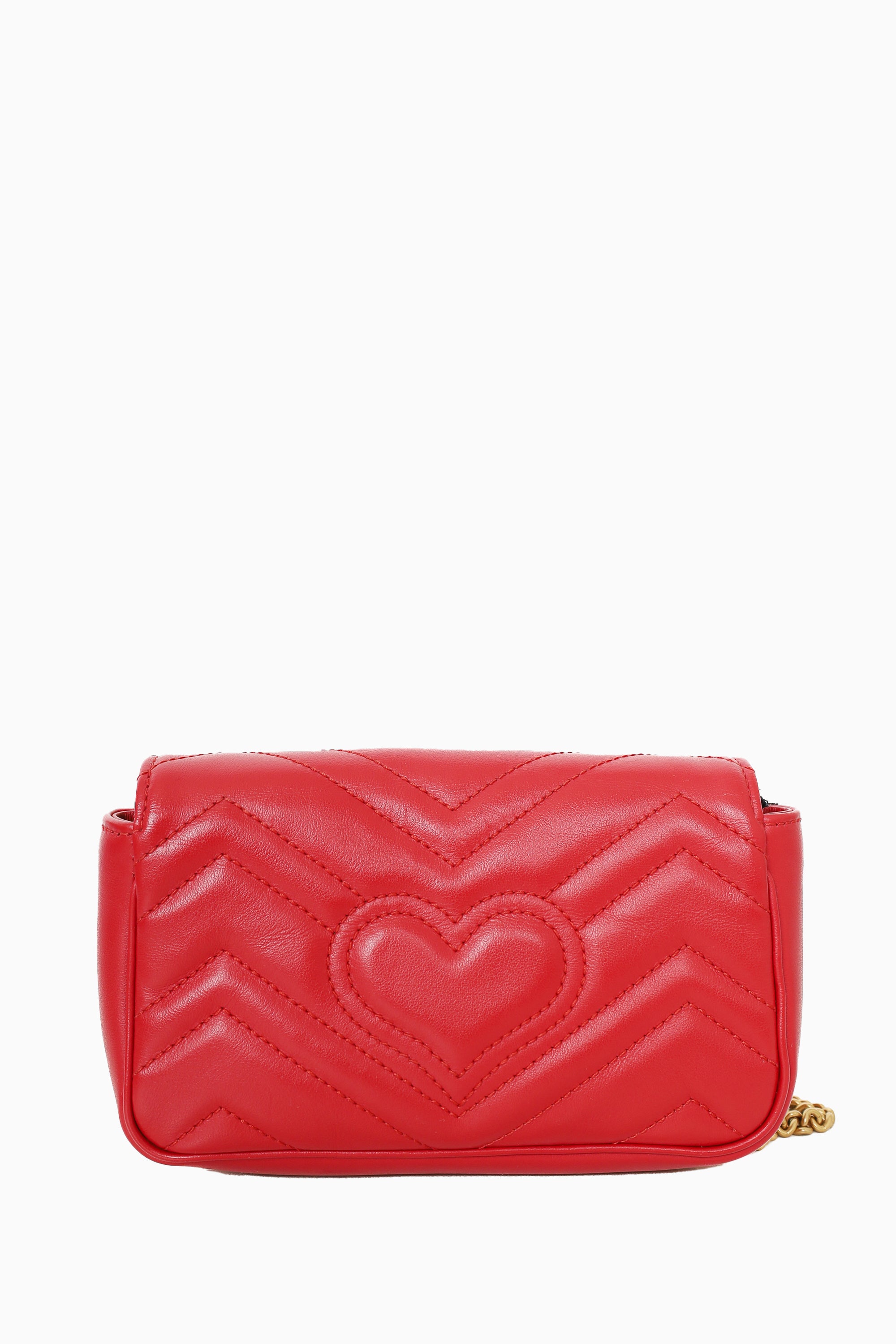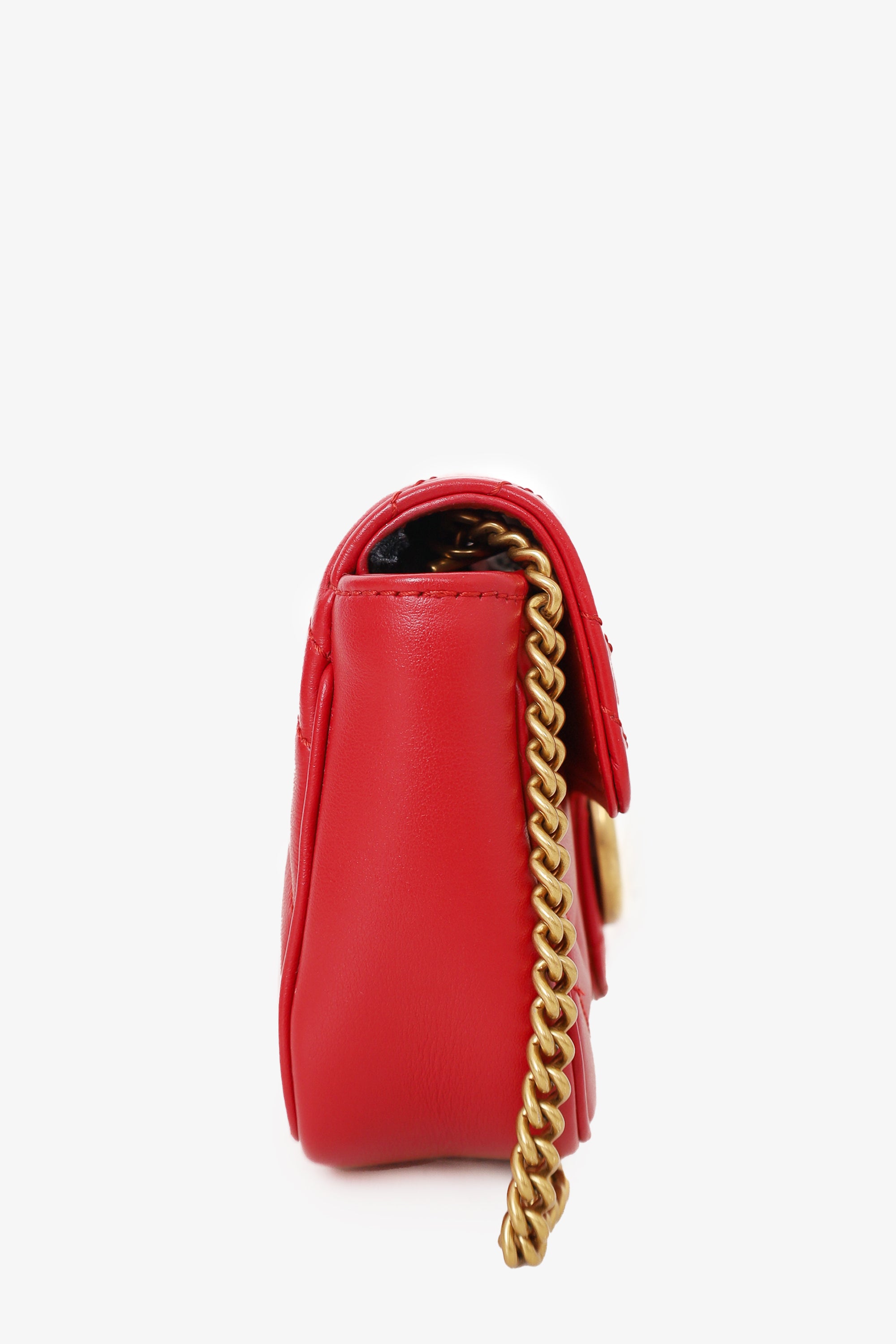 Refresh availabilityGucci Red Chevron Leather Super Mini Marmont Crossbody. Front fold-over flap with button closure. Gold-tone hardware. Tonal stitching. Includes interior chain with clip opening.